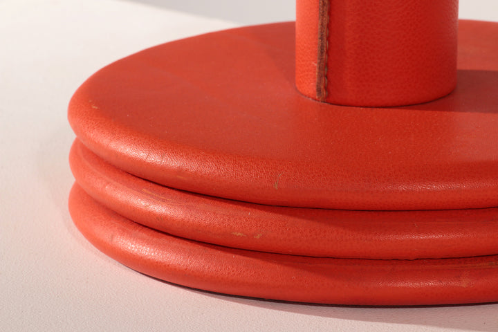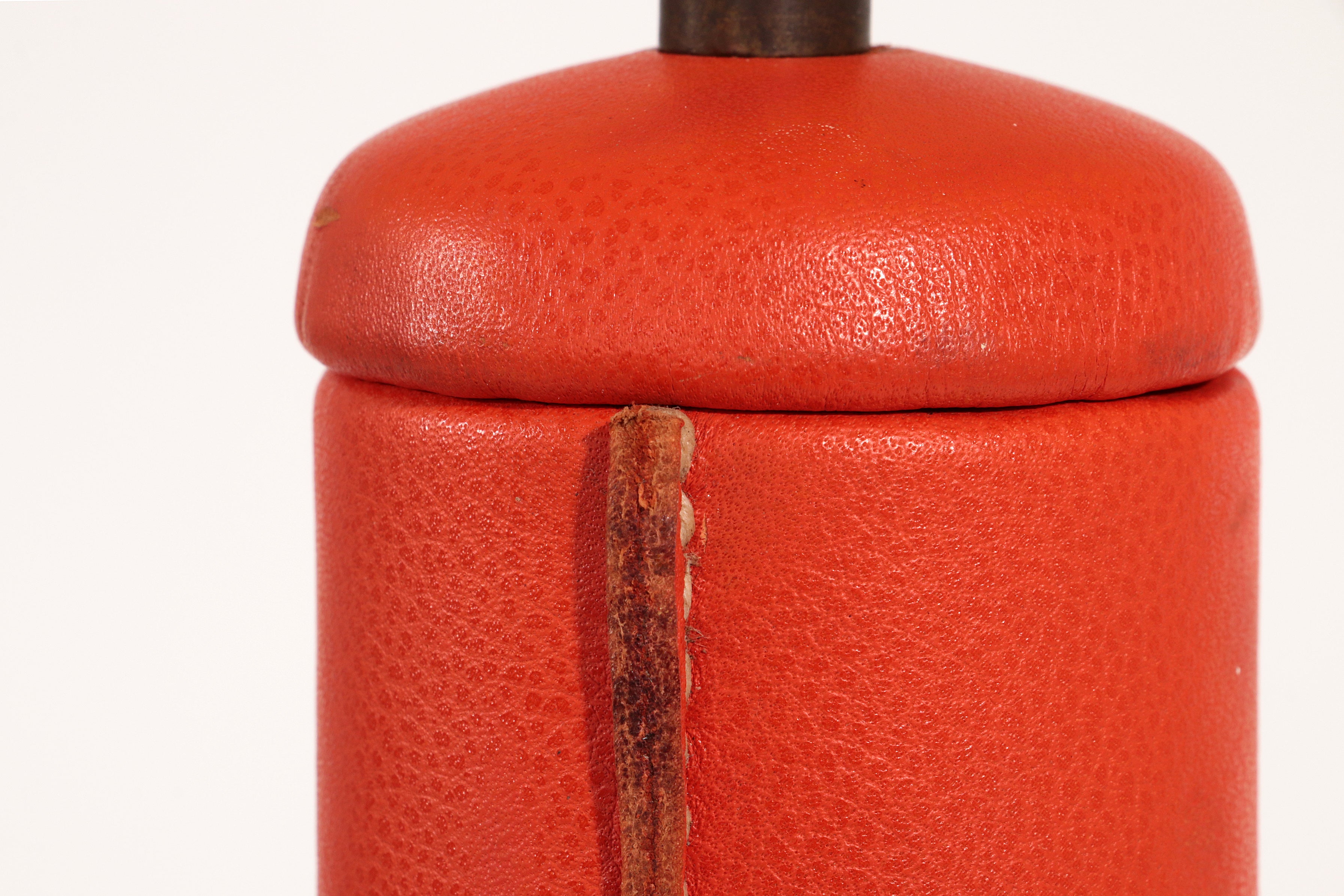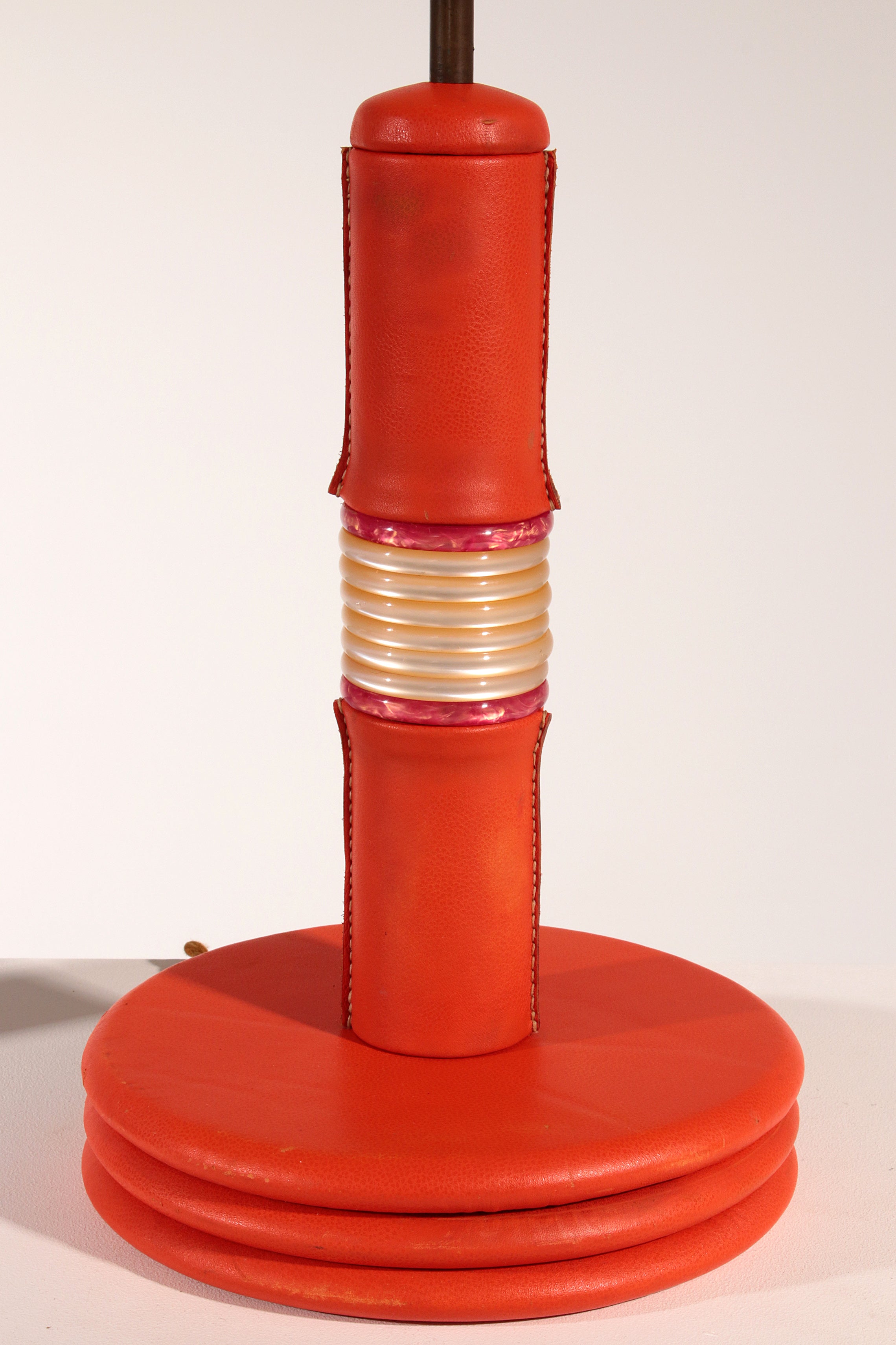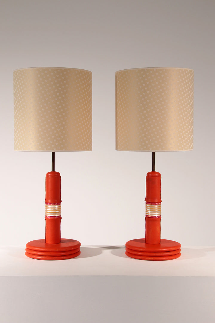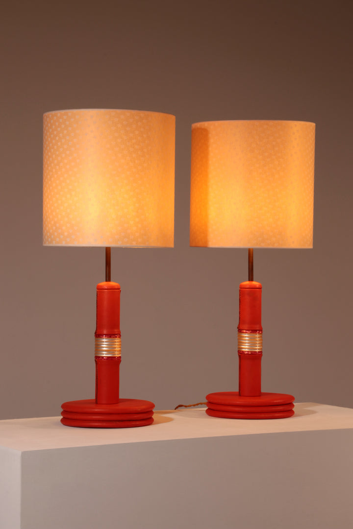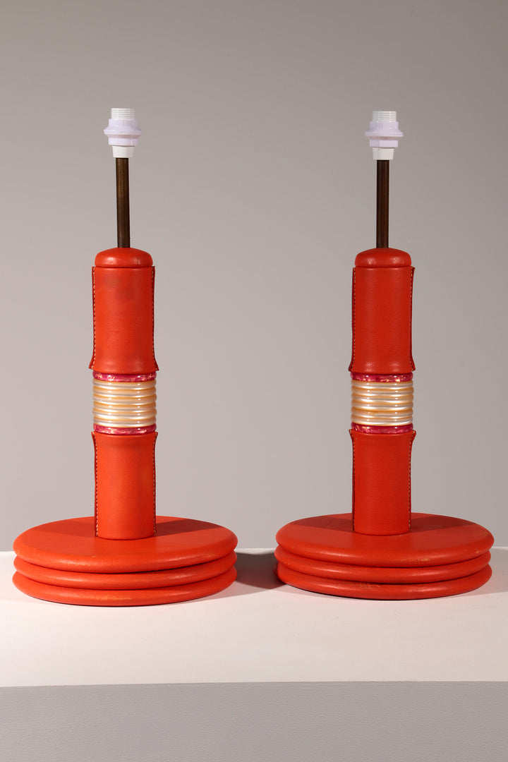 This exquisite set of two French lamp bases from the 1960s is a true statement piece, sure to catch the eye in any room with its vibrant color and unique leather upholstery. The craftsmanship is exceptional, featuring skillfully covered leather, a rare find in lamp design.