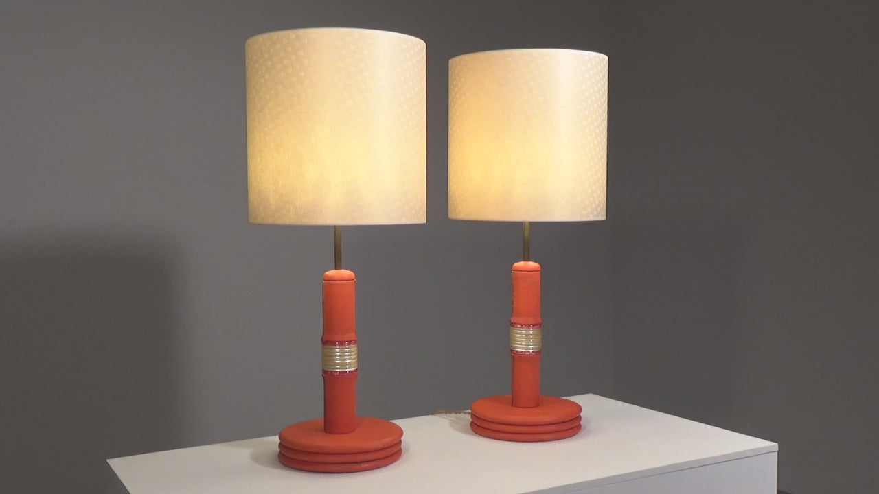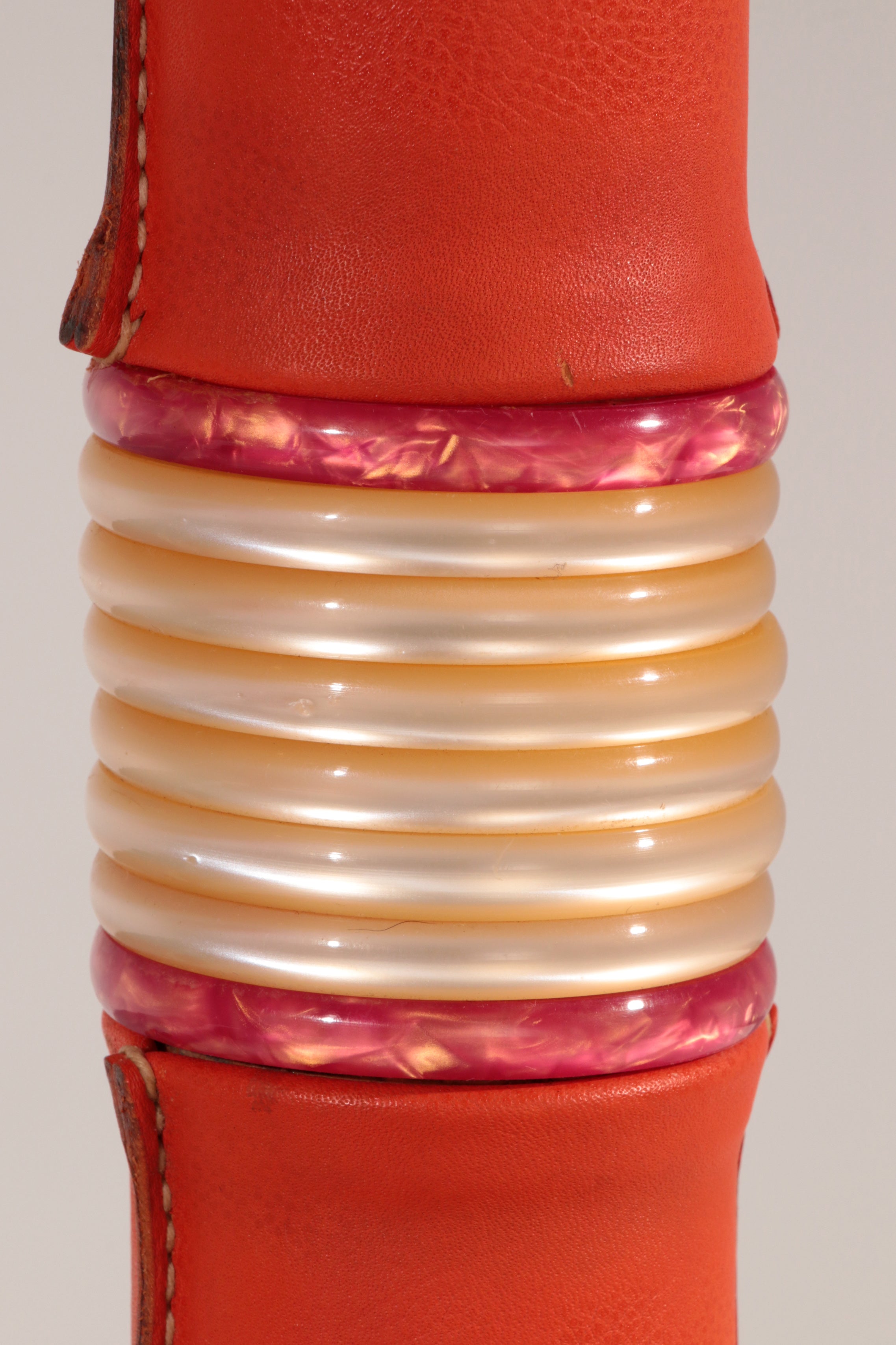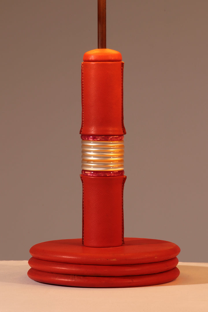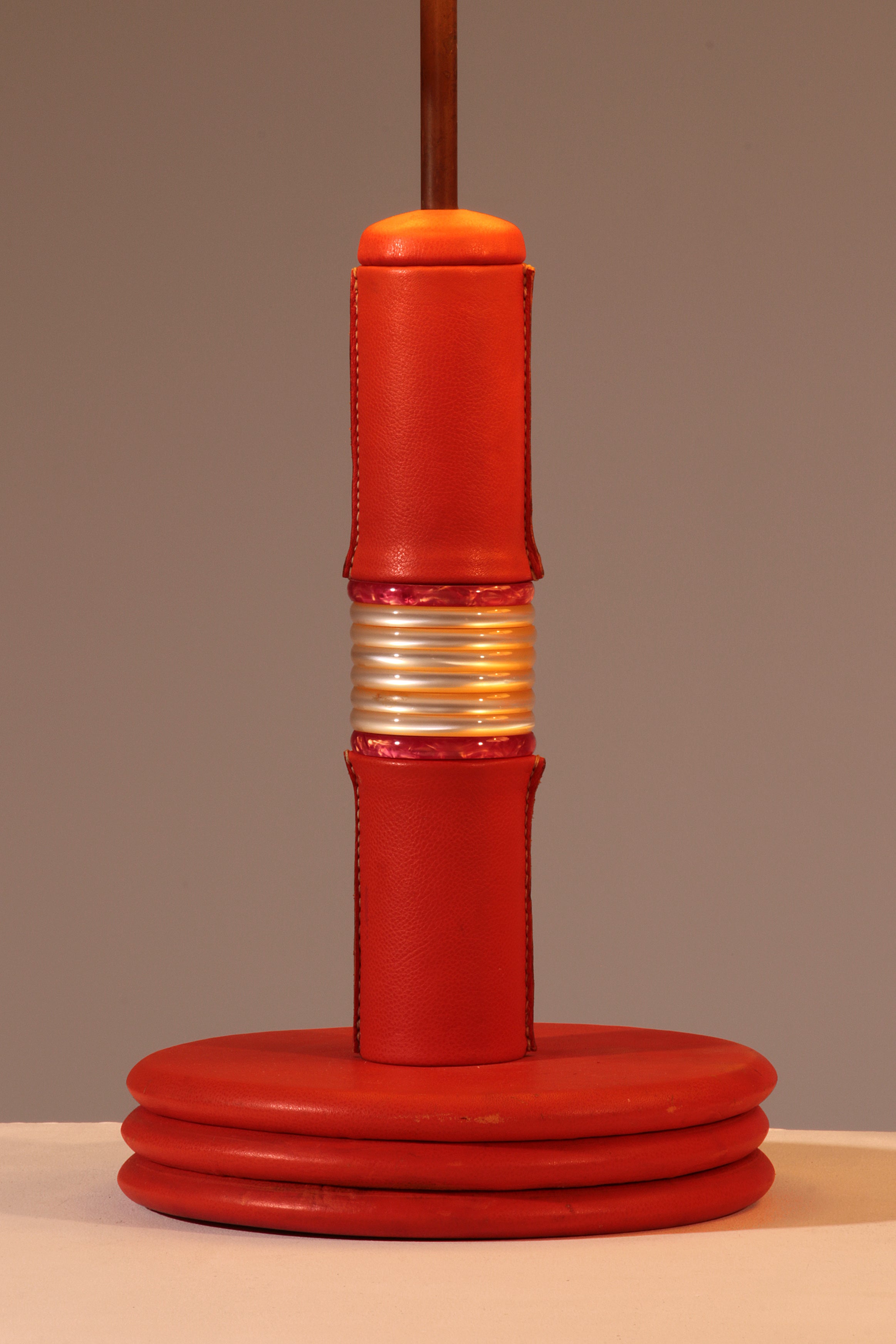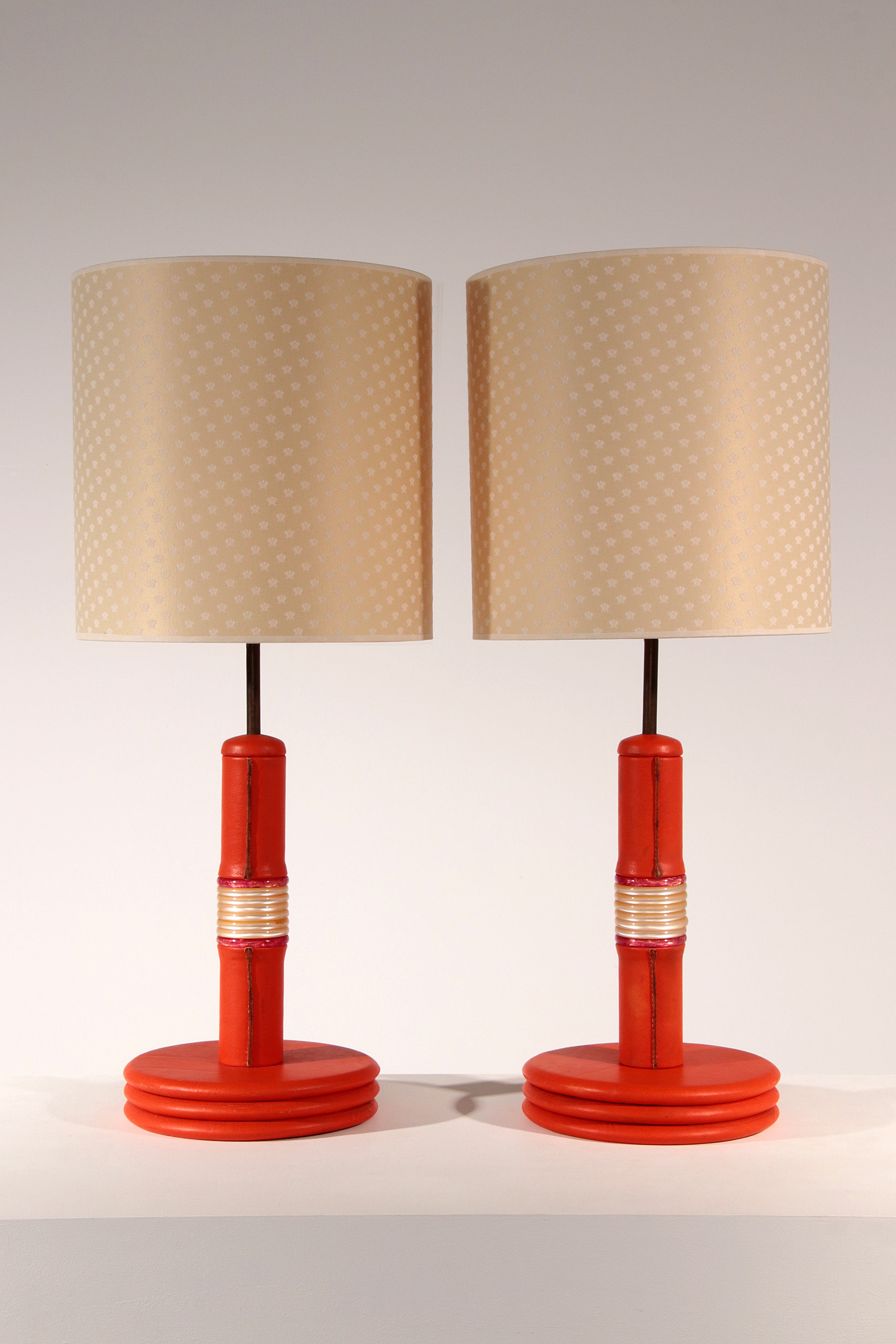 This exquisite set of two French lamp bases from the 1960s is a true statement piece, sure to catch the eye in any room with its vibrant color and unique leather upholstery. The craftsmanship is exceptional, featuring skillfully covered leather, a rare find in lamp design.