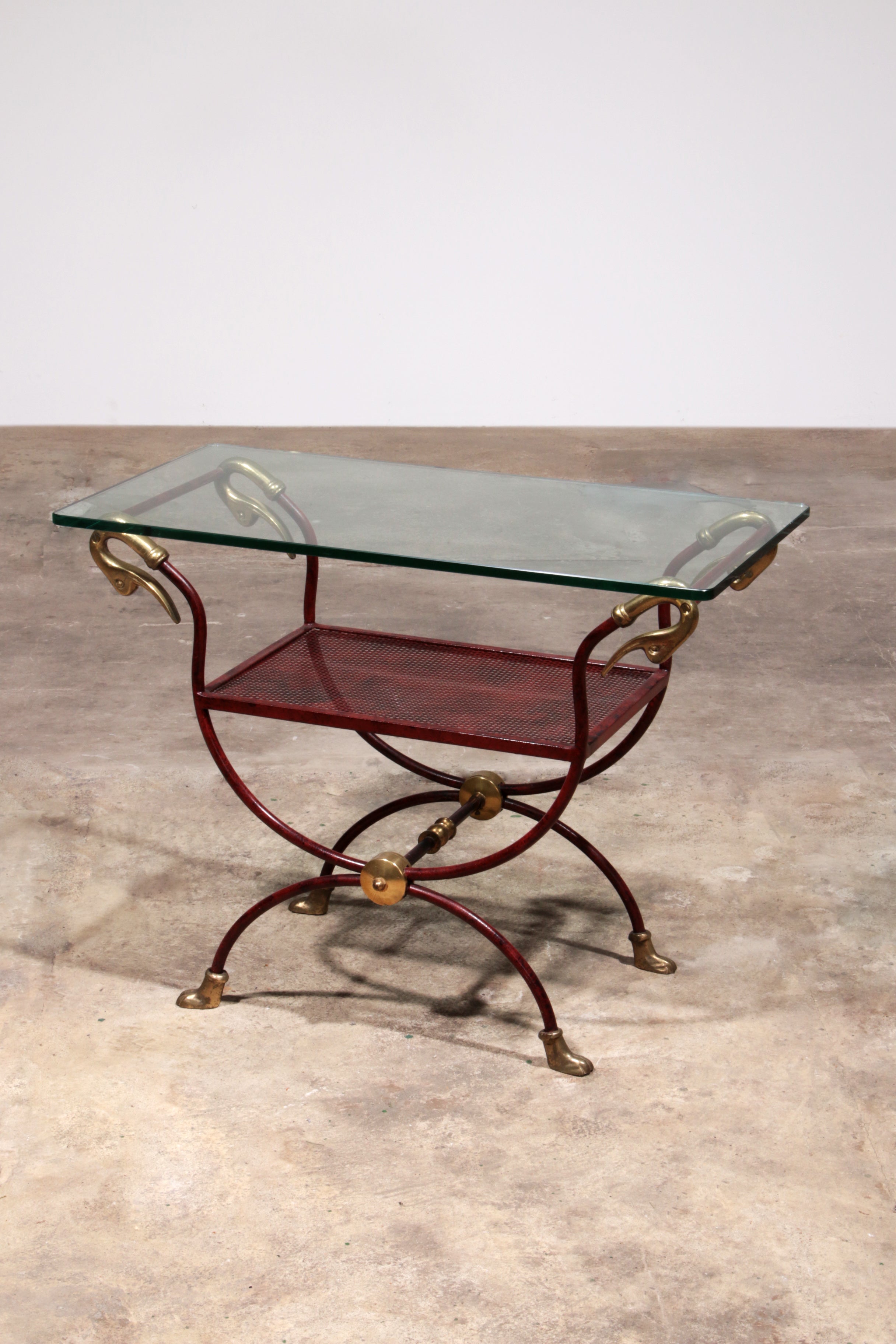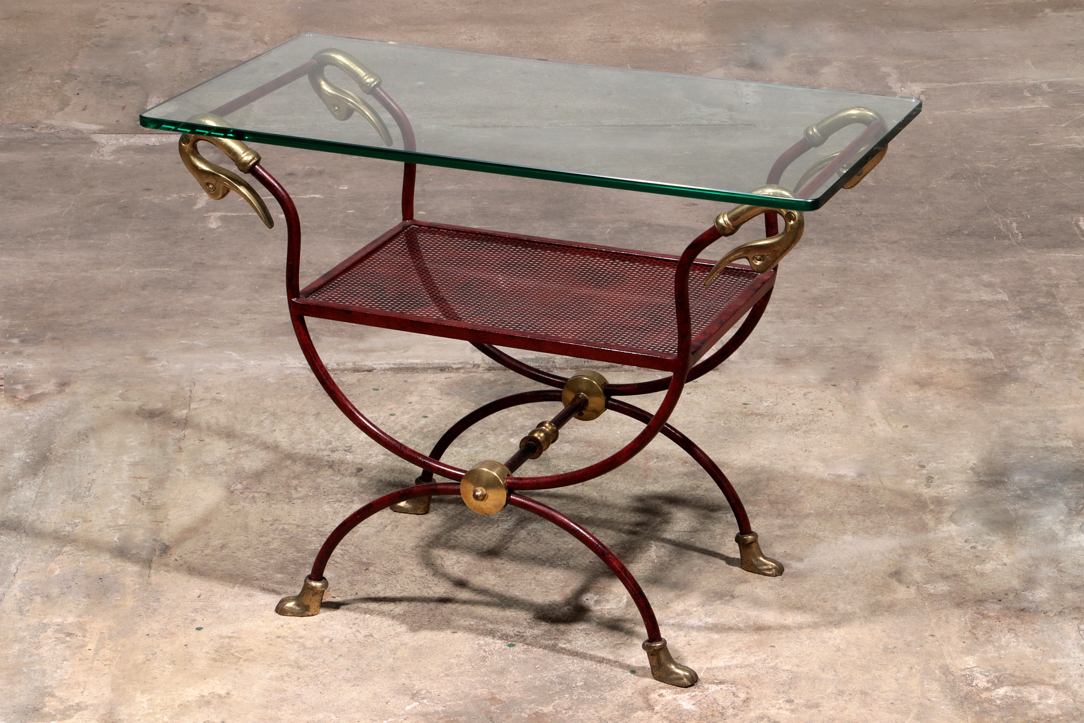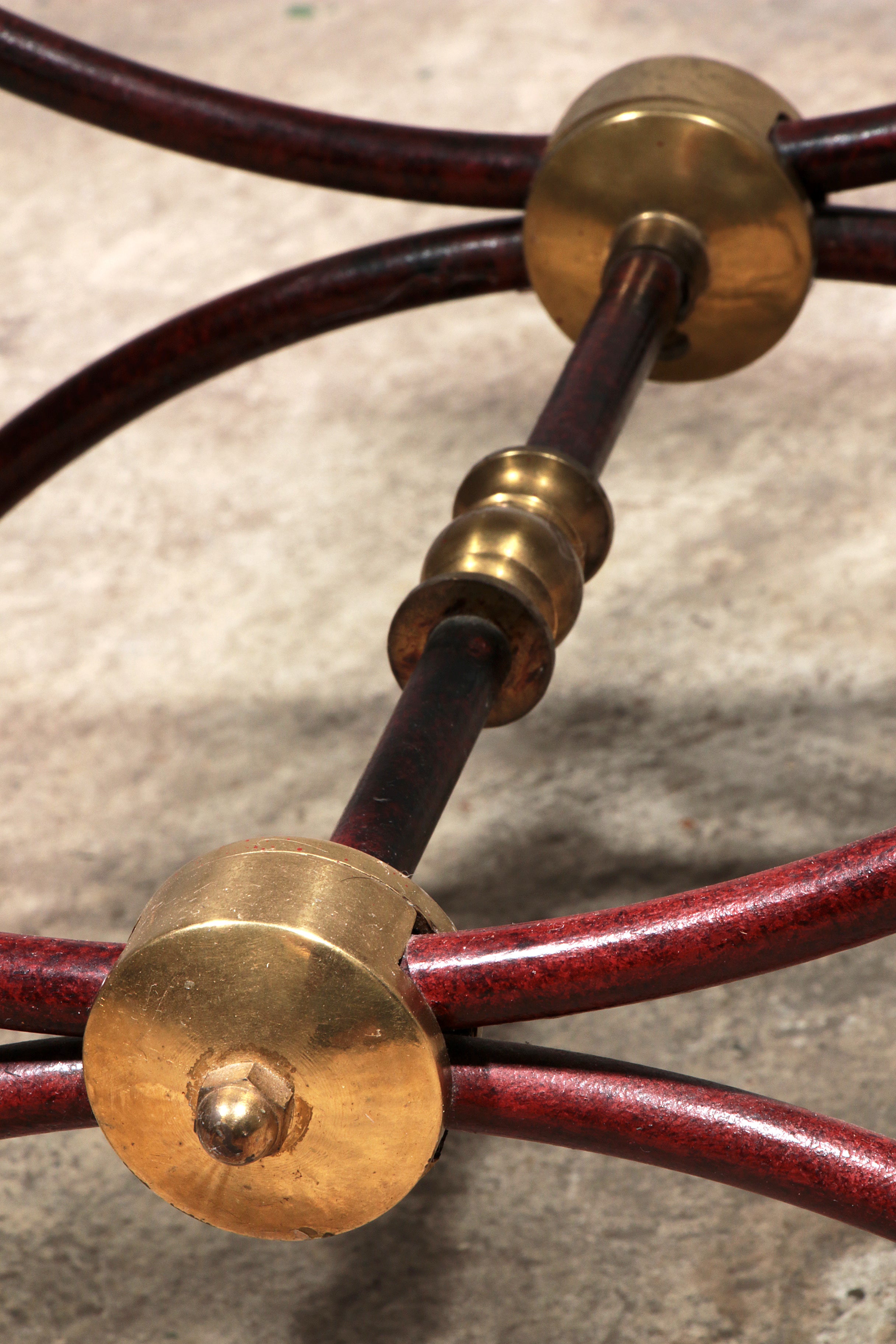 This exquisite Neo-Classical Swan Neck Curule Chair, attributed to the renowned Maison Jansen, is a stunning addition to any outdoor setting or poolside area. Crafted from Bordeaux lacquered metal, it features elegant brass details that exude sophistication and timeless charm. The chair stands gracefully on four brass legs, with swan necks connected by metal rods serving as armrests, offering both style and comfort. The perforated metal seat adds a touch of decorative flair, making this chair not just a piece of furniture, but a work of art.