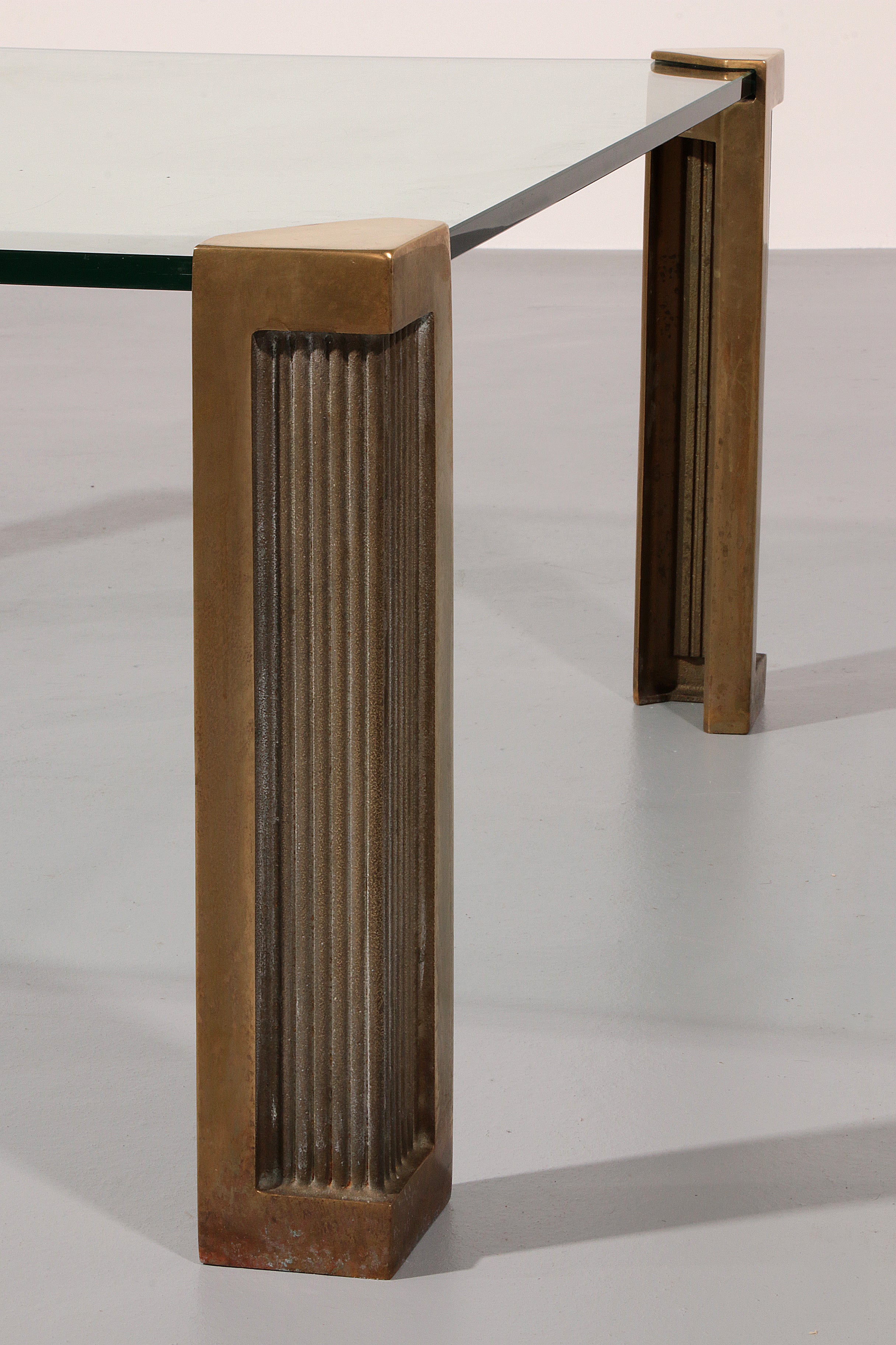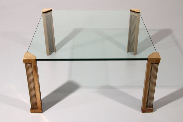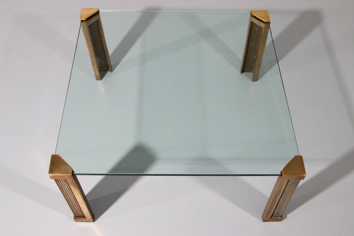 Discover the timeless elegance of the Glass Coffee Table designed by Peter Ghyczy, model T14. This beautiful 1970s coffee table combines craftsmanship and style. The table has original legs of bronze and brass, which provide a sturdy and durable construction. The glass top is 15 mm thick and free of damage, which contributes to the high-quality look of this piece of furniture.