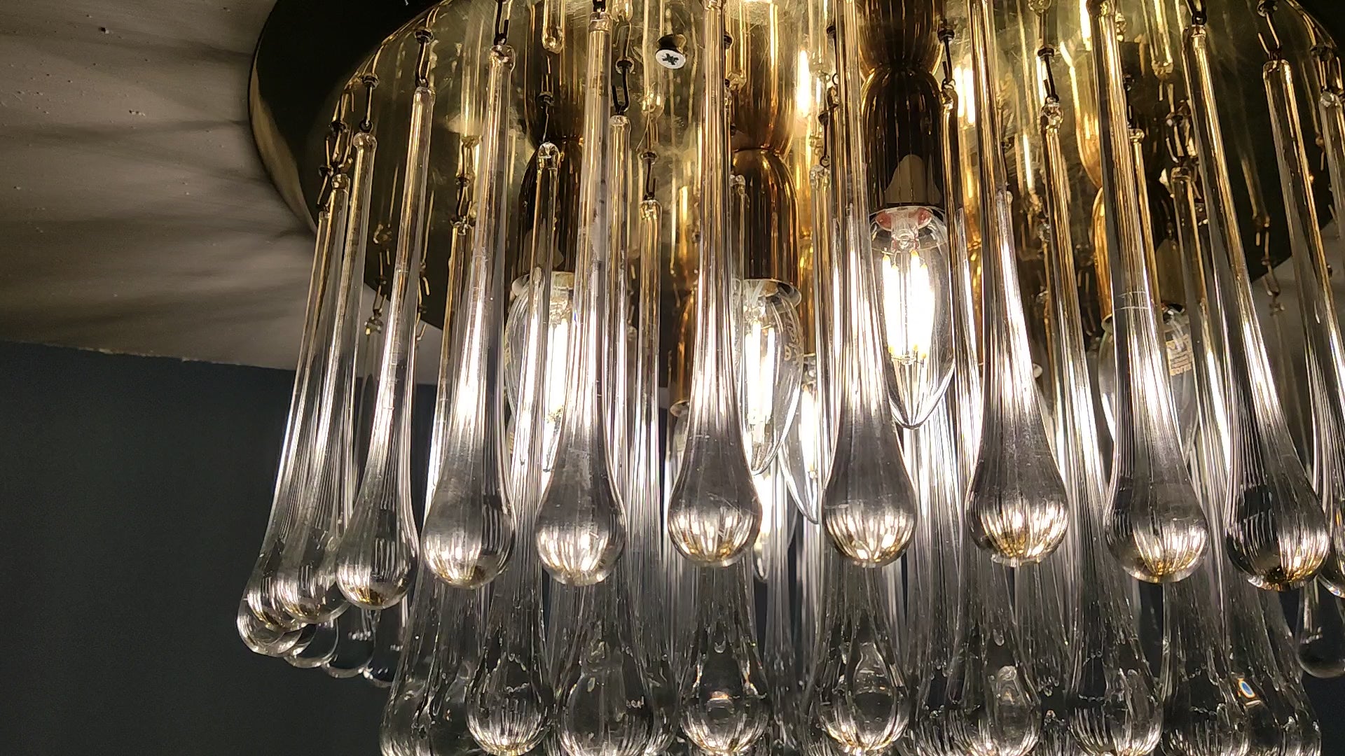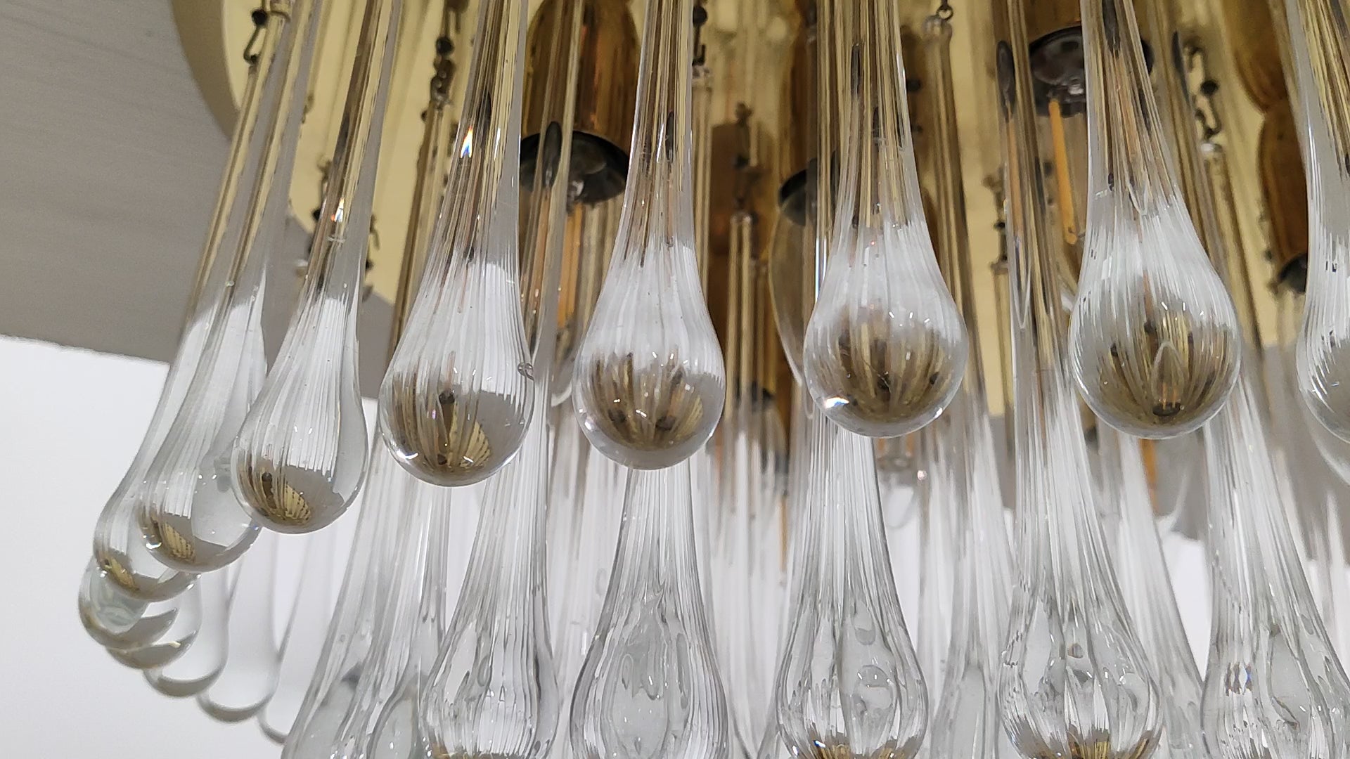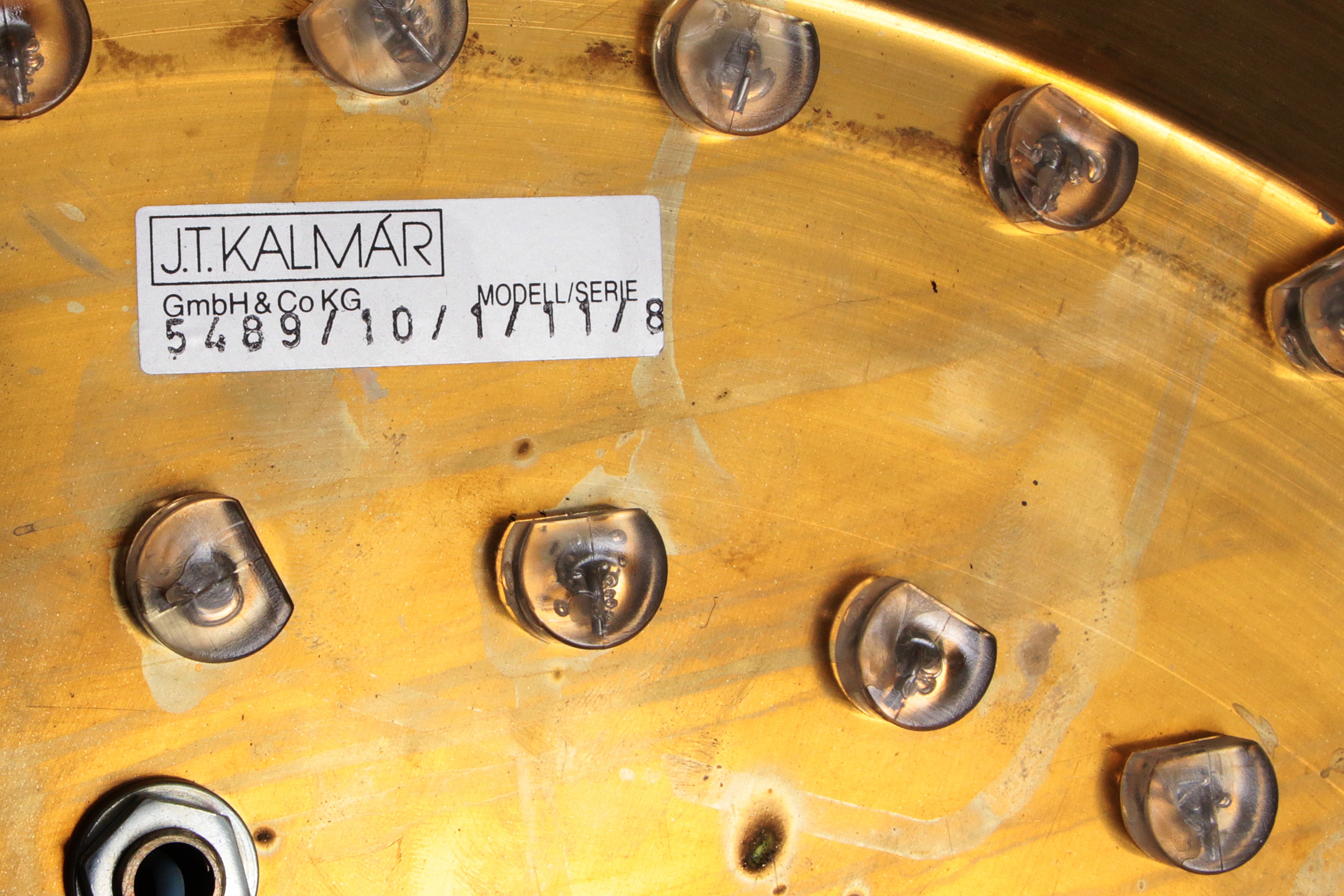 Illuminate your space with the exquisite Vintage J.T. Kalmar Murano Glass Chandelier, a masterpiece from the 1970s. Handcrafted in Austria, this stunning ceiling light features influences from renowned Murano glasswork in Italy. The chandelier is adorned with 54 hand-made crystal glass droplets, each uniquely shaped to reflect light beautifully. Its gold-plated structure enhances the luxurious appeal, making it a perfect centerpiece for any room. With a diameter of 45 cm and a total weight of approximately 25 kg, this chandelier is both substantial and elegant. It includes 10 LED bulbs, ensuring energy efficiency and a warm, inviting glow.