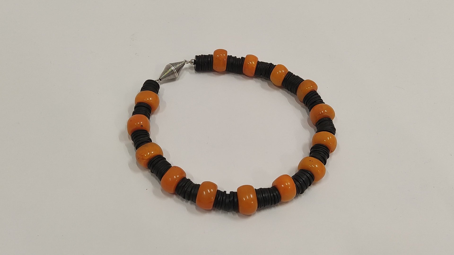 This unique amber necklace is a perfect statement piece for anyone looking for something special. The necklace is crafted with beautiful, regular pieces of amber in a vibrant orange hue, interspersed with round leather accents, creating a stunning contrast. The elegant silver magnetic clasp makes it easy to wear, providing both style and functionality. Over time, the necklace has developed a beautiful patina, enhancing its charm and giving it a distinct vintage feel. At 50 cm in length, this necklace is the ideal accessory for those seeking a unique and timeless piece to complement their style.
