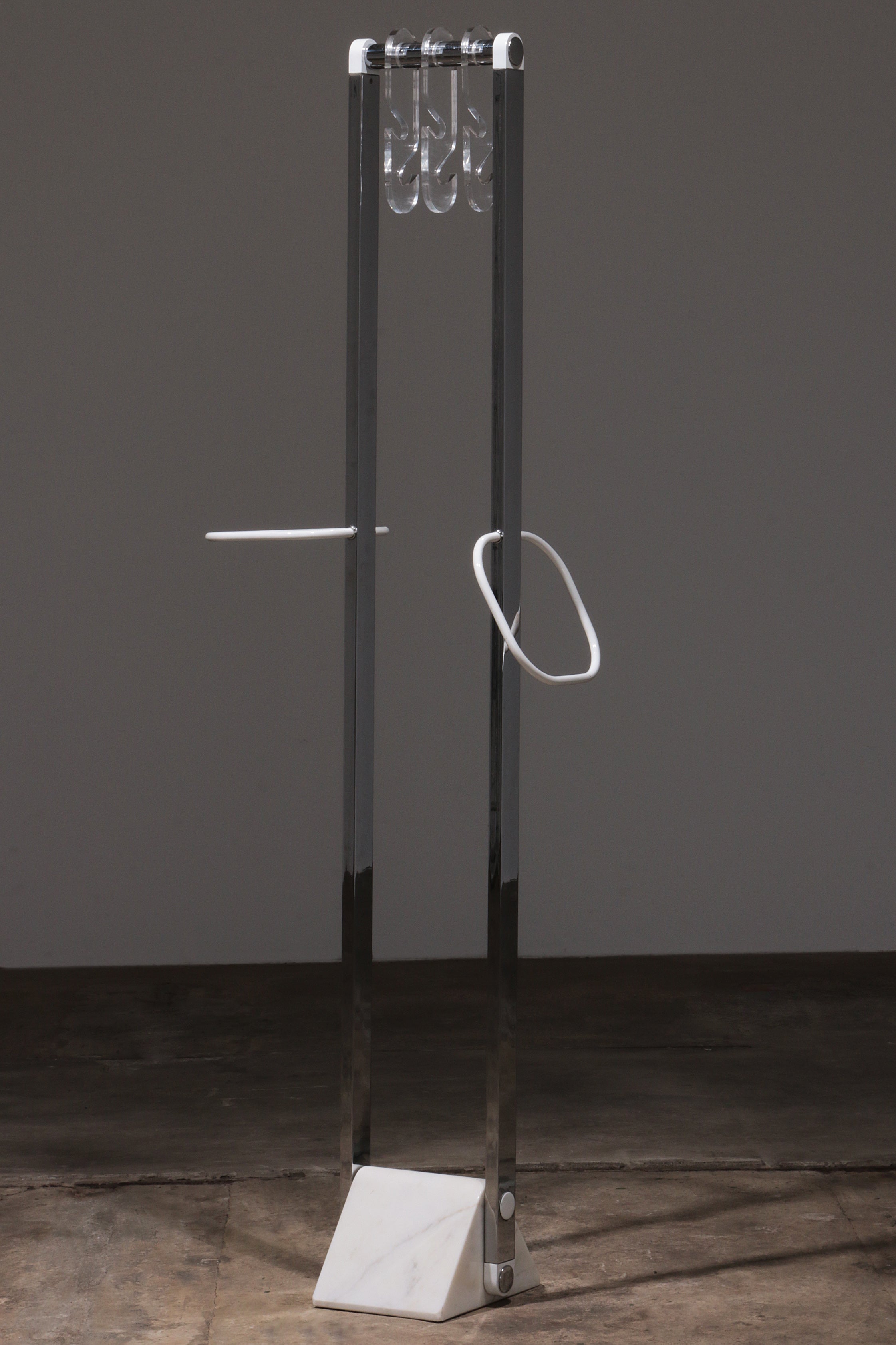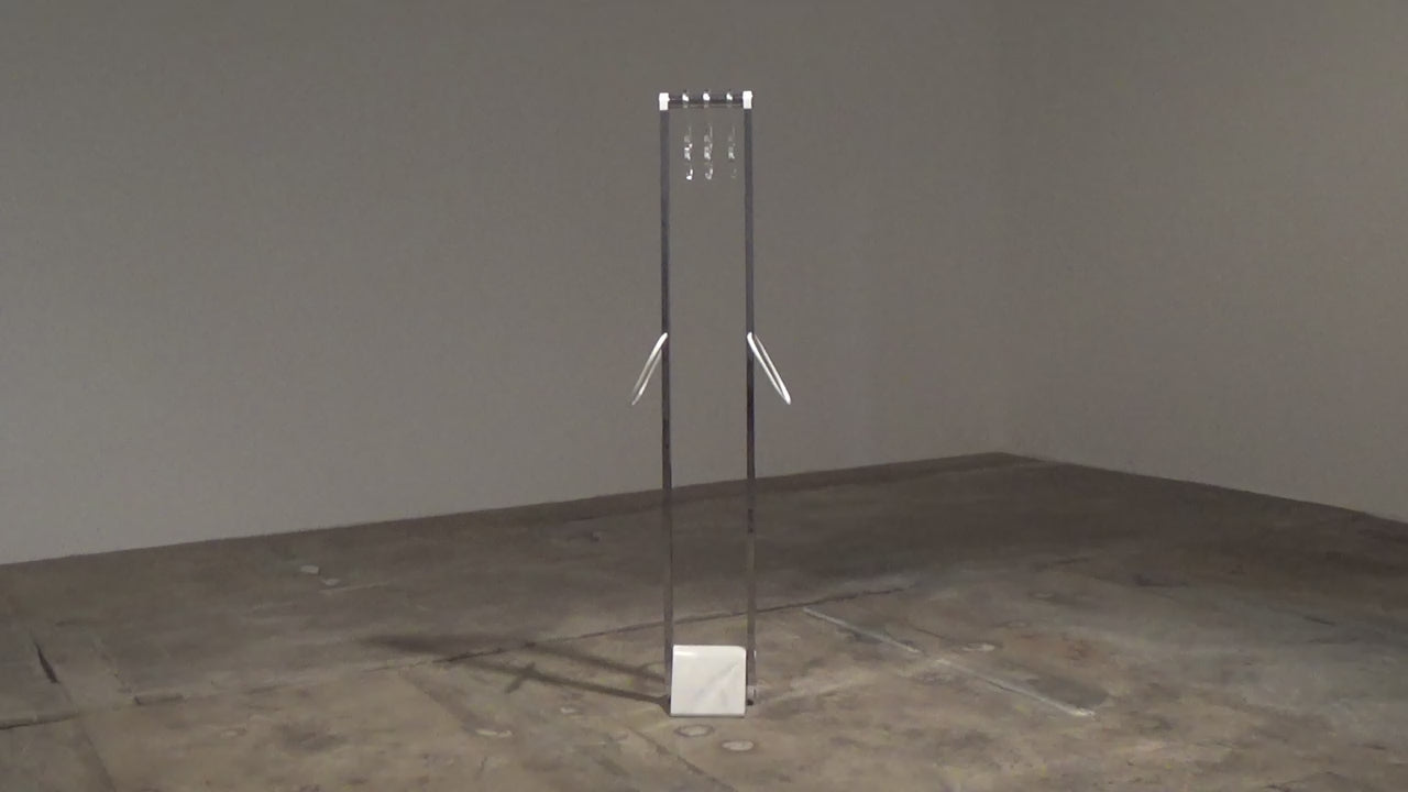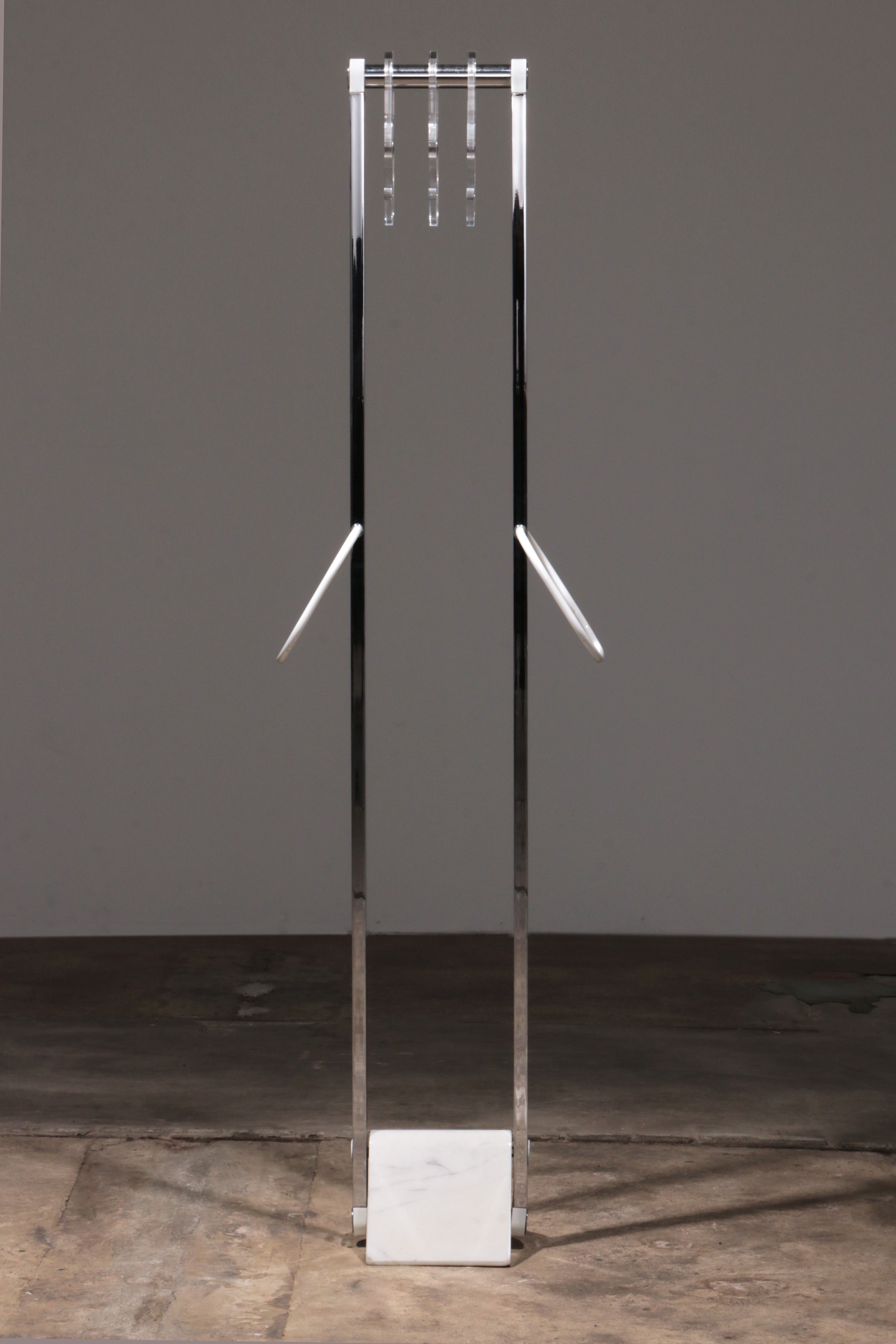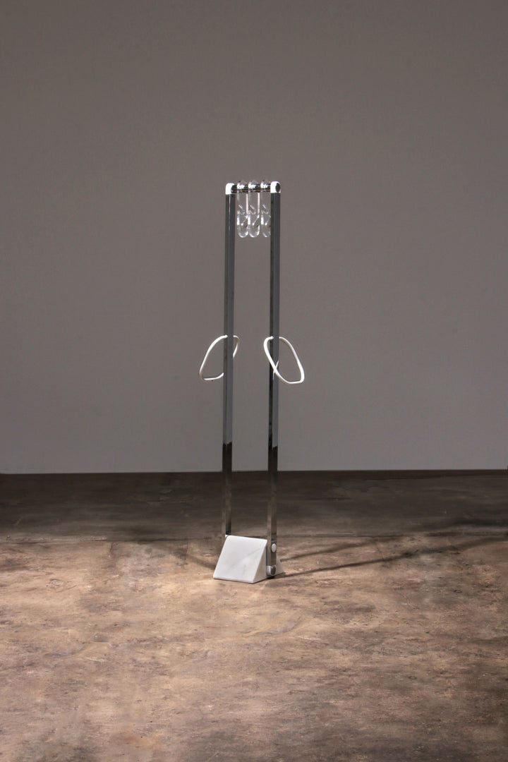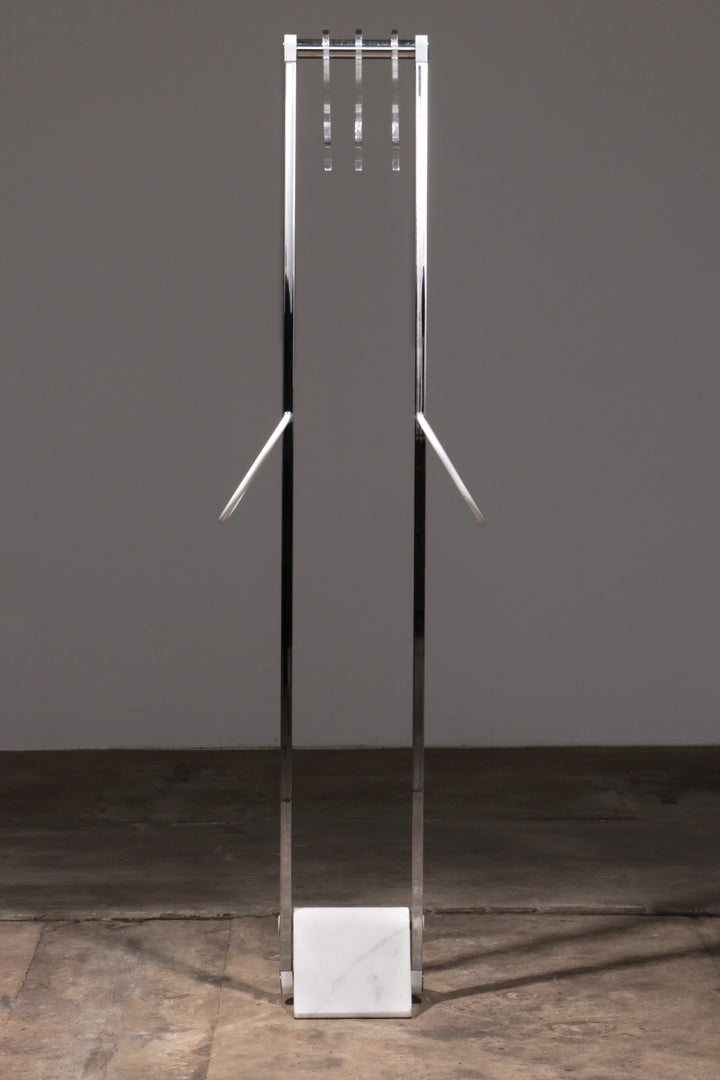 This beautiful Italian design coat rack combines style and functionality effortlessly. Featuring a sturdy marble base and sleek chrome stands, it serves as both a functional piece and an eye-catching design element. The rack is equipped with plexiglass hangers and two hooks for scarves, providing ample space to organize your outerwear. Its modern design makes it an ideal addition to any hallway or entryway.