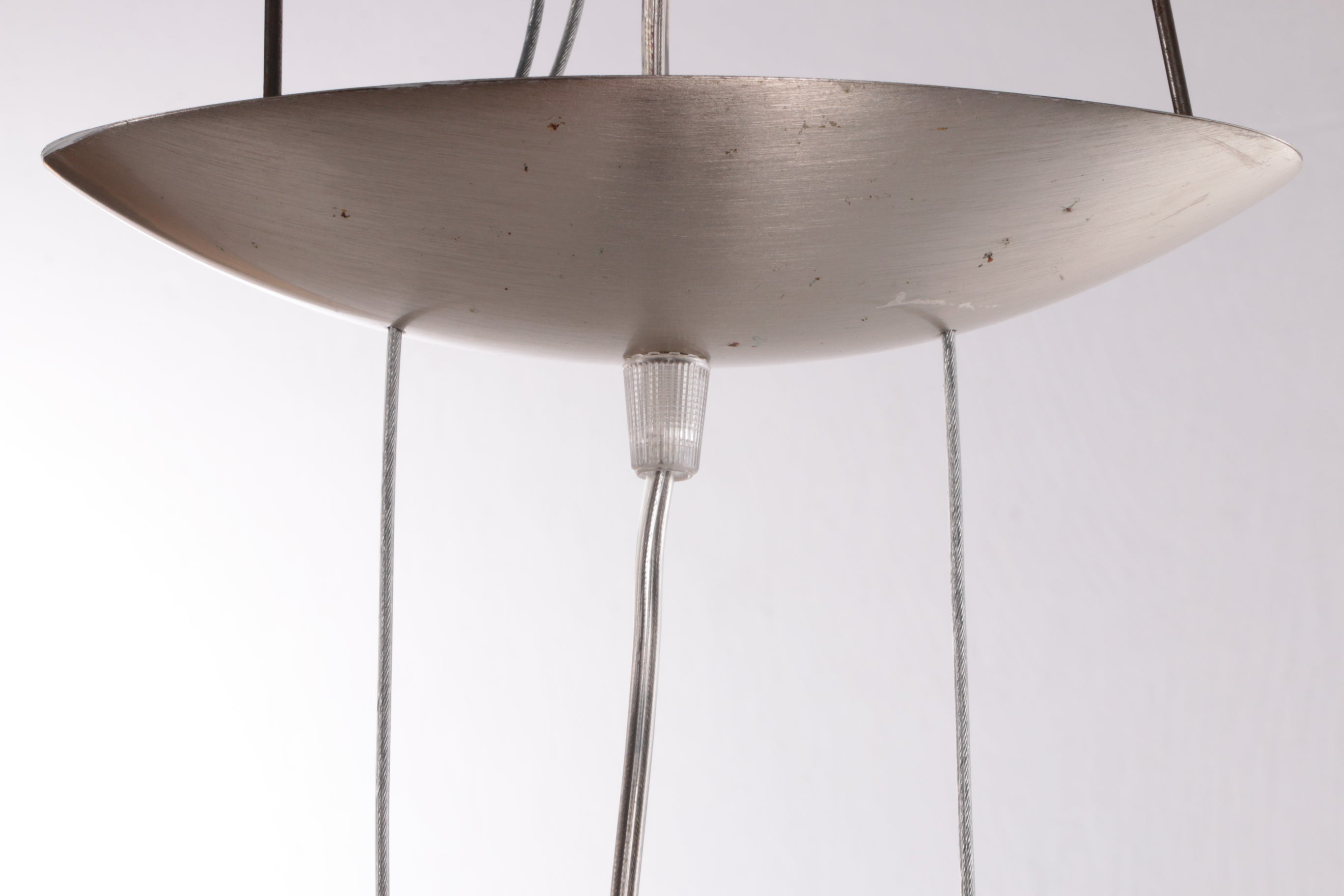 An aluminum plate at the ceiling provides a secure attachment, ensuring stability while allowing the lamp to hang gracefully. The lamp retains its original sticker, confirming its authentic Murano craftsmanship, adding to its value as a collectible piece.