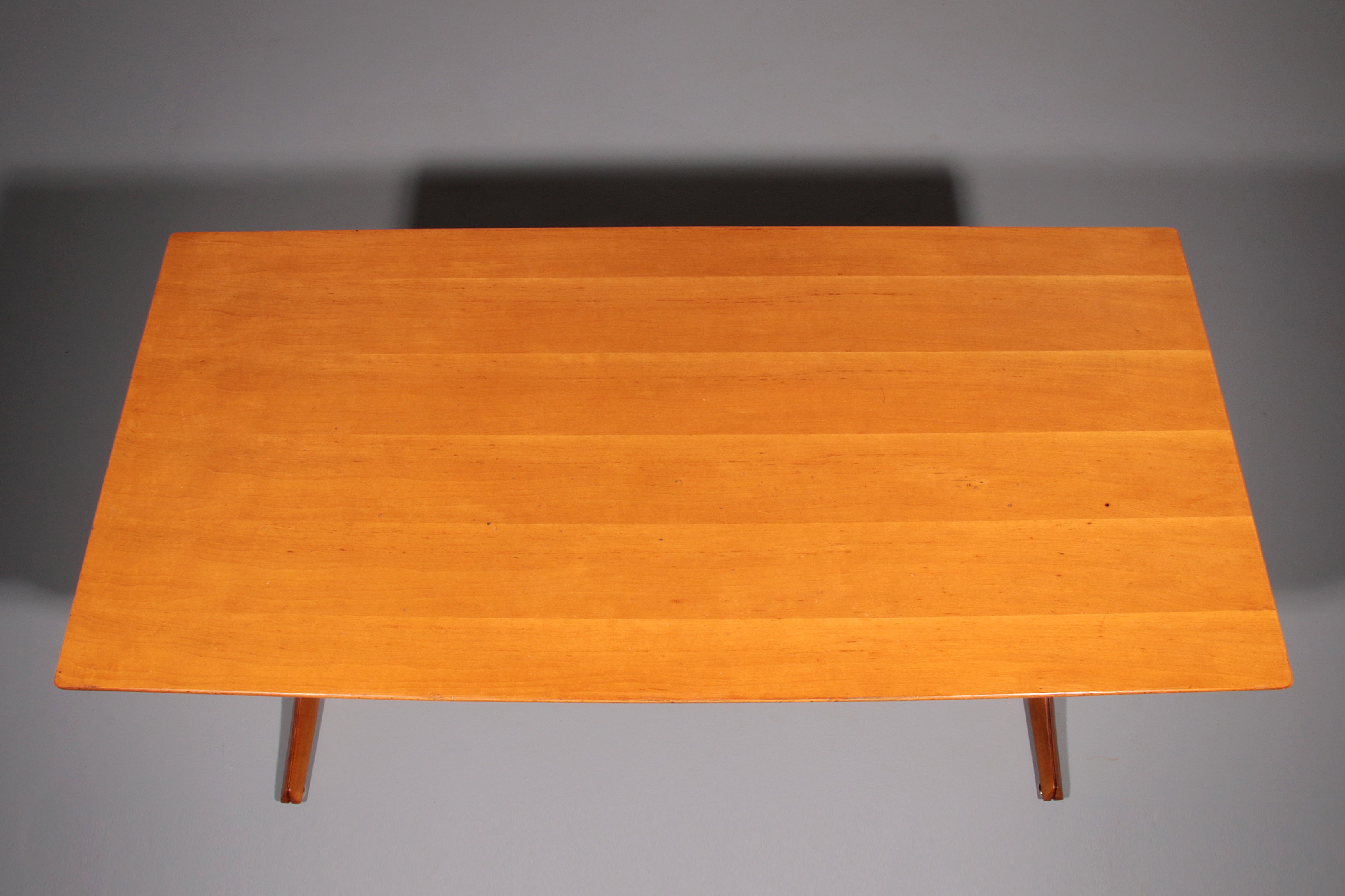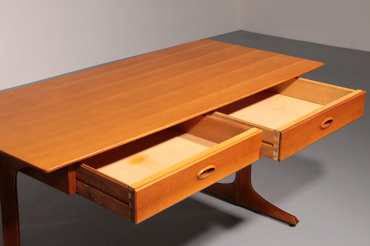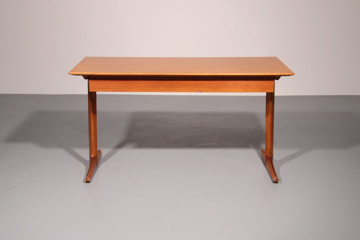Frattini, one of the leading figures in Italian design during the 1950s and 1960s, was celebrated for his ability to combine functionality with sculptural simplicity. This desk is a striking example of that philosophy. Its sleek rectangular top appears to float effortlessly on two slender, subtly slanted legs, creating a light and architectural presence from every angle.