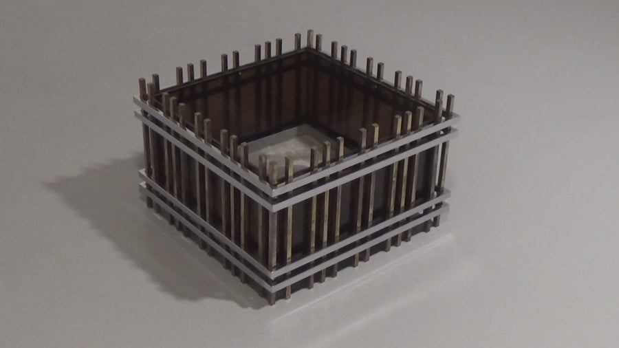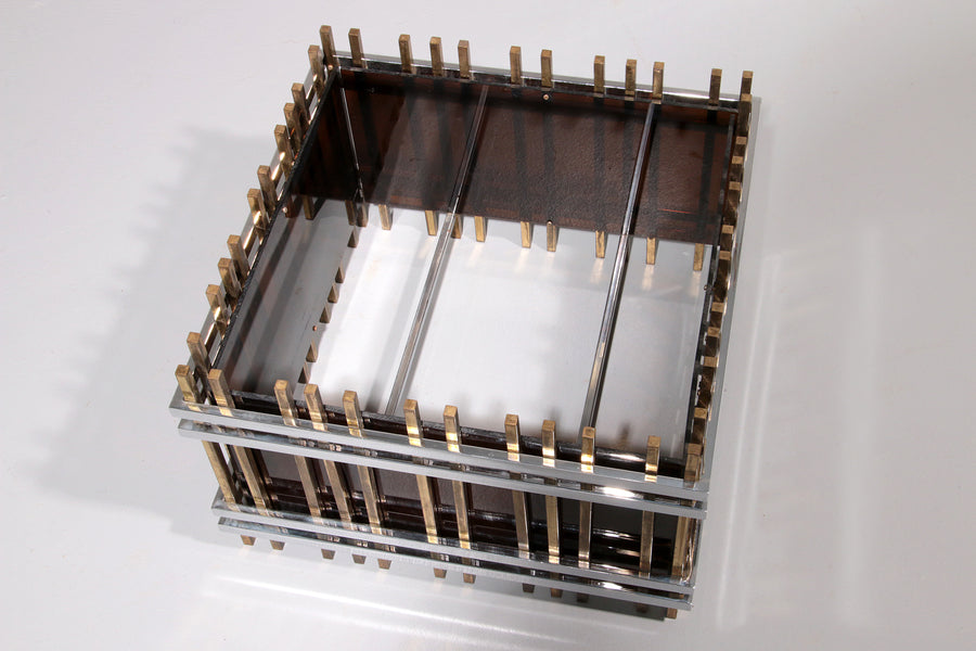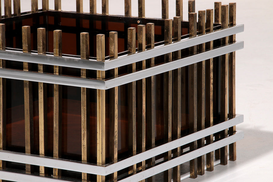 A vintage Italian square garden trough or planter, attributed to Romeo Rega, featuring a modernist structure of brass and chrome rods surrounding a tinted acrylic inner shell. A striking decorative and functional piece that blends sculptural beauty with practical use.