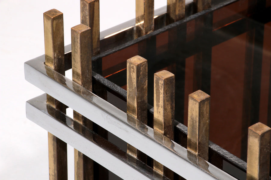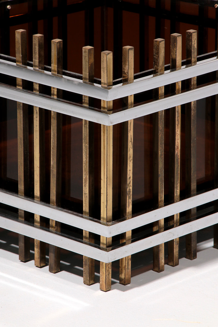 This rare Italian “fioriera” planter captures the unmistakable elegance and confidence of mid-century modern design. Attributed to the celebrated designer Romeo Rega—renowned for his glamorous mix of metals and sculptural forms—the piece immediately elevates any space with its architectural presence. The outer frame pairs vertical brass rods with horizontal chrome elements, creating a rhythmic interplay of warm and cool tones. Inside, a tinted acrylic shell adds depth and subtle luminosity, transforming the planter into a functional artwork. Whether placed in an entryway, living room, winter garden, or terrace, it draws the eye and adds a refined touch of 1970s Italian luxury. This is more than a planter; it is a collectible design object that enriches the atmosphere of any interior.