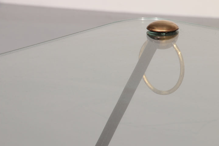 Discover the timeless elegance of the Jacques Adnet X-Base Coffee Table, a stunning piece from the 1960s that embodies the essence of French modernism. This exquisite coffee table features a unique X-shaped design with sleek black metal legs, complemented by bronze-tipped feet and decorative bronze rings. The original glass top, a hallmark of Adnet's design, adds a touch of sophistication, despite a small, discreet chip hidden beneath one of the bronze knobs. With a few age-appropriate scratches, this table is a testament to its rich history and enduring appeal. Ideal for those who appreciate vintage charm and functional artistry, this coffee table is a perfect addition to any living space.