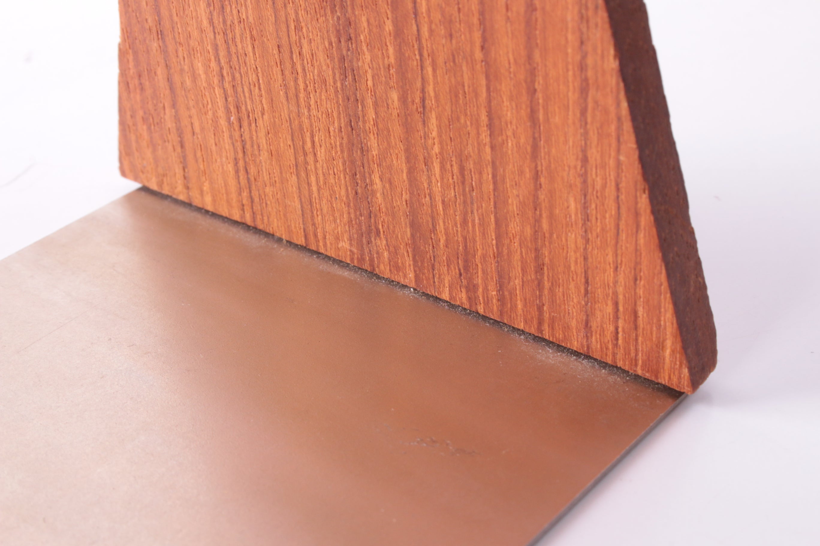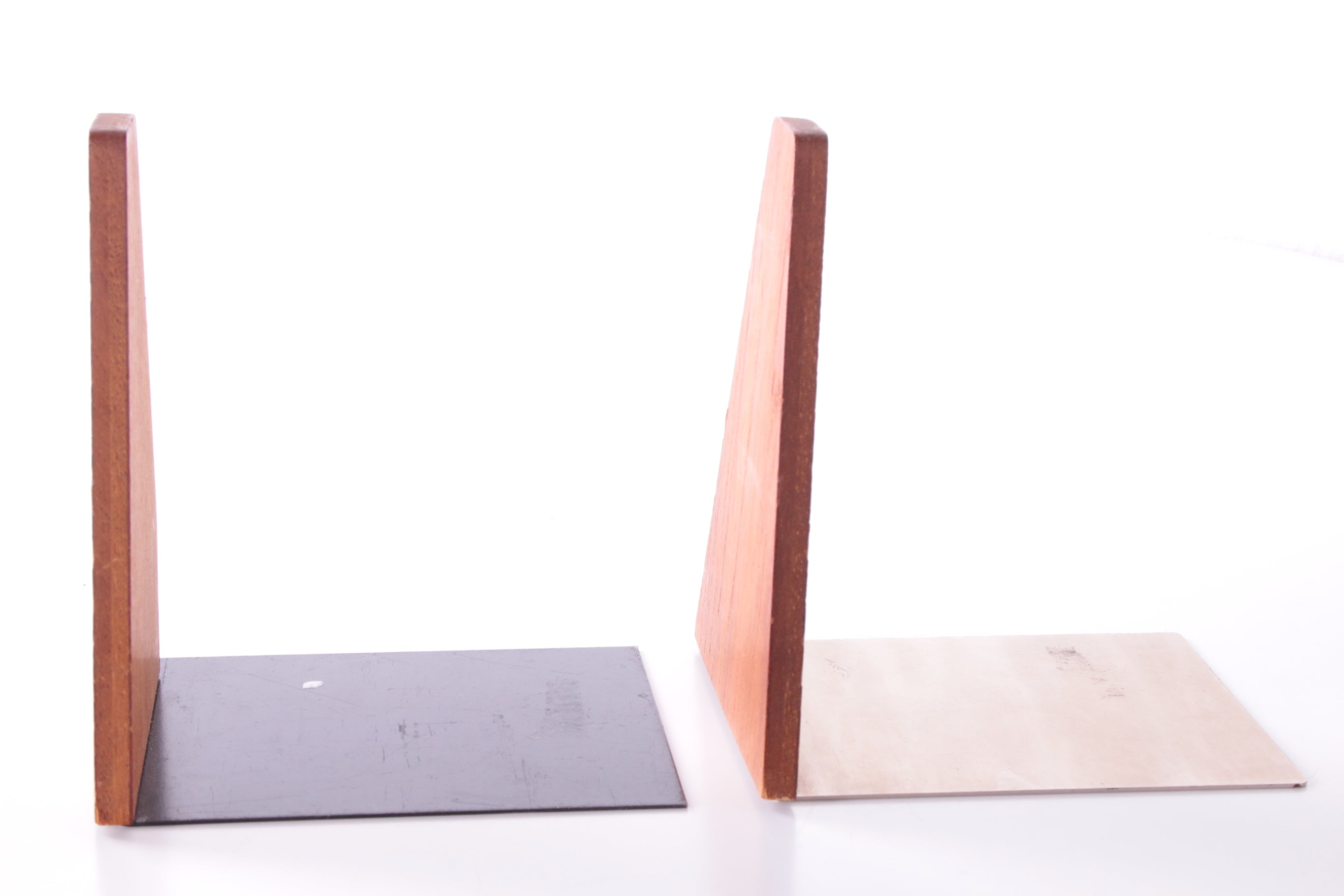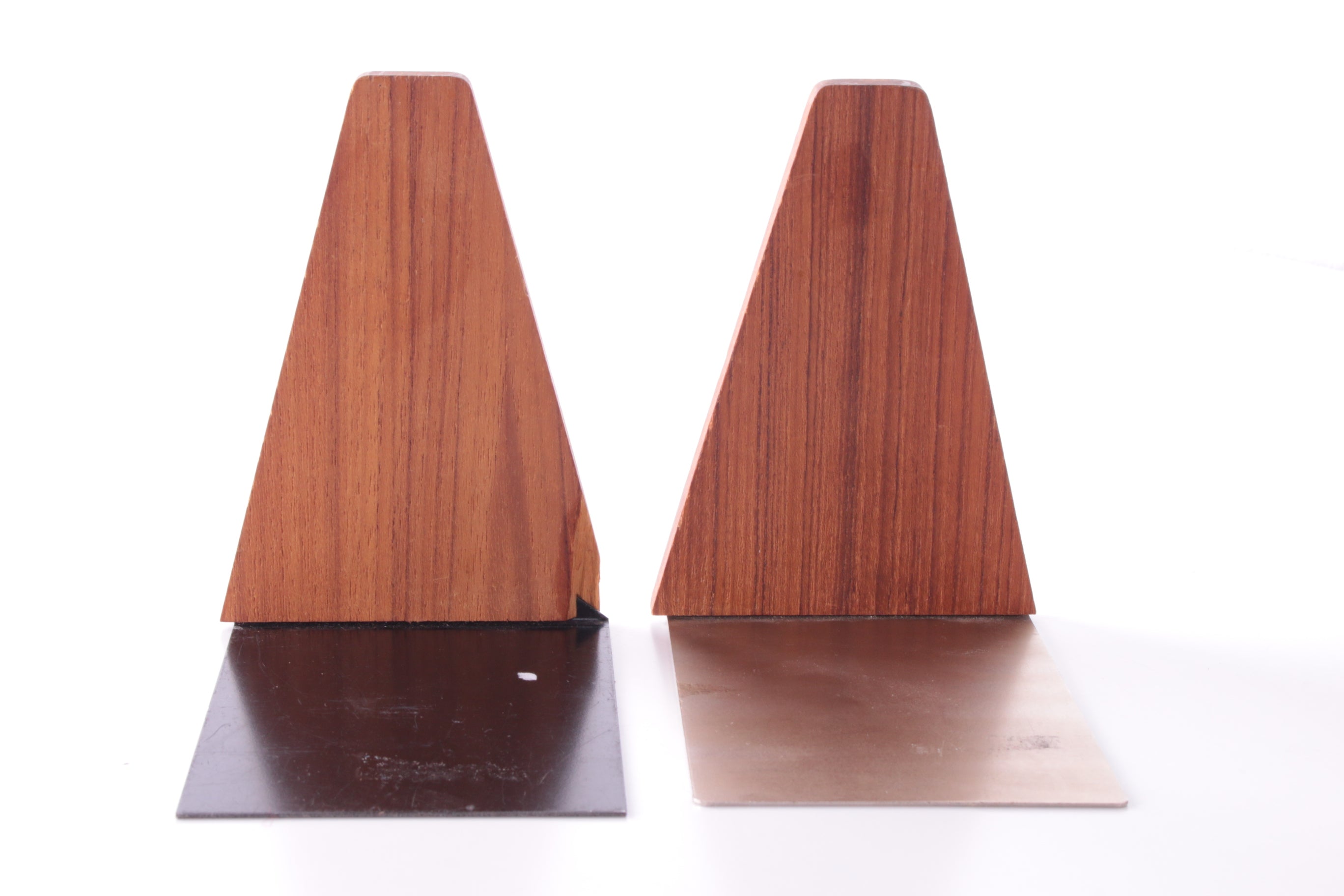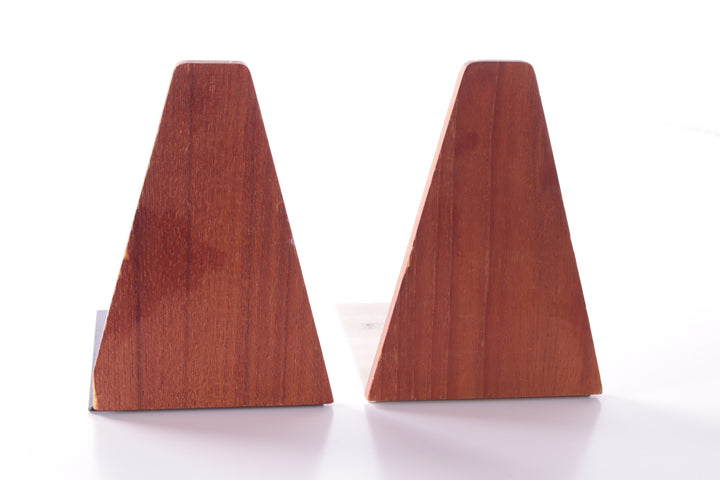 These small teak bookends, attributed to renowned designer Kai Kristiansen, were produced in the 1960s by Feldballe Møbelfabrik in Denmark. Made from solid teak with a metal plate base, they are a beautiful example of mid-century Scandinavian design. In very good vintage condition with only minimal wear, including tiny scratches and one larger imperfection (see photo).