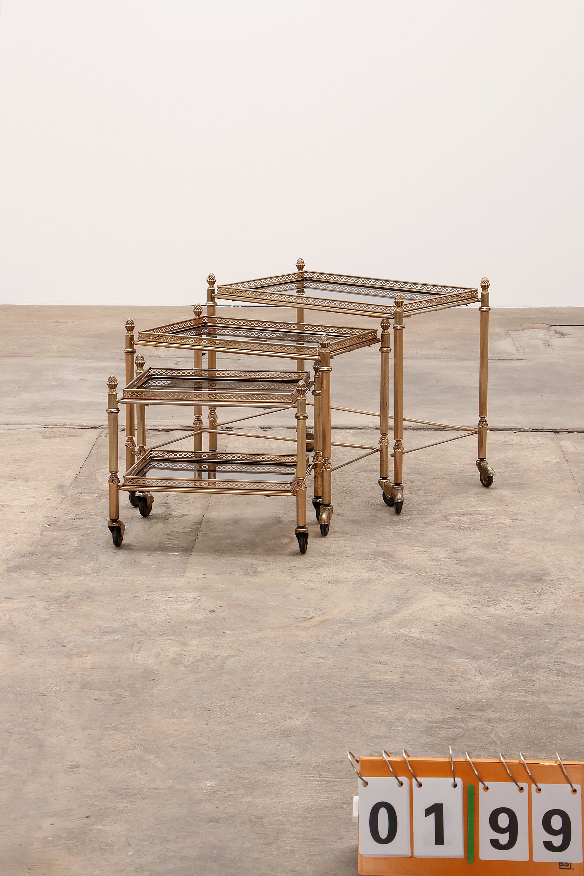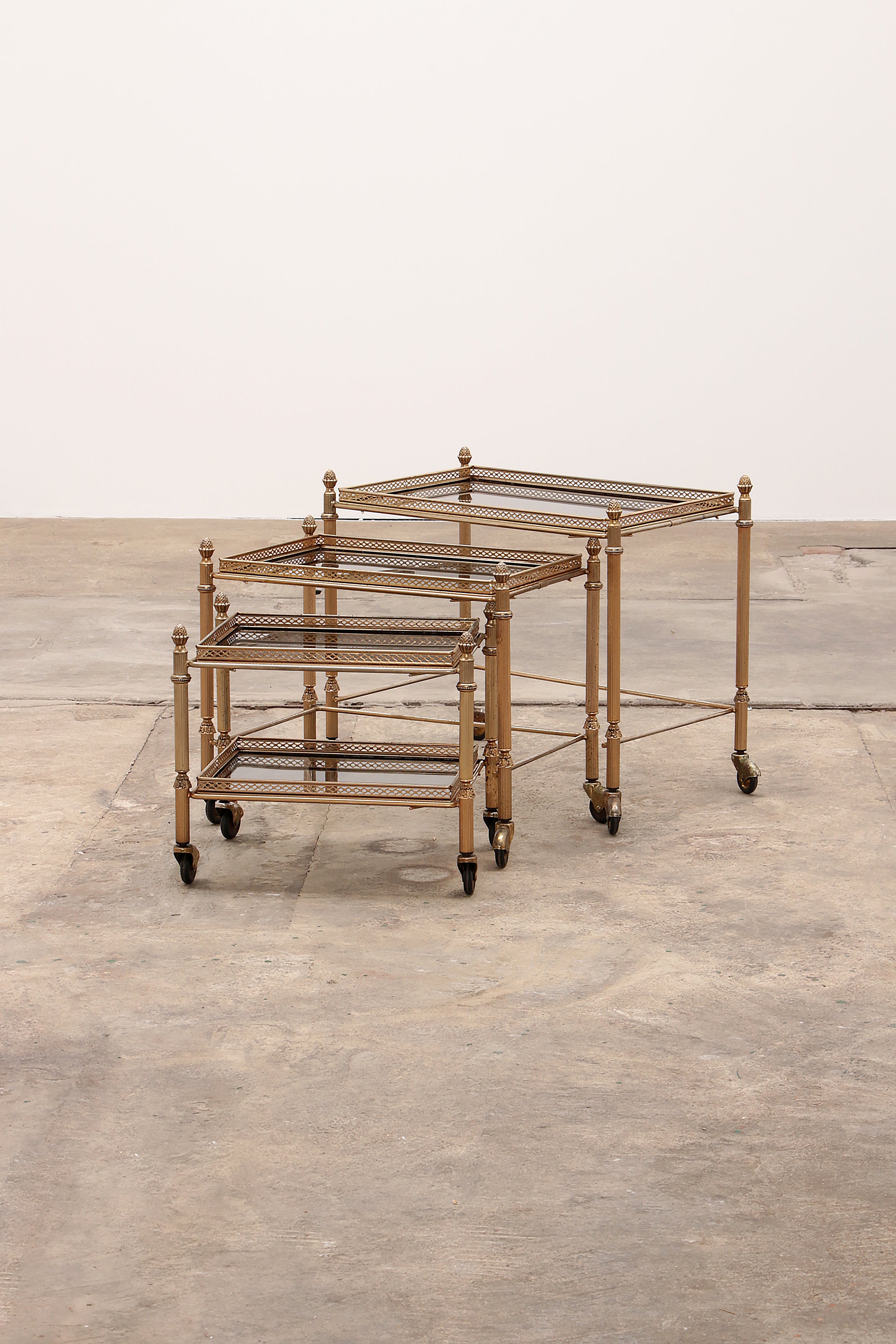 Discover timeless elegance with the Maison Jansen Vintage Brass Trolley, a stunning piece crafted in the 1950s in France. This exquisite trolley features three detachable tables, each with a sleek, smoky glass top, set within a luxurious brass frame. Maison Jansen, renowned for its opulent and traditional designs, has been a staple in the homes of the elite since 1880. This trolley is no exception, offering both functionality and a touch of vintage charm. Perfect for entertaining, it provides additional table space with ease, thanks to its smooth-rolling wheels and sturdy construction. The trolley remains in top vintage condition, promising years of beauty and utility. Ideal for modern interiors, it adds a sophisticated flair that blends seamlessly with contemporary decor.