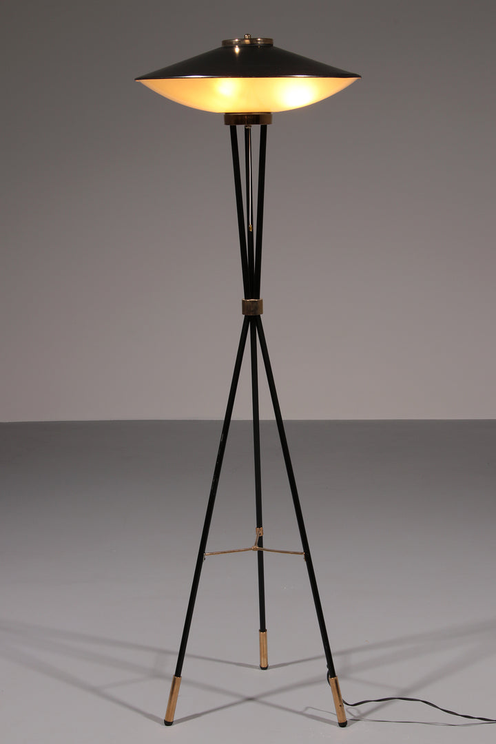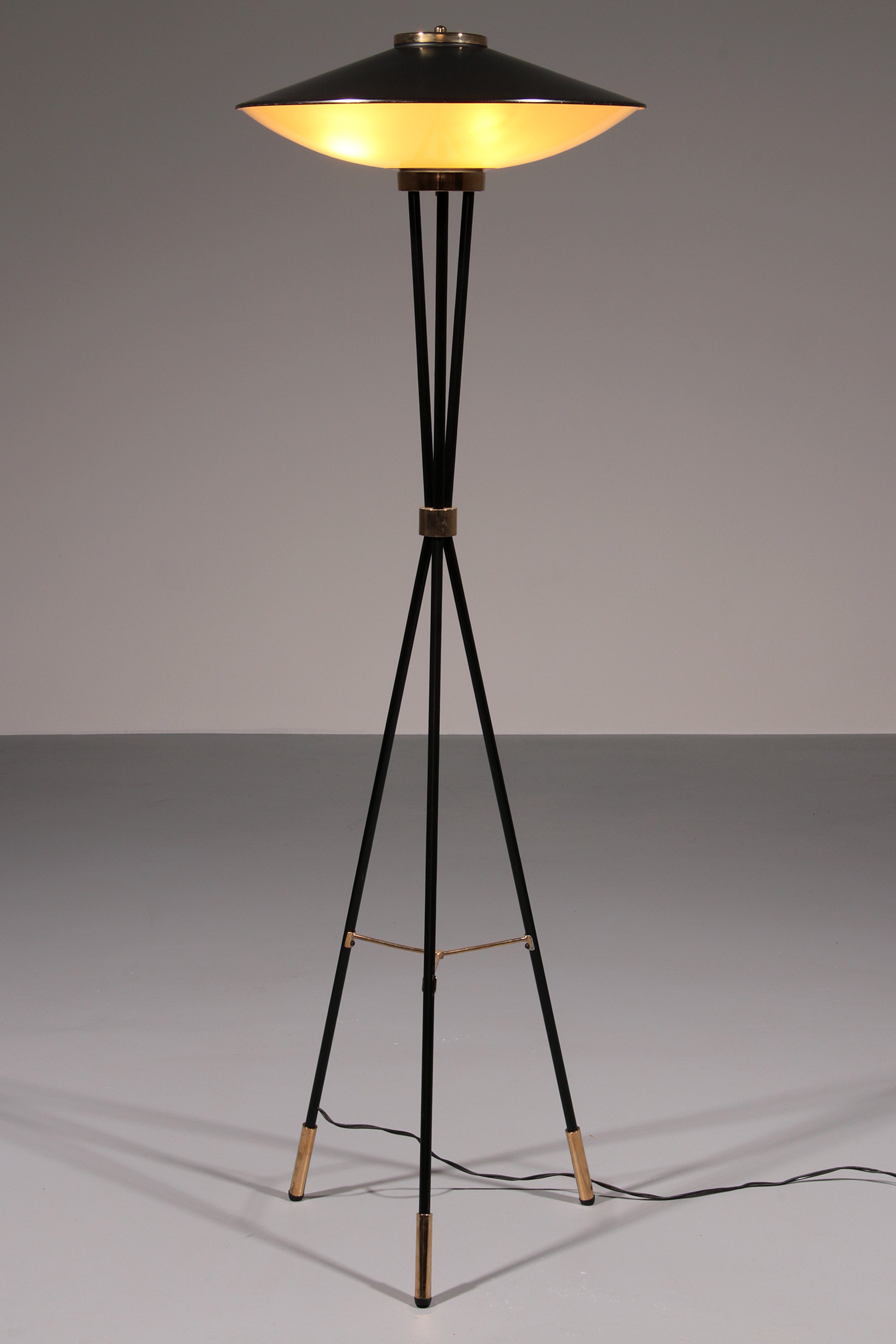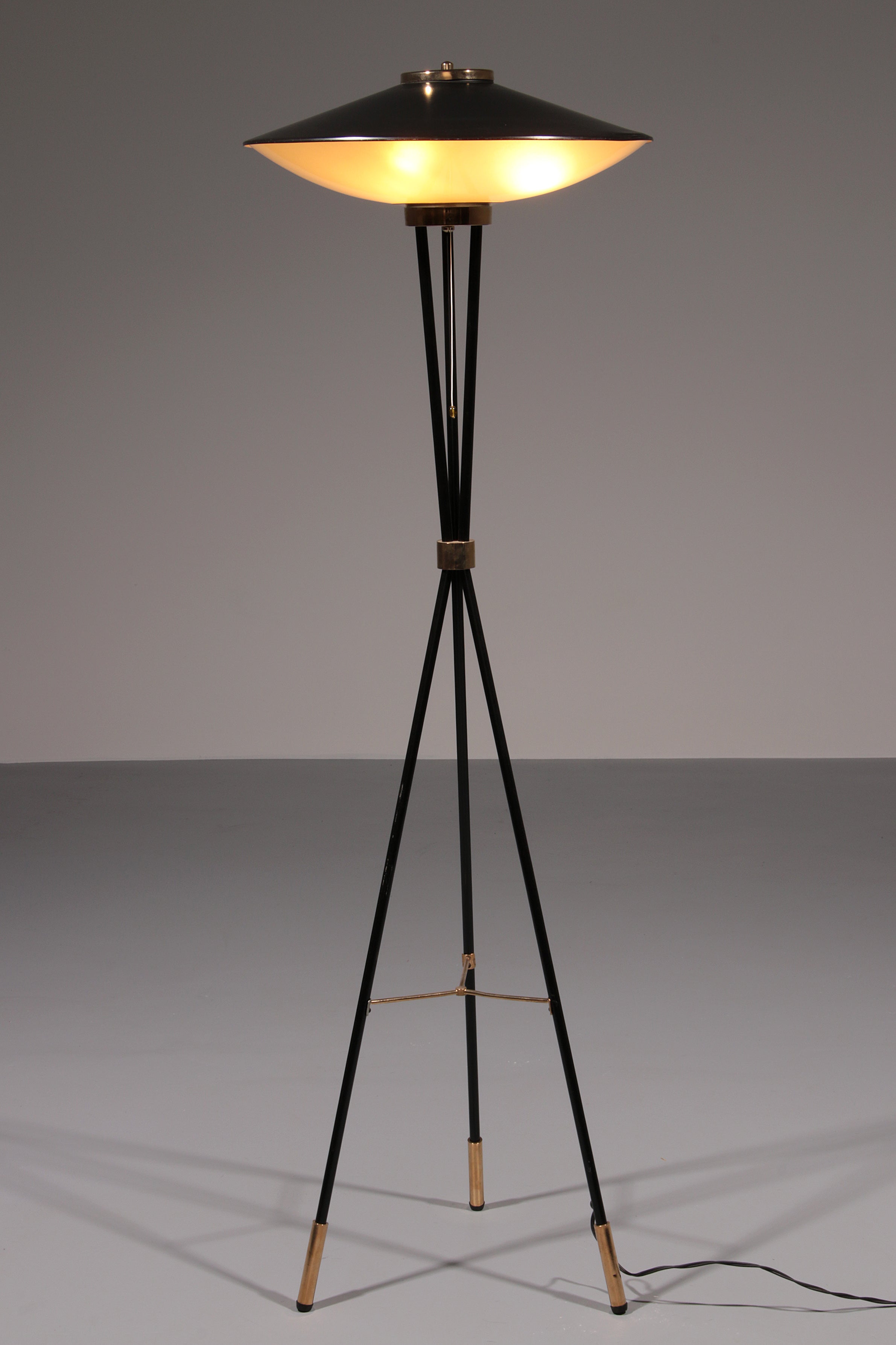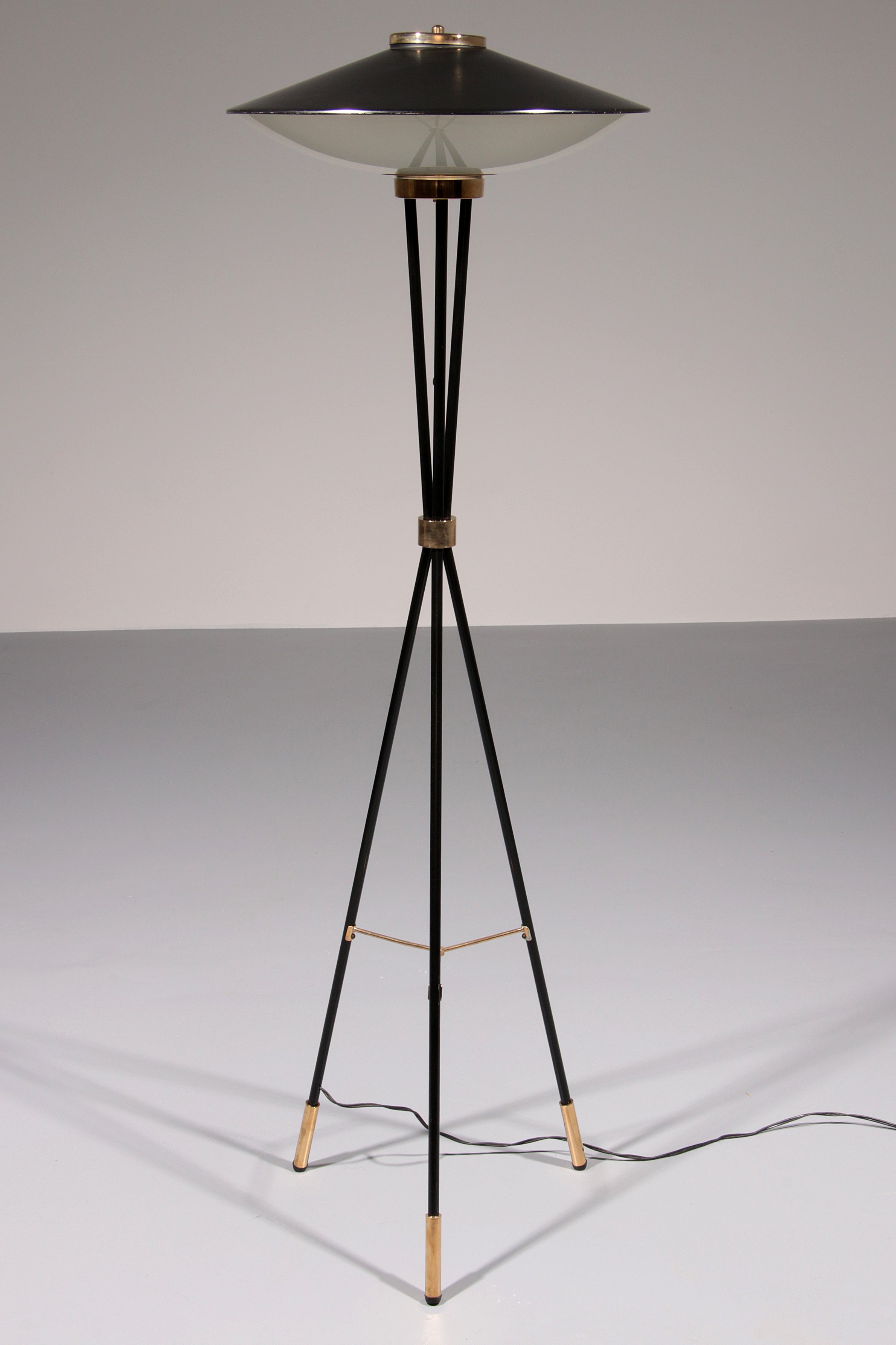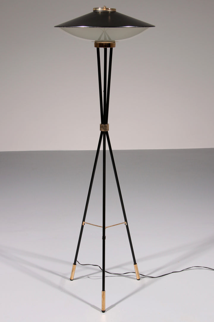 Illuminate your space with timeless elegance using this vintage Italian floor lamp, a masterpiece designed and produced by Stilnovo in the 1950s. This exquisite lamp features a lacquered aluminum shade, offering a sleek and sophisticated look that complements any decor style. The combination of brass, painted iron, and glass elements adds a touch of classic charm while ensuring durability and stability. Perfect for living rooms, bedrooms, or study areas, this floor lamp not only provides ambient lighting but also serves as a stunning decorative piece.