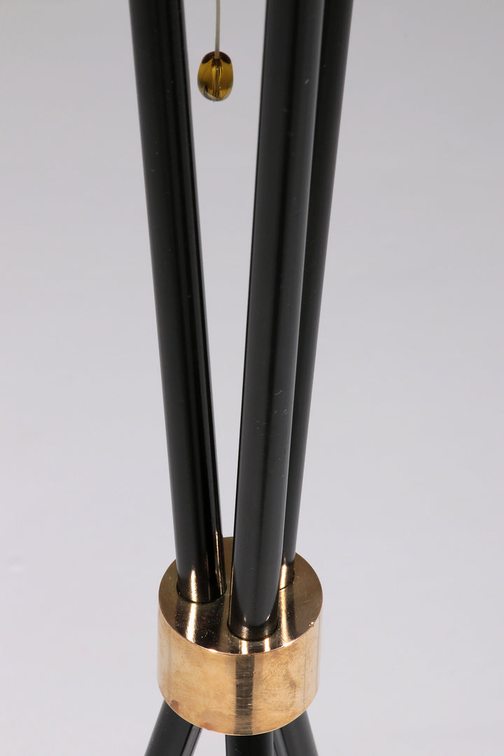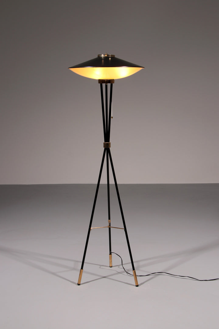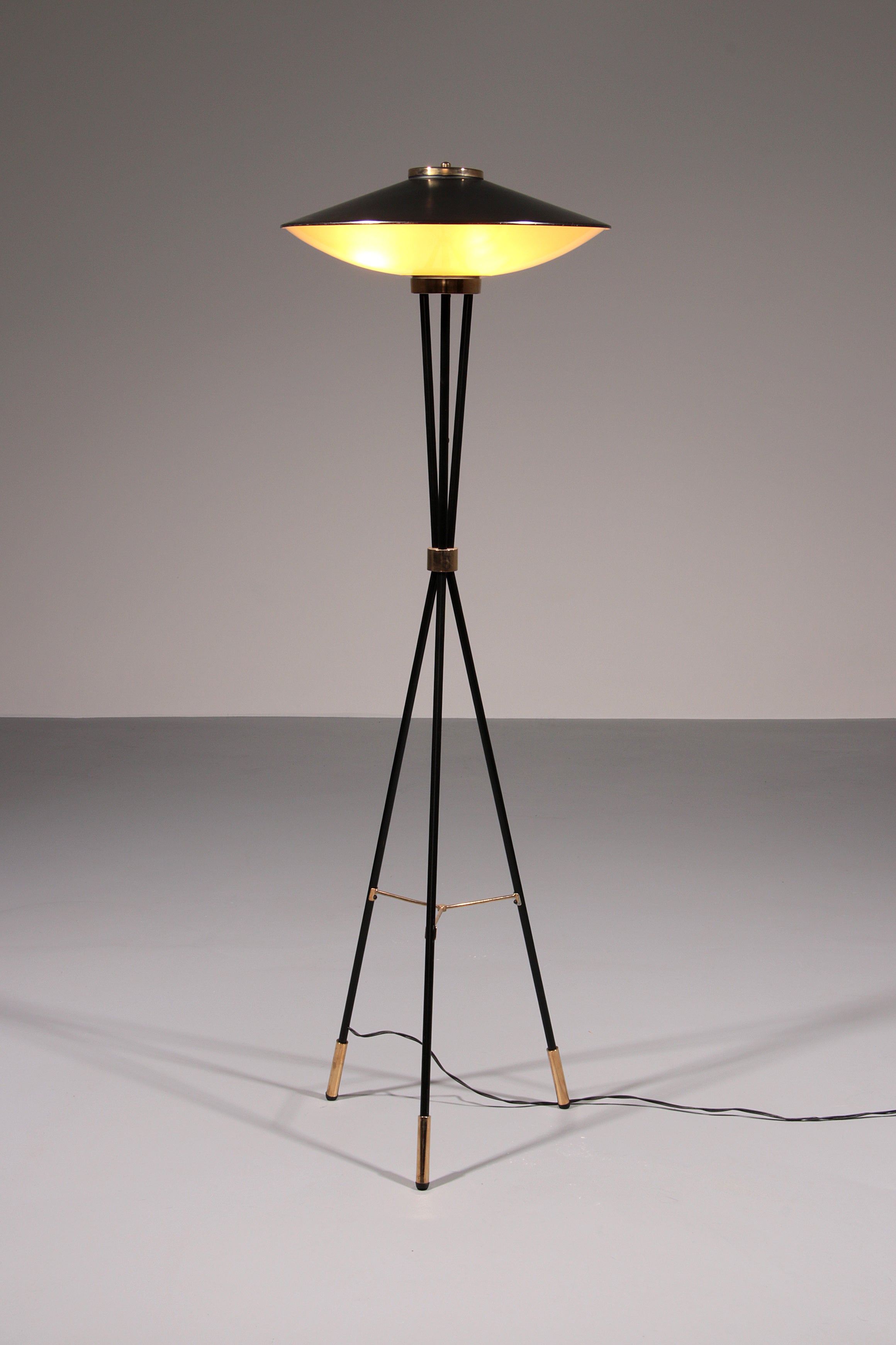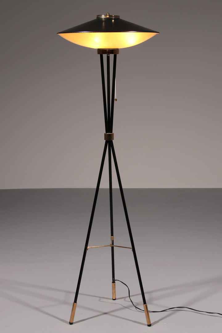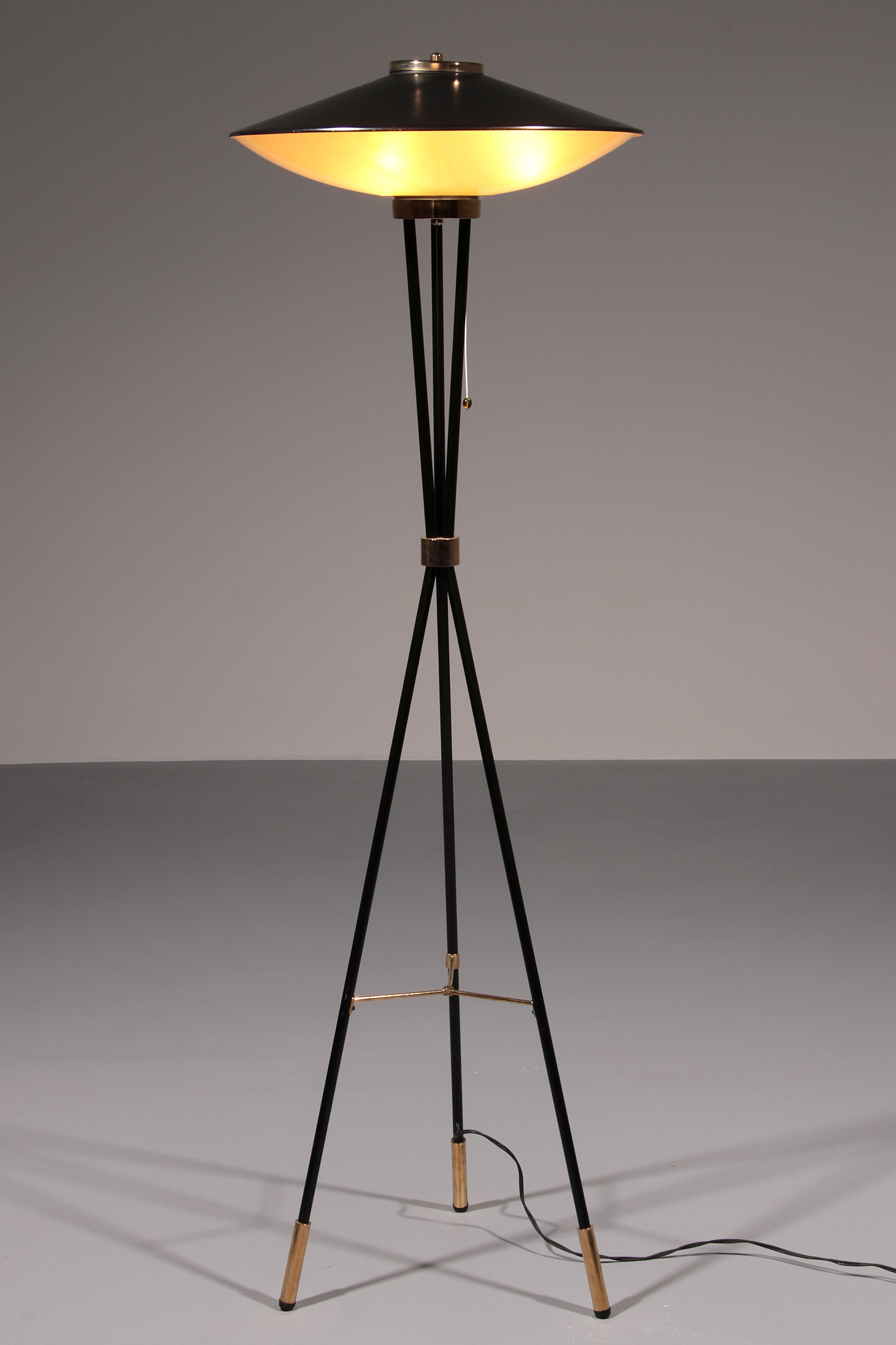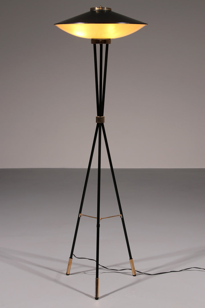 Illuminate your space with timeless elegance using this vintage Italian floor lamp, a masterpiece designed and produced by Stilnovo in the 1950s. This exquisite lamp features a lacquered aluminum shade, offering a sleek and sophisticated look that complements any decor style. The combination of brass, painted iron, and glass elements adds a touch of classic charm while ensuring durability and stability. Perfect for living rooms, bedrooms, or study areas, this floor lamp not only provides ambient lighting but also serves as a stunning decorative piece.