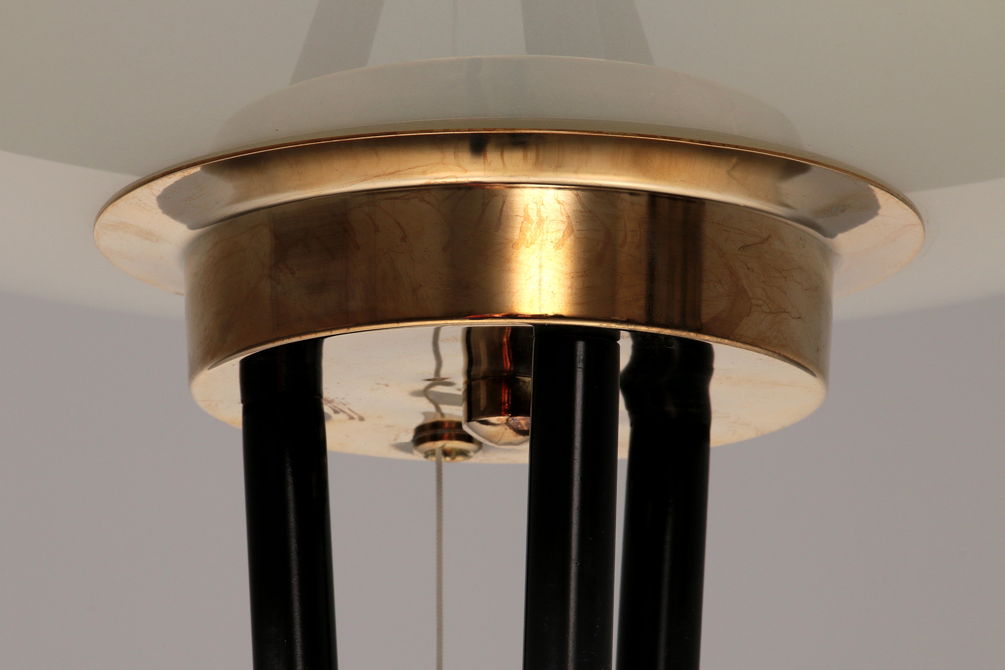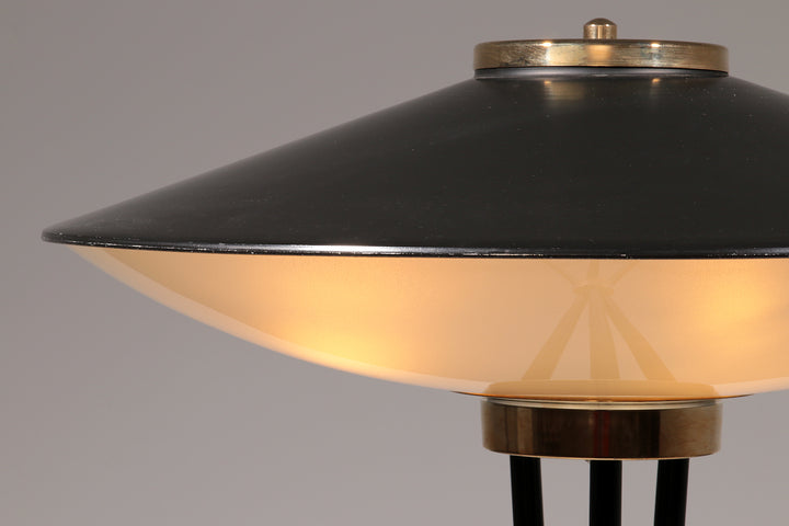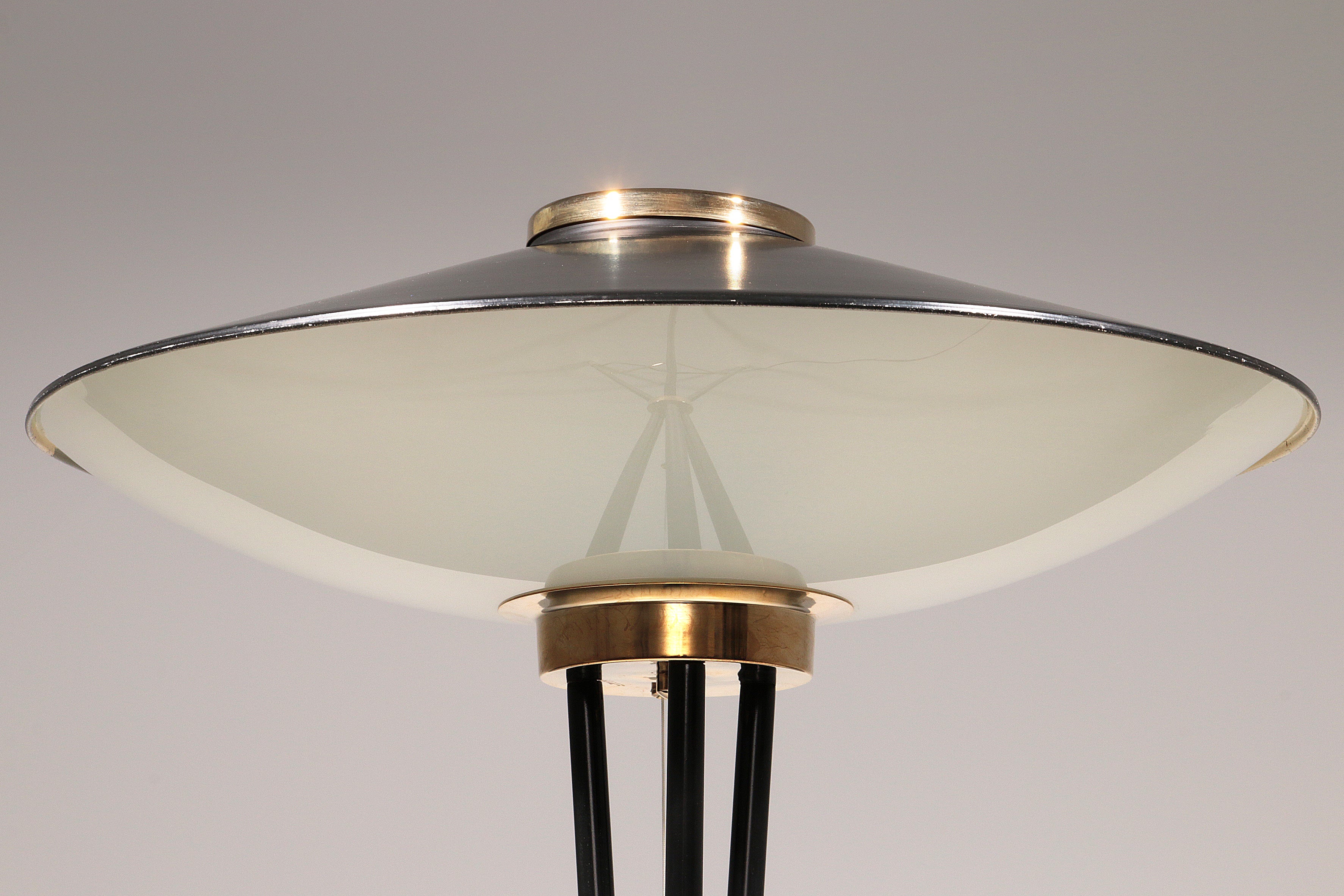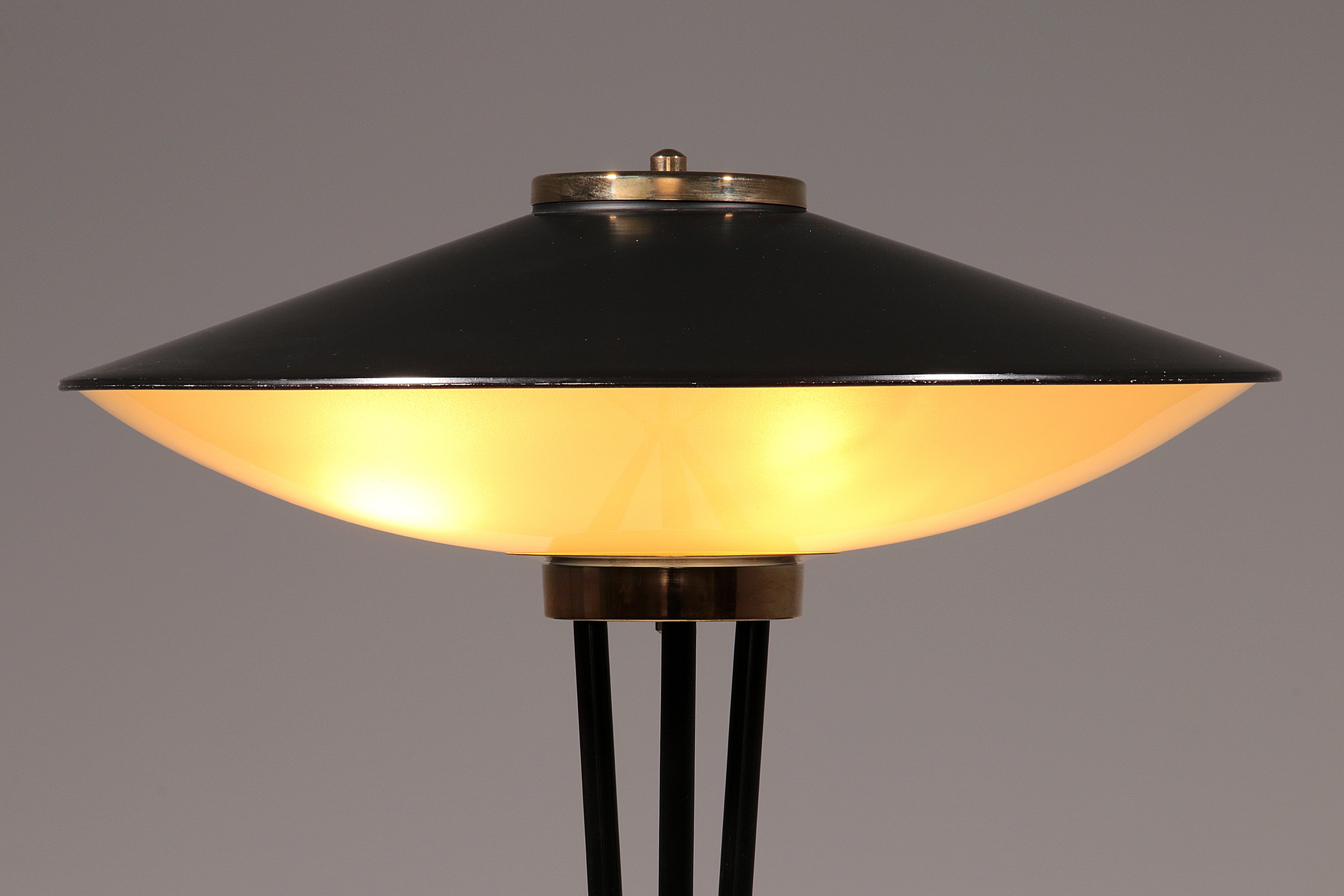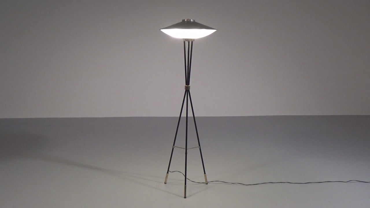 Illuminate your space with timeless elegance using this vintage Italian floor lamp, a masterpiece designed and produced by Stilnovo in the 1950s. This exquisite lamp features a lacquered aluminum shade, offering a sleek and sophisticated look that complements any decor style. The combination of brass, painted iron, and glass elements adds a touch of classic charm while ensuring durability and stability. Perfect for living rooms, bedrooms, or study areas, this floor lamp not only provides ambient lighting but also serves as a stunning decorative piece.