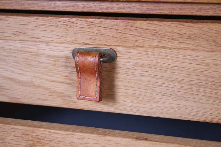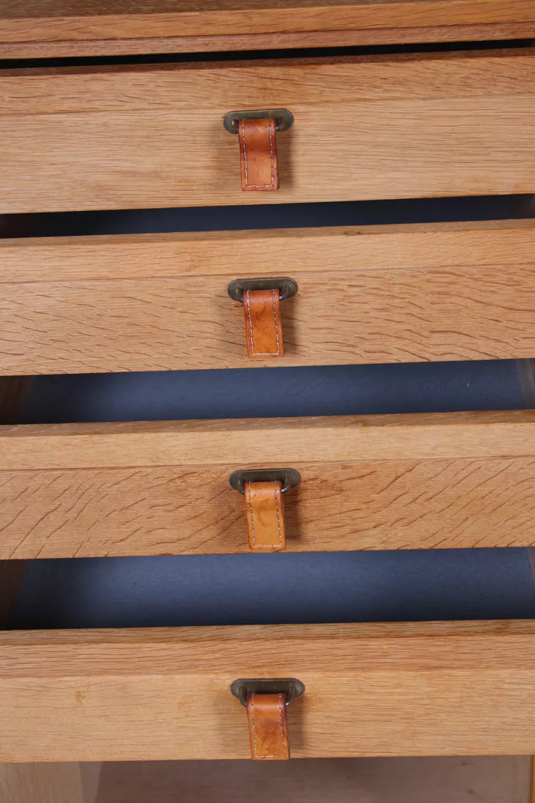 Elevate your interior with this authentic mid-century Kurt Østervig oak wall unit, crafted by K.P. Møbler in the 1960s. Made from high-quality light oak, this wall unit seamlessly combines functionality and timeless design. Its clean lines, subtle relief fronts, and unique leather belt handles with decorative seams make it a standout piece. Featuring a combination of cabinets, drawers, and shelves, this versatile unit is perfect for stylish storage.