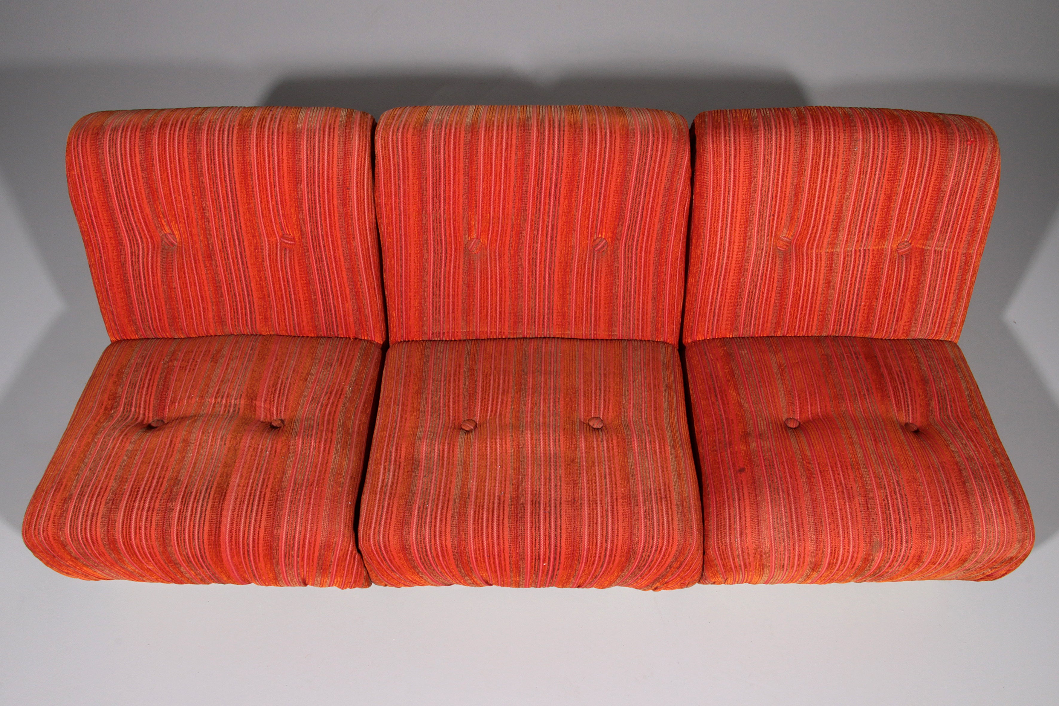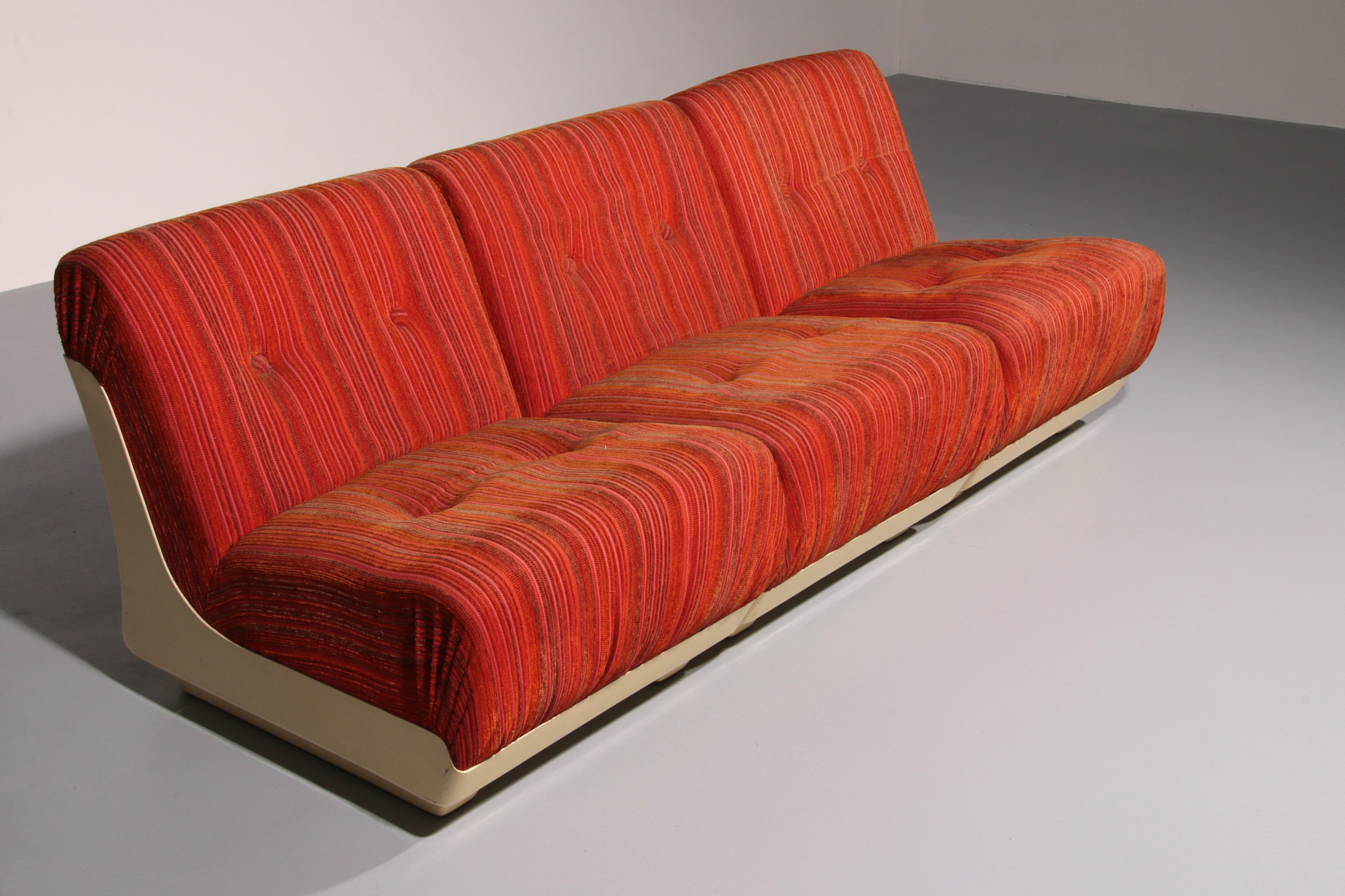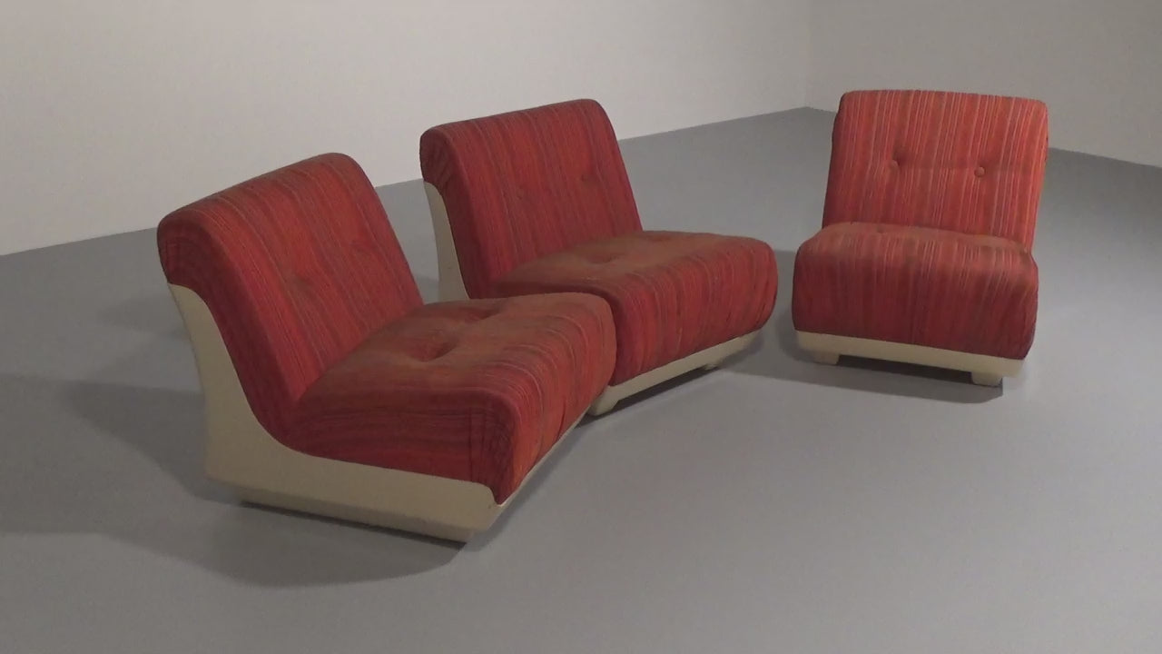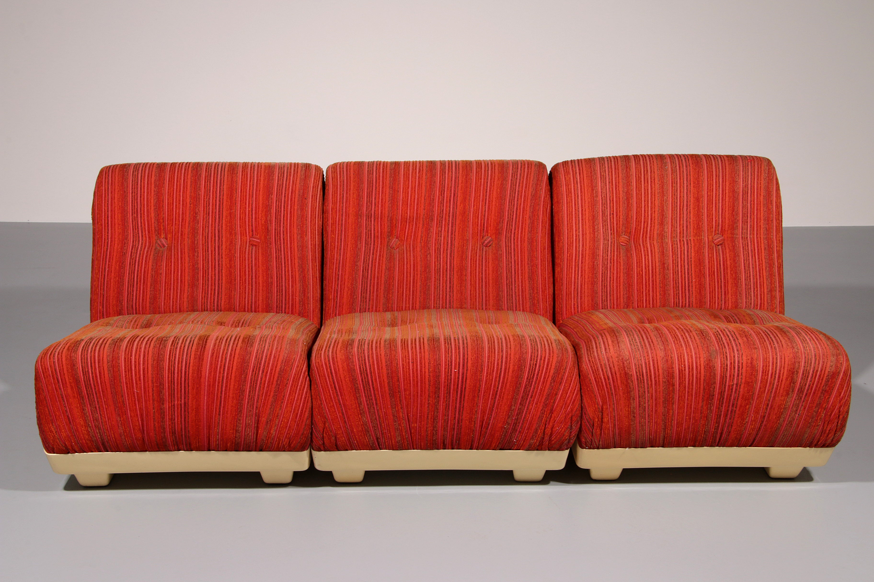 This rare modular Space Age sofa from the 1970s is a true design statement. Featuring three separate seating elements, it offers flexible styling options—use it as a complete sofa or as individual pieces. The off-white plastic base contrasts beautifully with the upholstery, which may require reupholstering. Despite its age, the sofa remains in good vintage condition.
