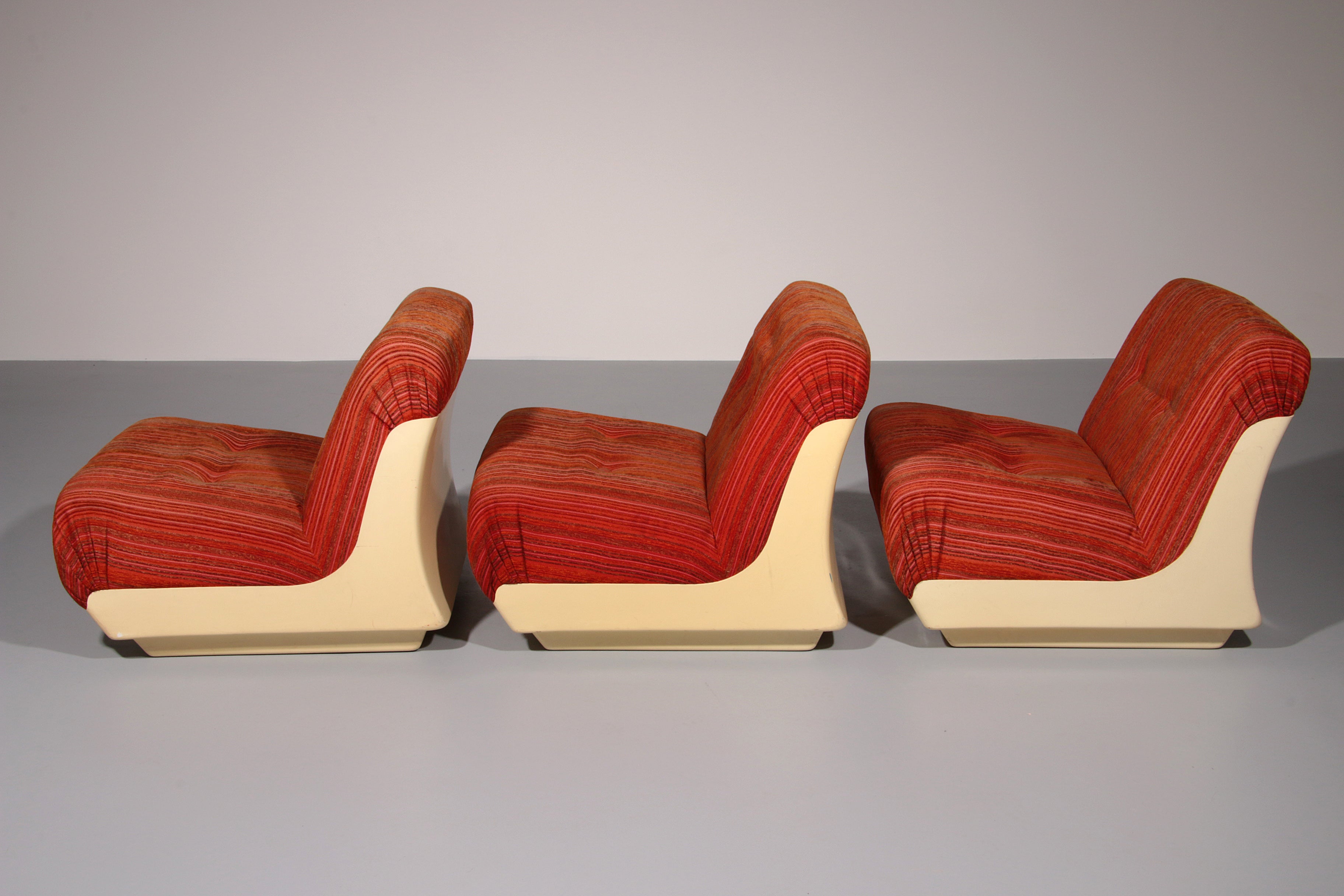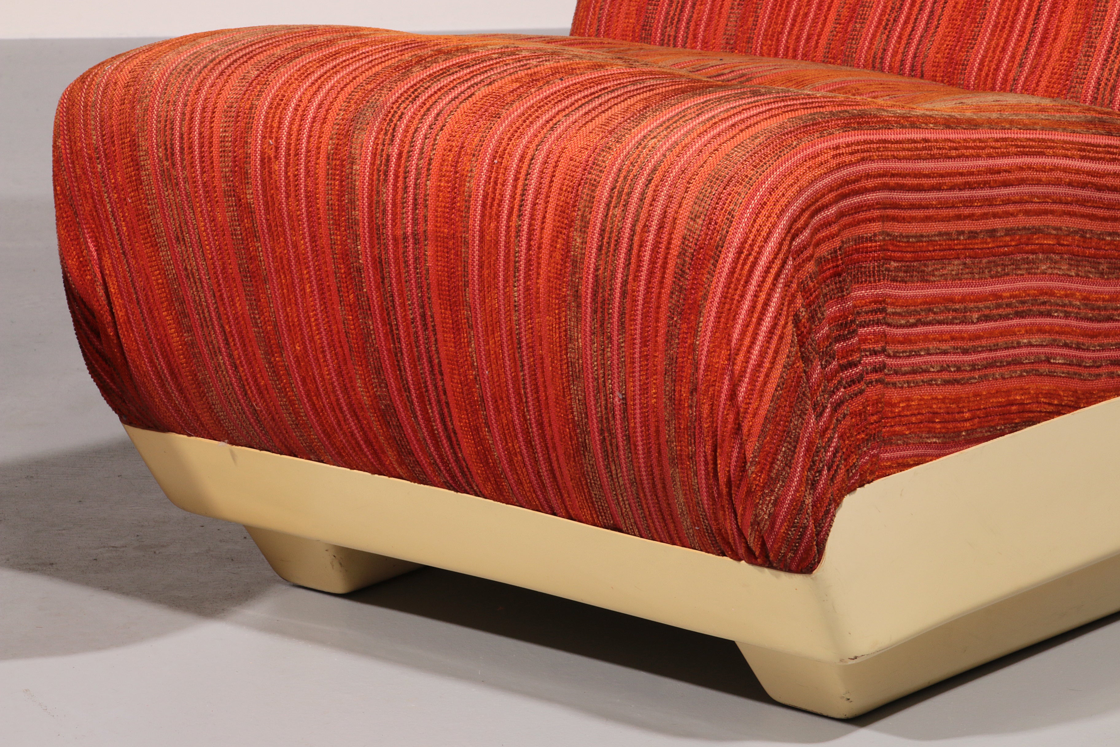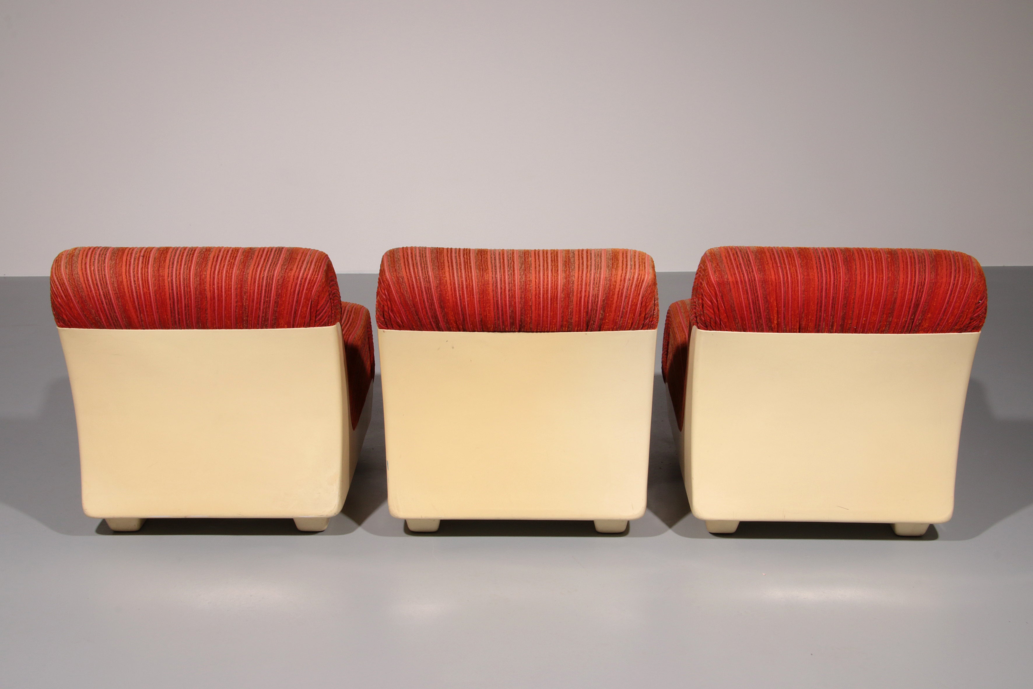 This rare modular Space Age sofa from the 1970s is a true design statement. Featuring three separate seating elements, it offers flexible styling options—use it as a complete sofa or as individual pieces. The off-white plastic base contrasts beautifully with the upholstery, which may require reupholstering. Despite its age, the sofa remains in good vintage condition.