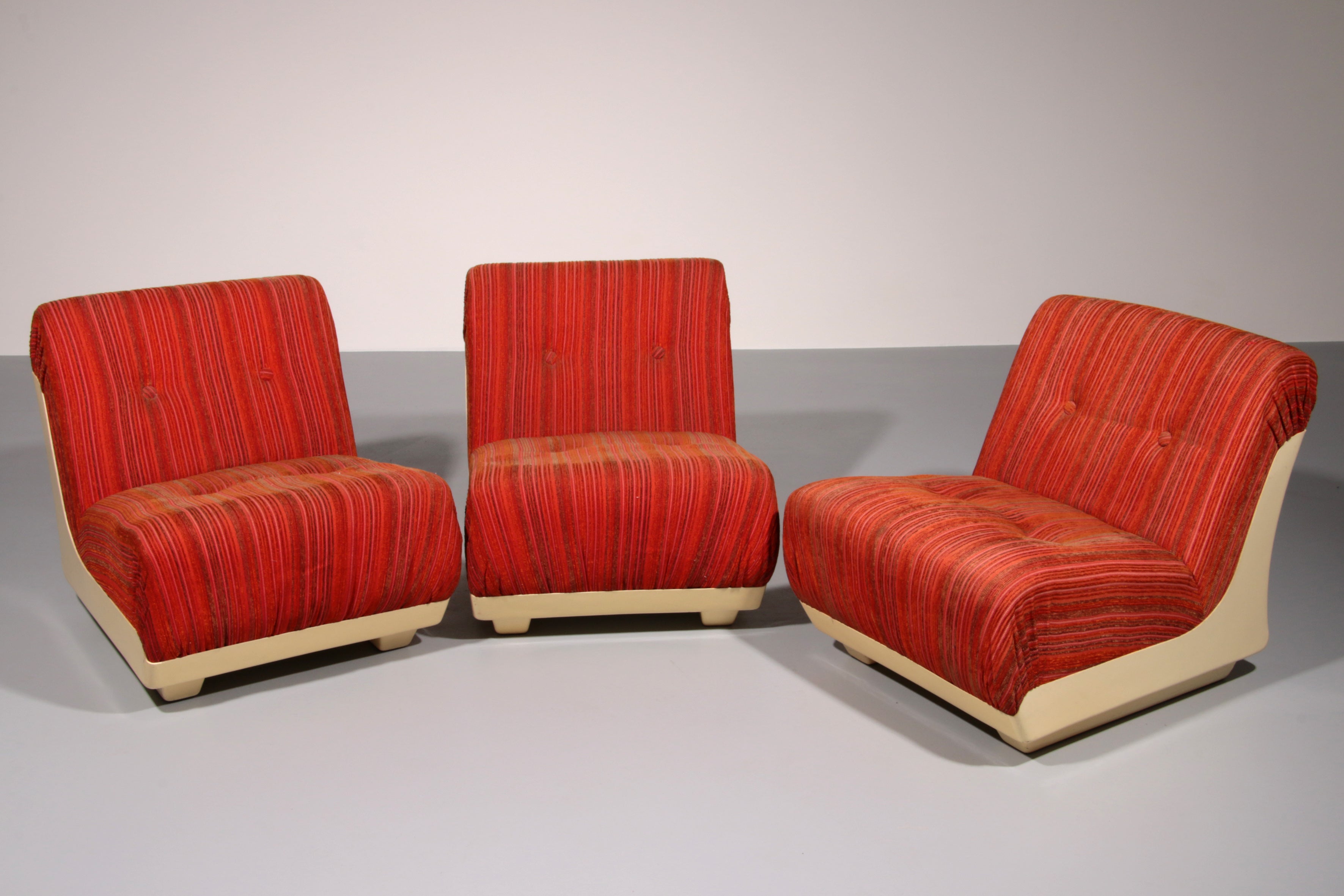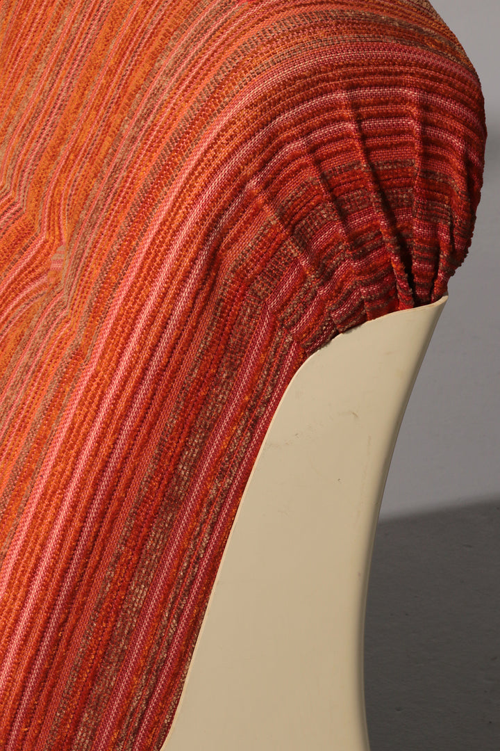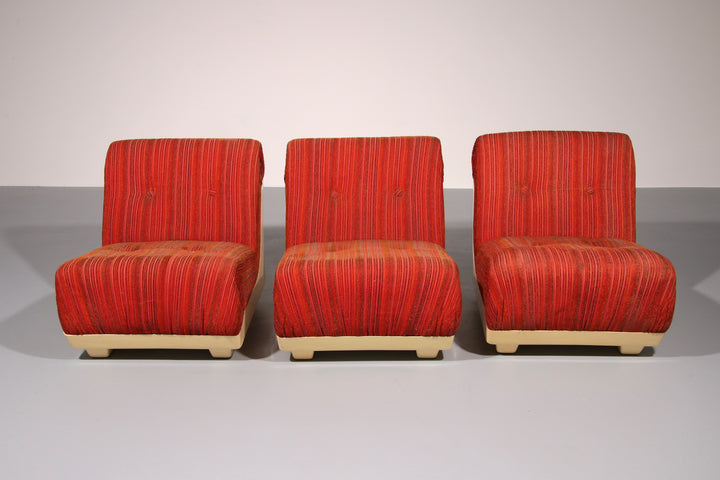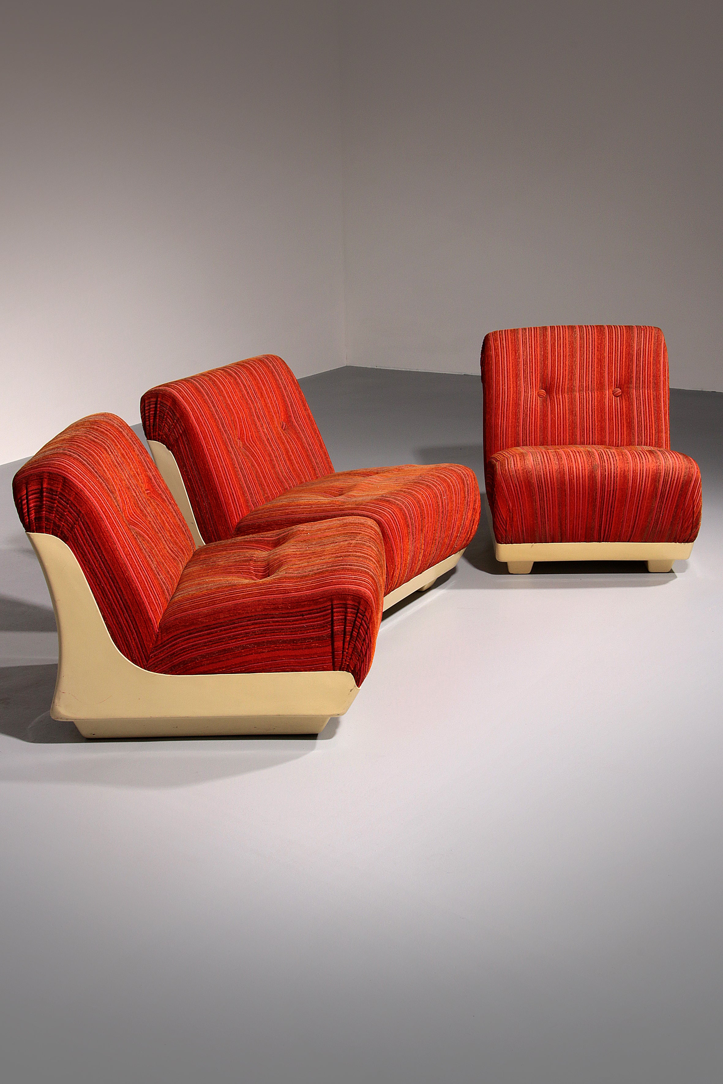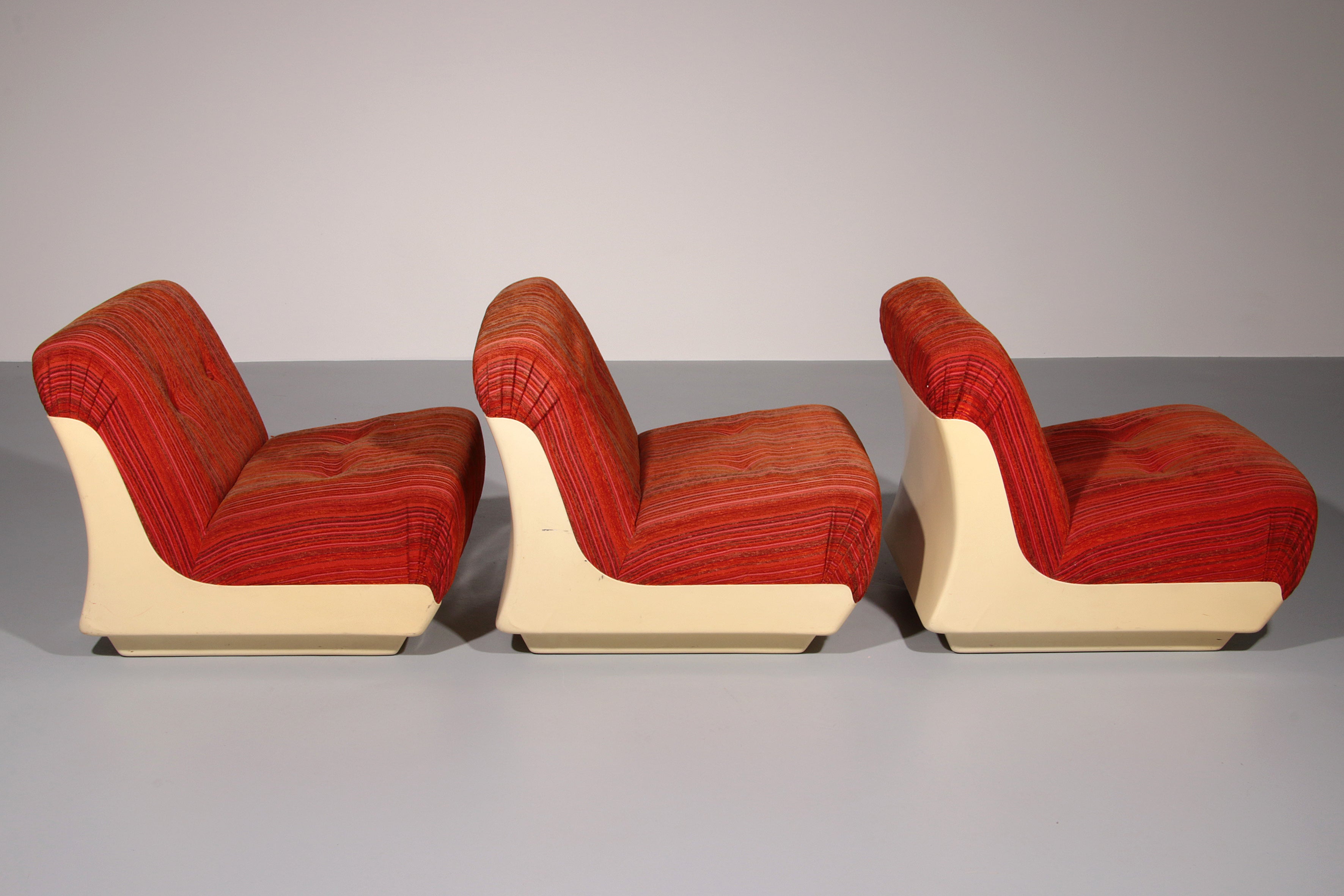 This rare modular Space Age sofa from the 1970s is a true design statement. Featuring three separate seating elements, it offers flexible styling options—use it as a complete sofa or as individual pieces. The off-white plastic base contrasts beautifully with the upholstery, which may require reupholstering. Despite its age, the sofa remains in good vintage condition.