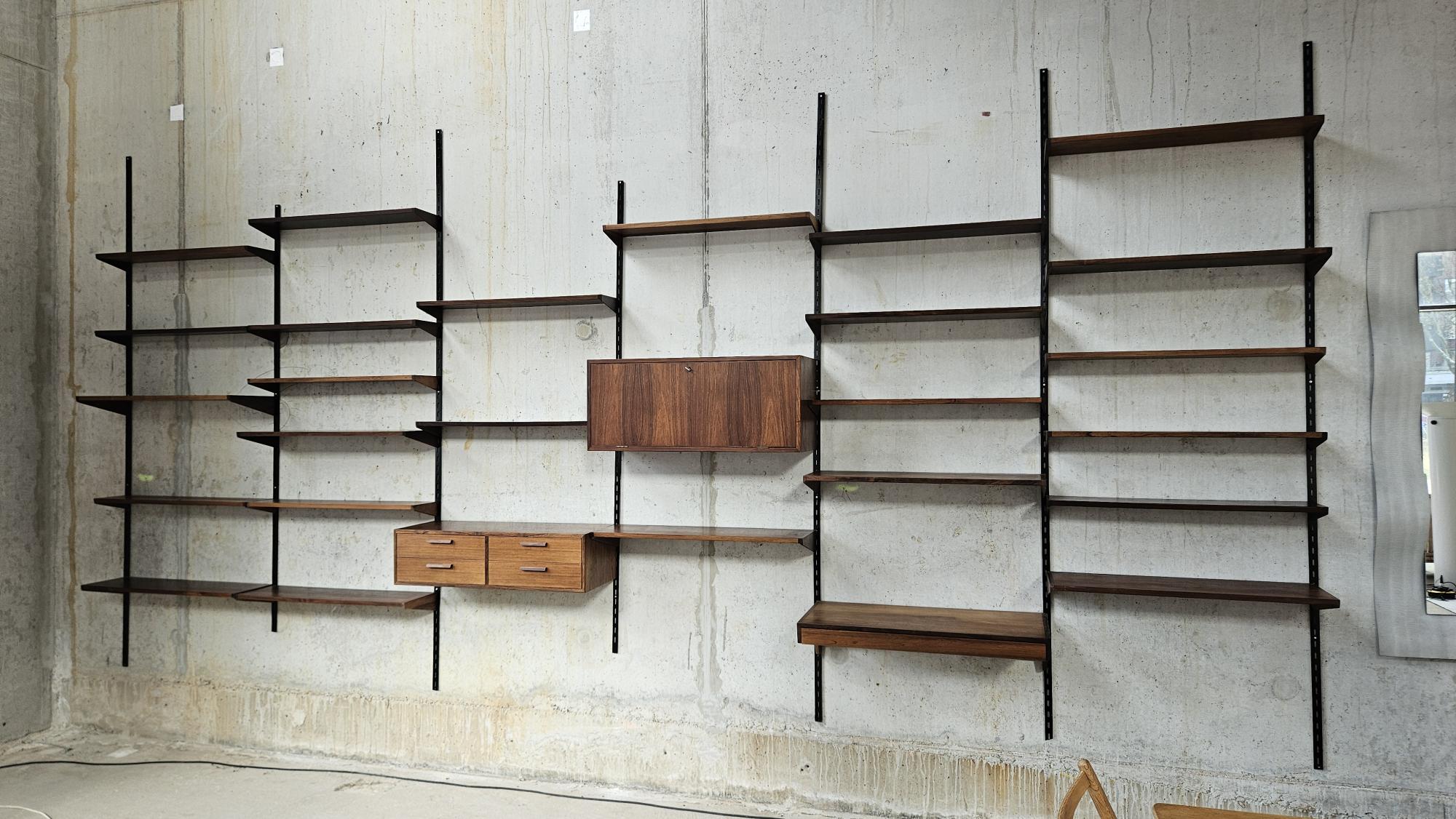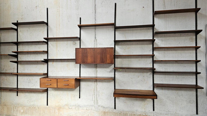 Discover the timeless elegance and functionality of the modular dark wood wall system, Designed by renowned designer Kai Kristiansen for FM Møbler. This versatile piece of furniture is a true asset to any interior, offering a combination of style and practical storage solutions. The system consists of various components: a cabinet with a flap door, a cabinet with four drawers, a desk with a drawer, and several shelves in large, medium, and small sizes. The warm appearance of the dark wood brings an atmosphere of luxury and comfort to your living or working space.