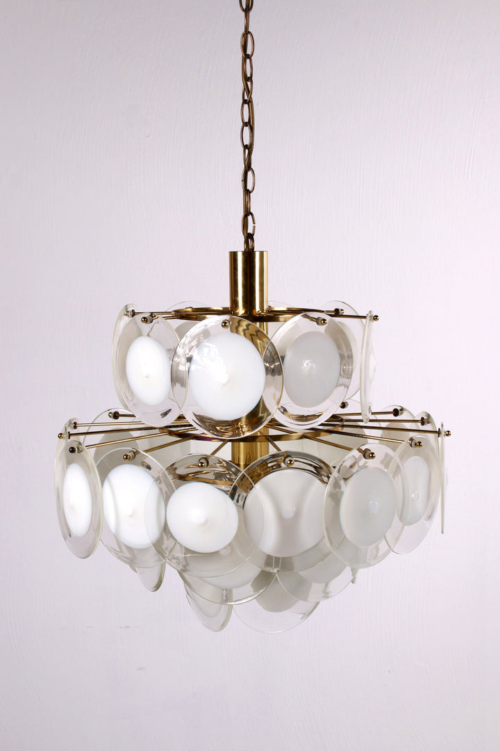 This stunning chandelier features 36 hand-blown crystal Murano glass discs, creating a dazzling display of light and color. Crafted in Italy in the 1960s, it boasts a classic chrome frame and a chandelier design that reflects the elegance and craftsmanship of Murano glass artistry. The chandelier is designed to hold 8 bulbs, though it can accommodate fewer, allowing for flexible lighting options.