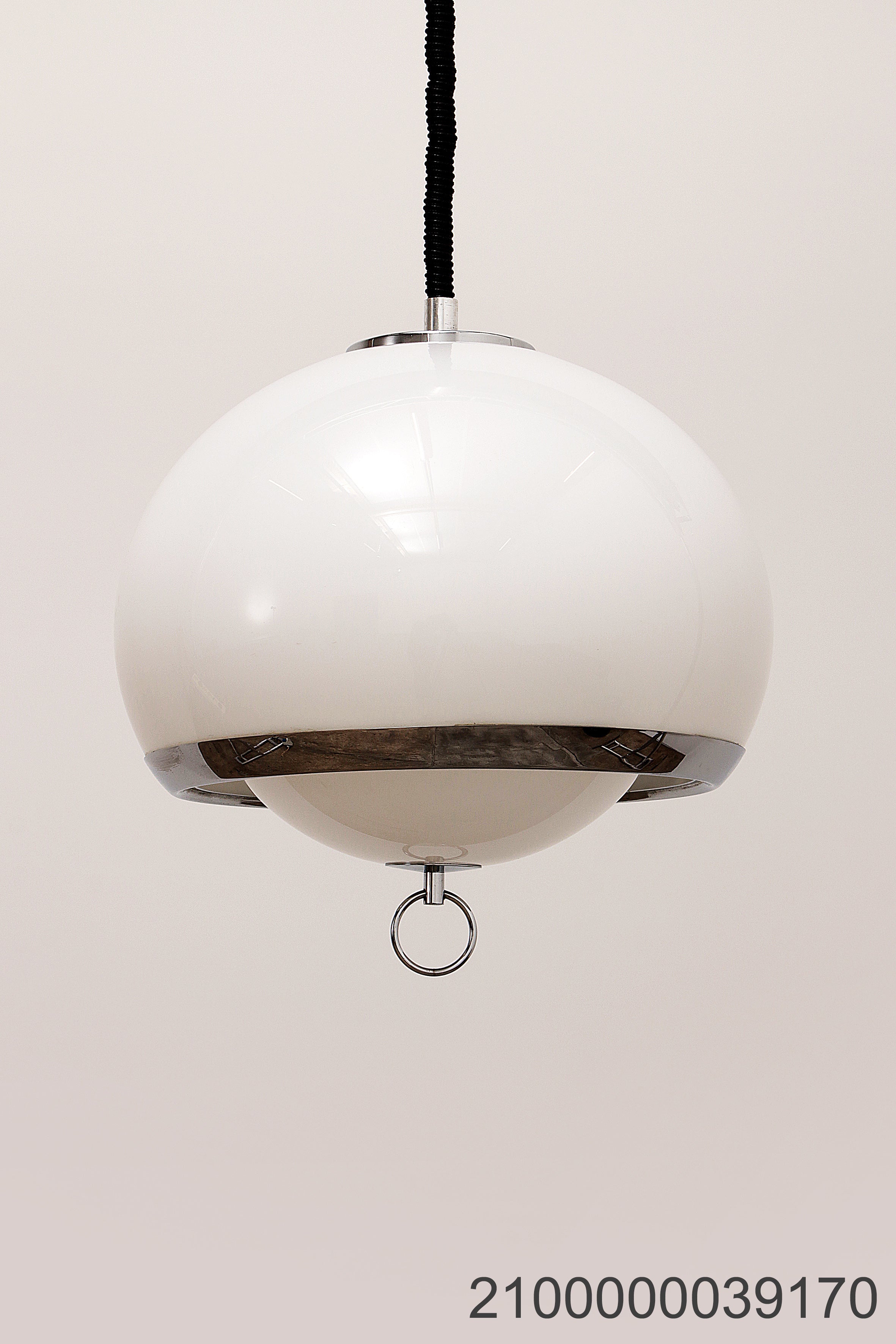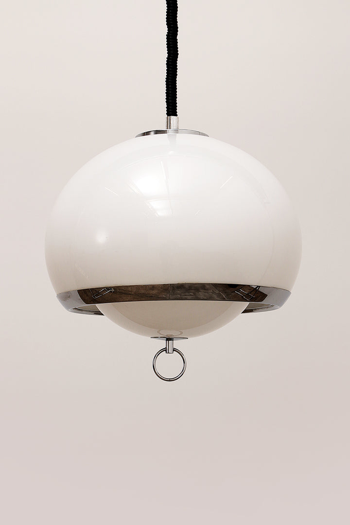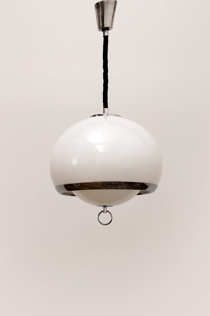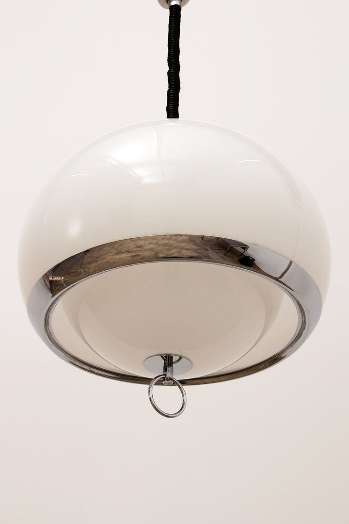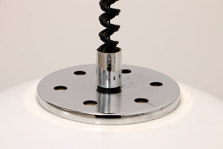 This captivating German pendant lamp from the 1960s embodies the iconic Space Age style, with its sleek opaline color and silver trim. The lamp features a unique design with one large and one smaller globe nested together, creating a harmonious and futuristic look. The lamp is suspended by an adjustable accordion cord, allowing you to customize the height from 80 cm to 135 cm, making it both functional and stylish.