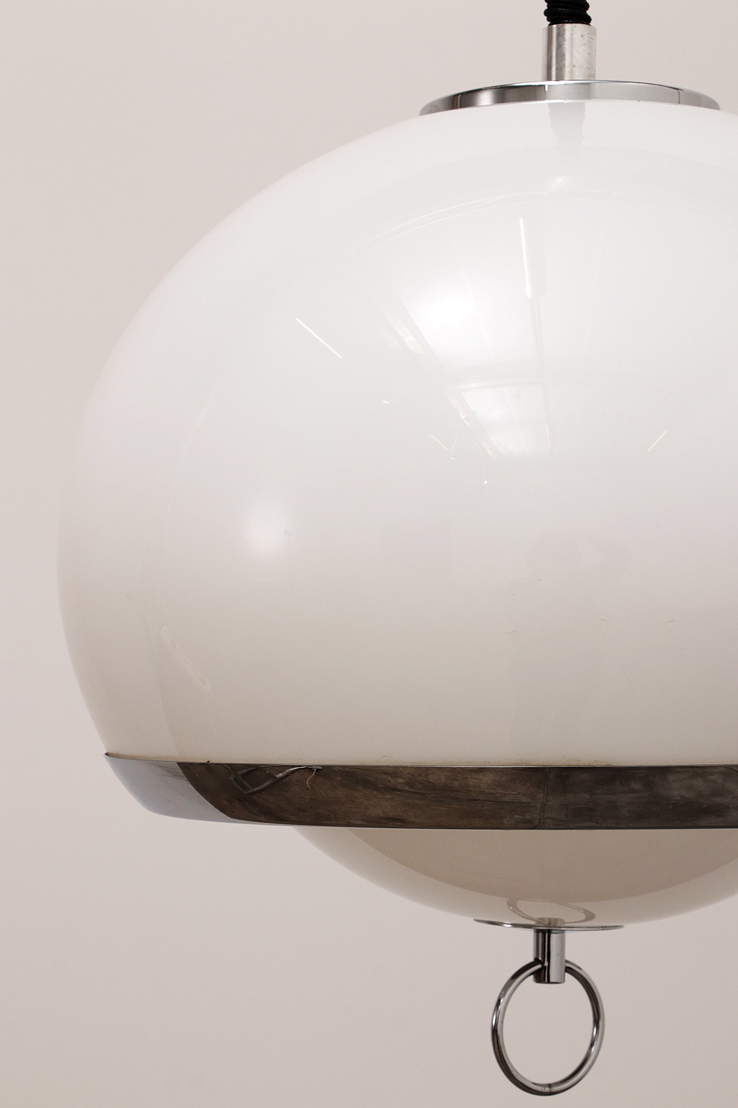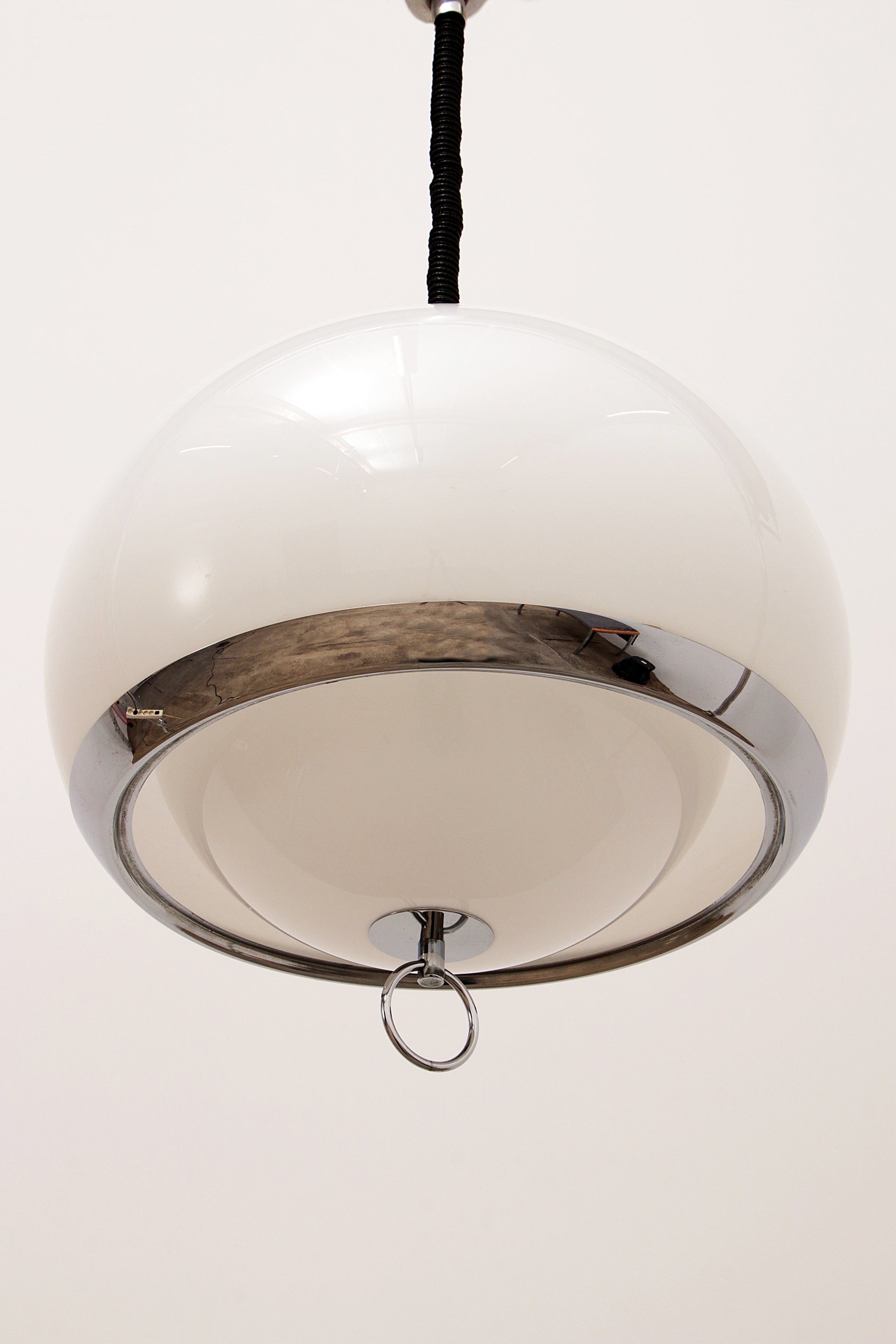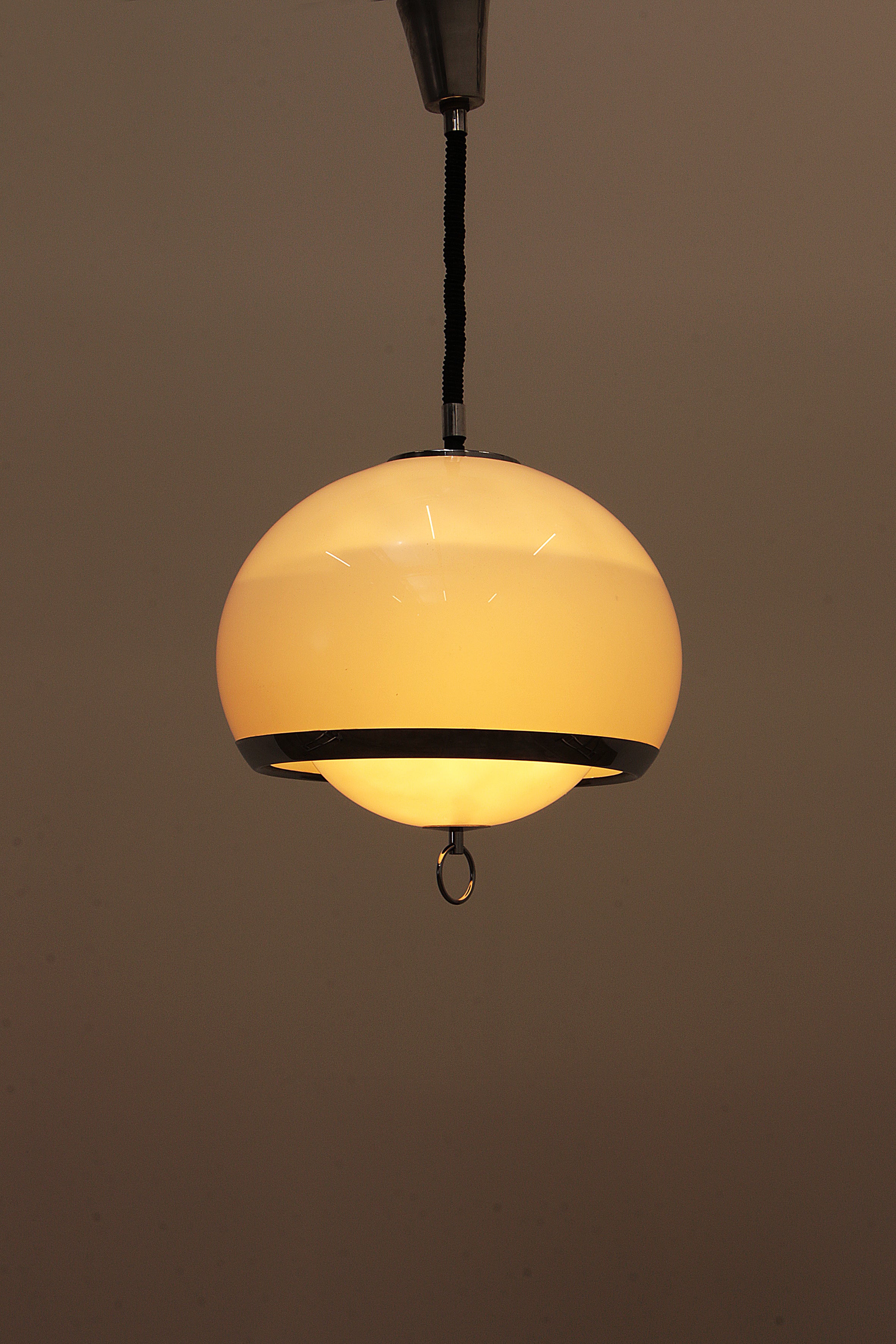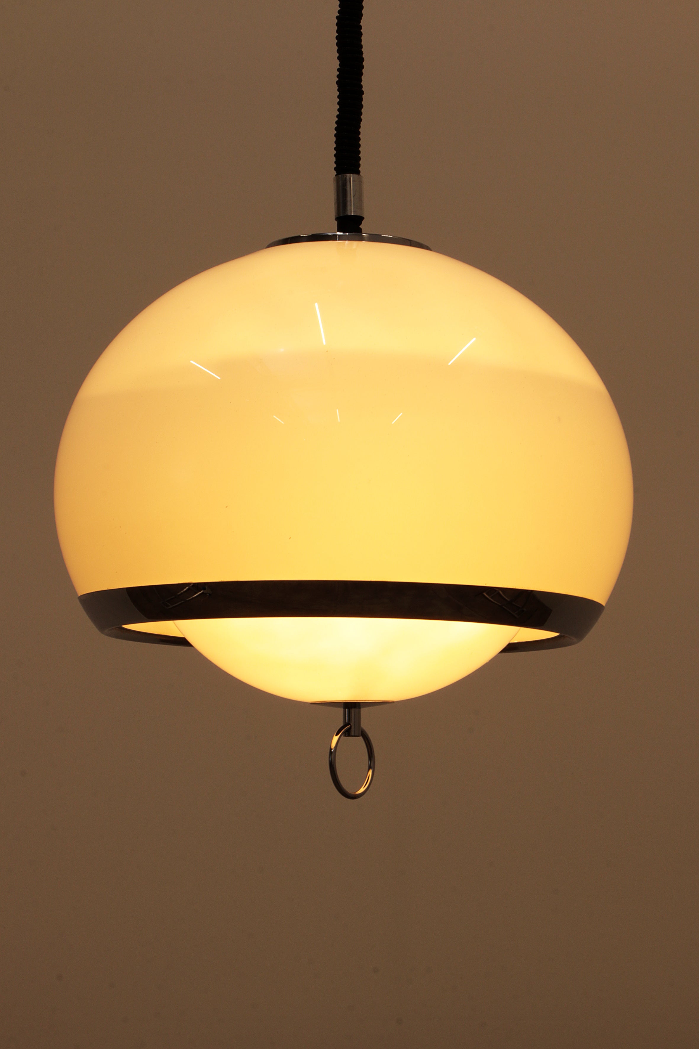 This captivating German pendant lamp from the 1960s embodies the iconic Space Age style, with its sleek opaline color and silver trim. The lamp features a unique design with one large and one smaller globe nested together, creating a harmonious and futuristic look. The lamp is suspended by an adjustable accordion cord, allowing you to customize the height from 80 cm to 135 cm, making it both functional and stylish.
