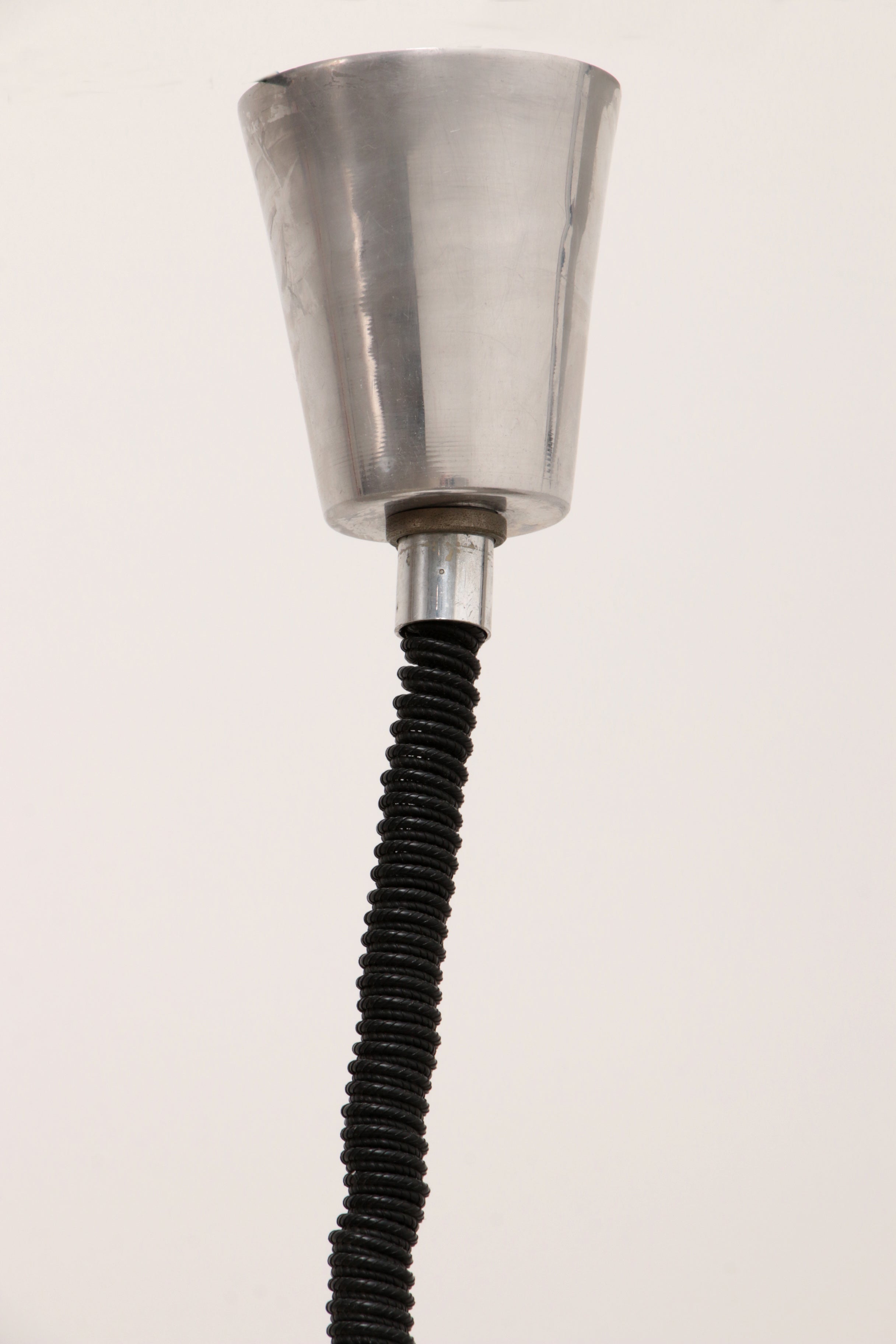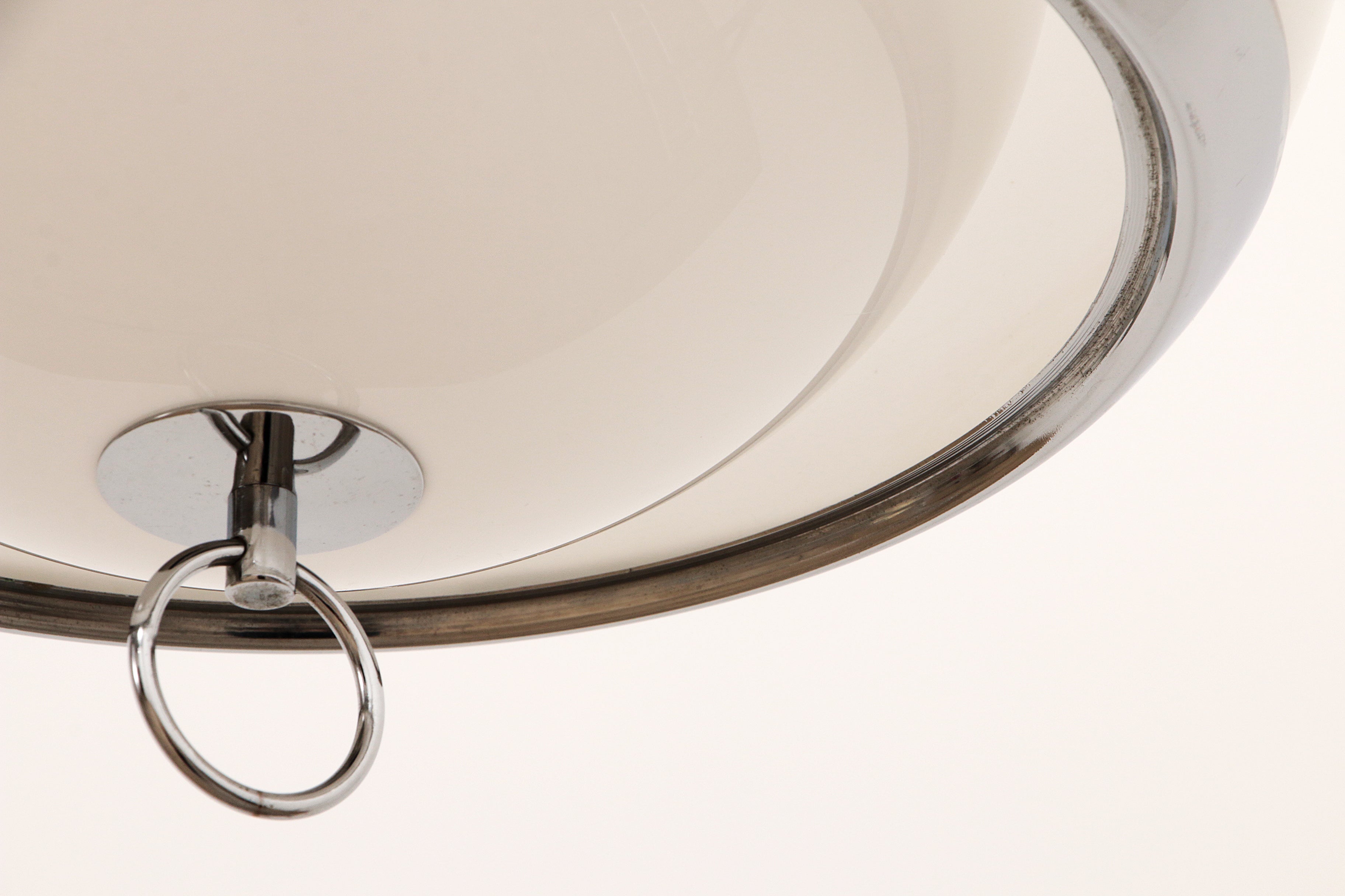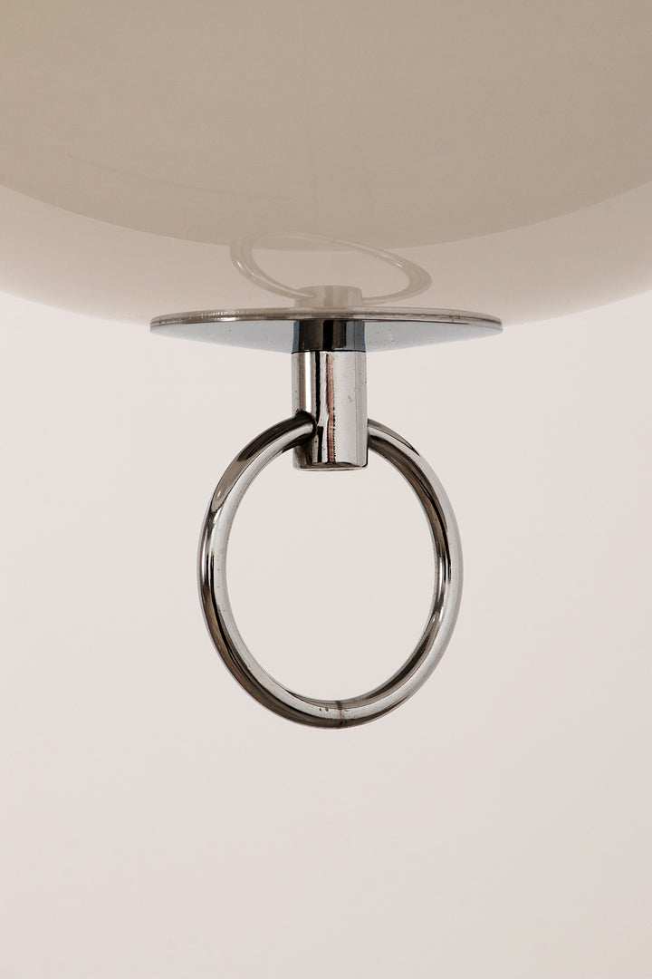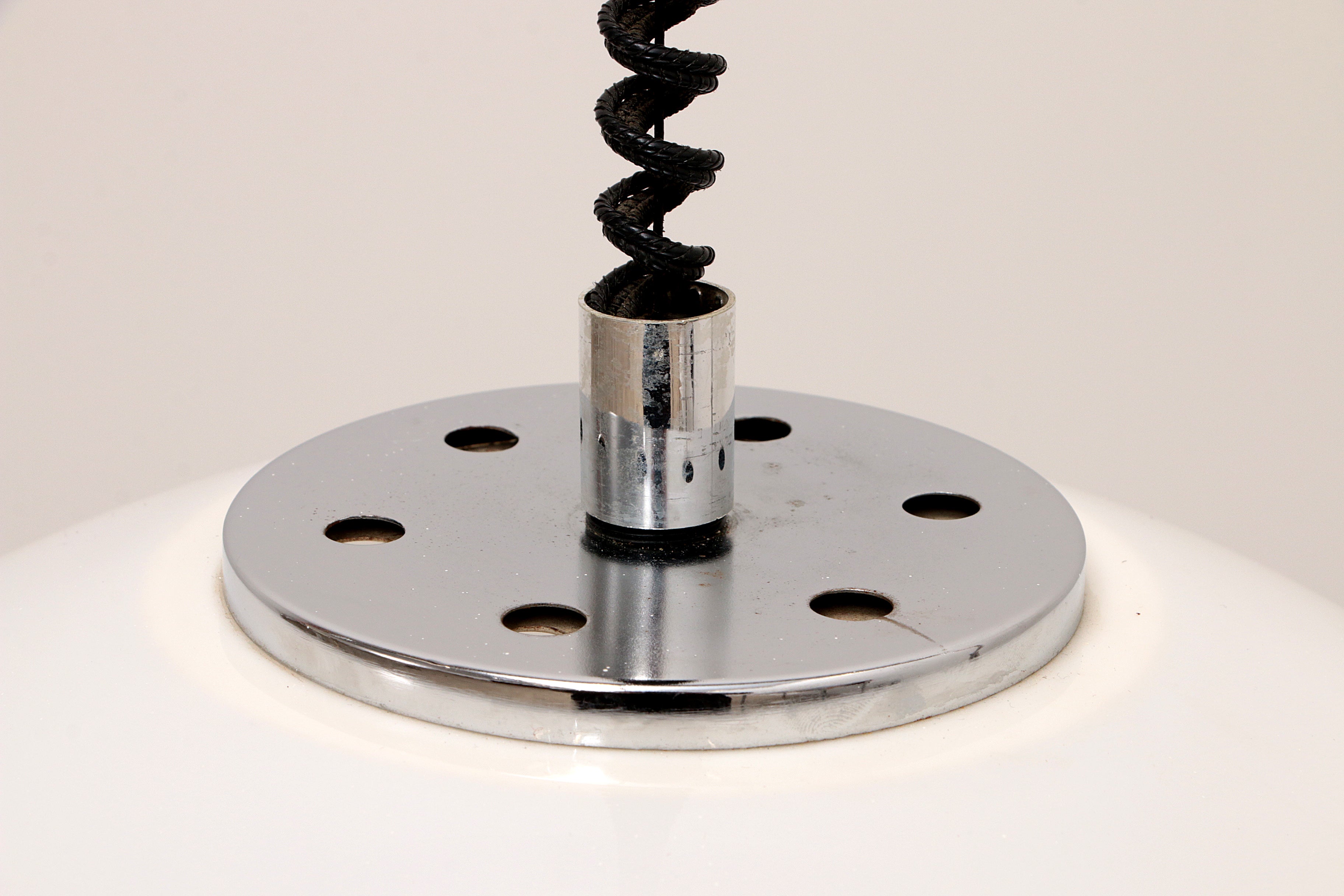 Space Age design is characterized by its use of materials such as chrome metal, brushed aluminum, opal glass, ABS, and transparent plastics, often blending with minimalist yet striking forms. This lamp perfectly captures the spirit of the era, offering a timeless addition to any interior.