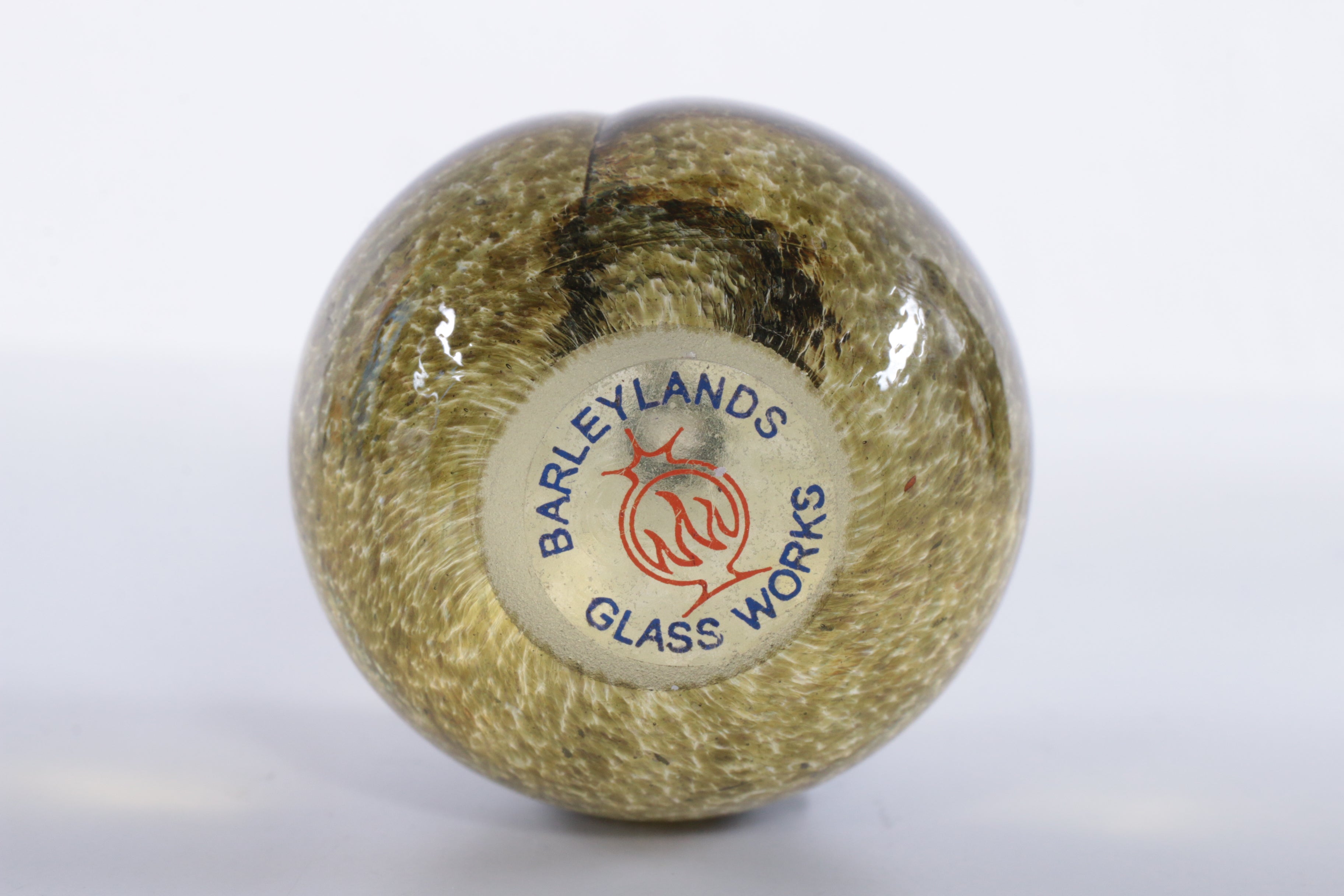 This stunning glass paperweight, crafted by Barley Lands Glass Works, is a true piece of art. The design features a delicate green peach, elegantly suspended in clear glass, showcasing the craftsmanship of the 1960s. Though originally created to hold papers in place, this paperweight has transcended its practical use, becoming a cherished collectible. Its unique design and vivid colors make it an excellent addition to any collection, combining function with beauty.