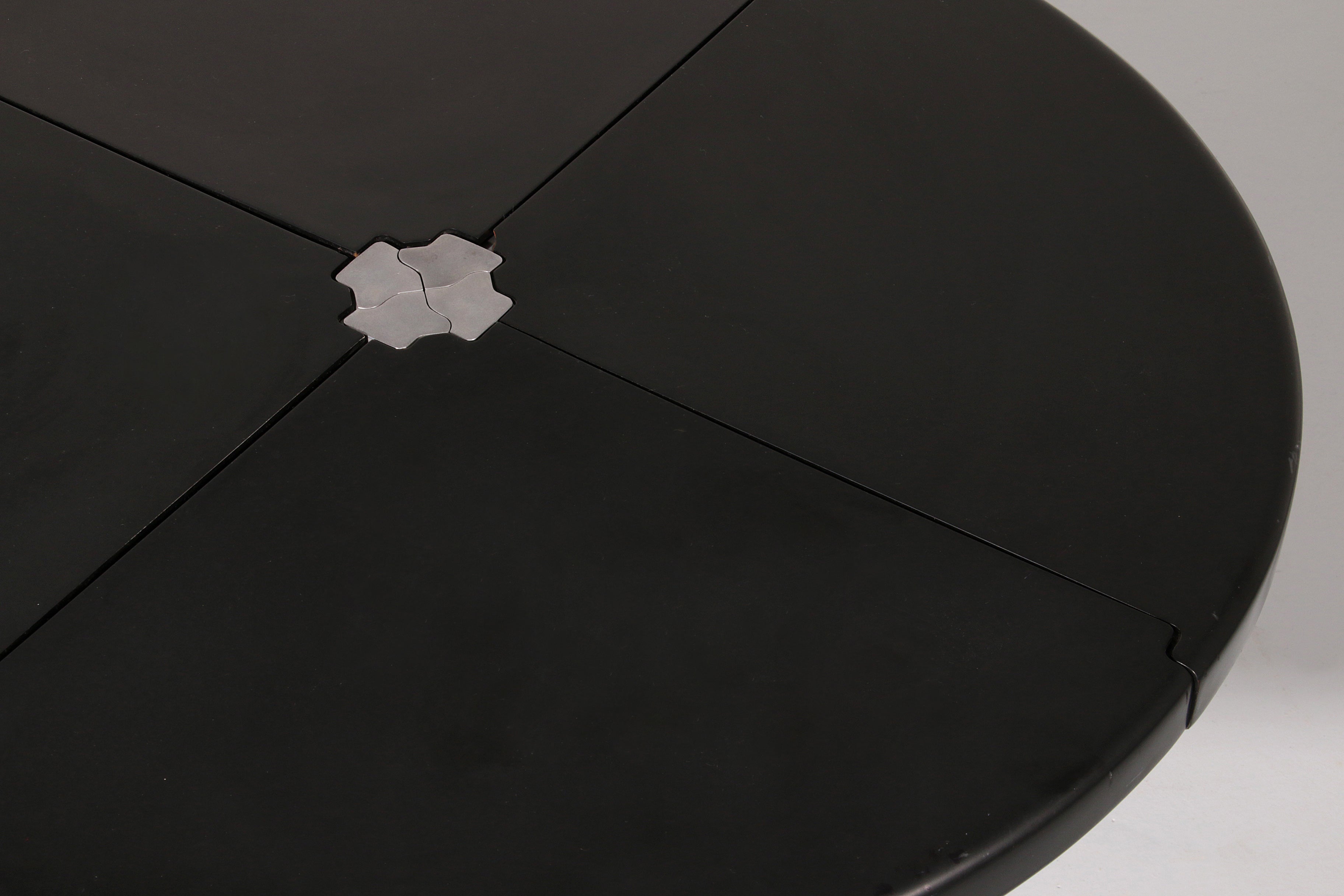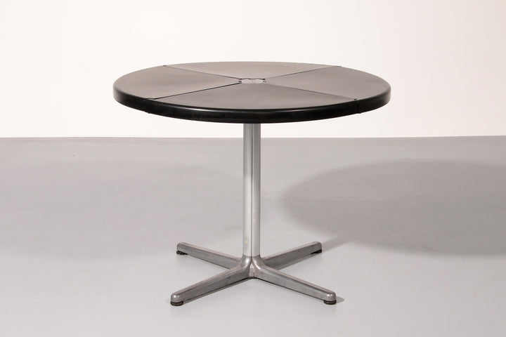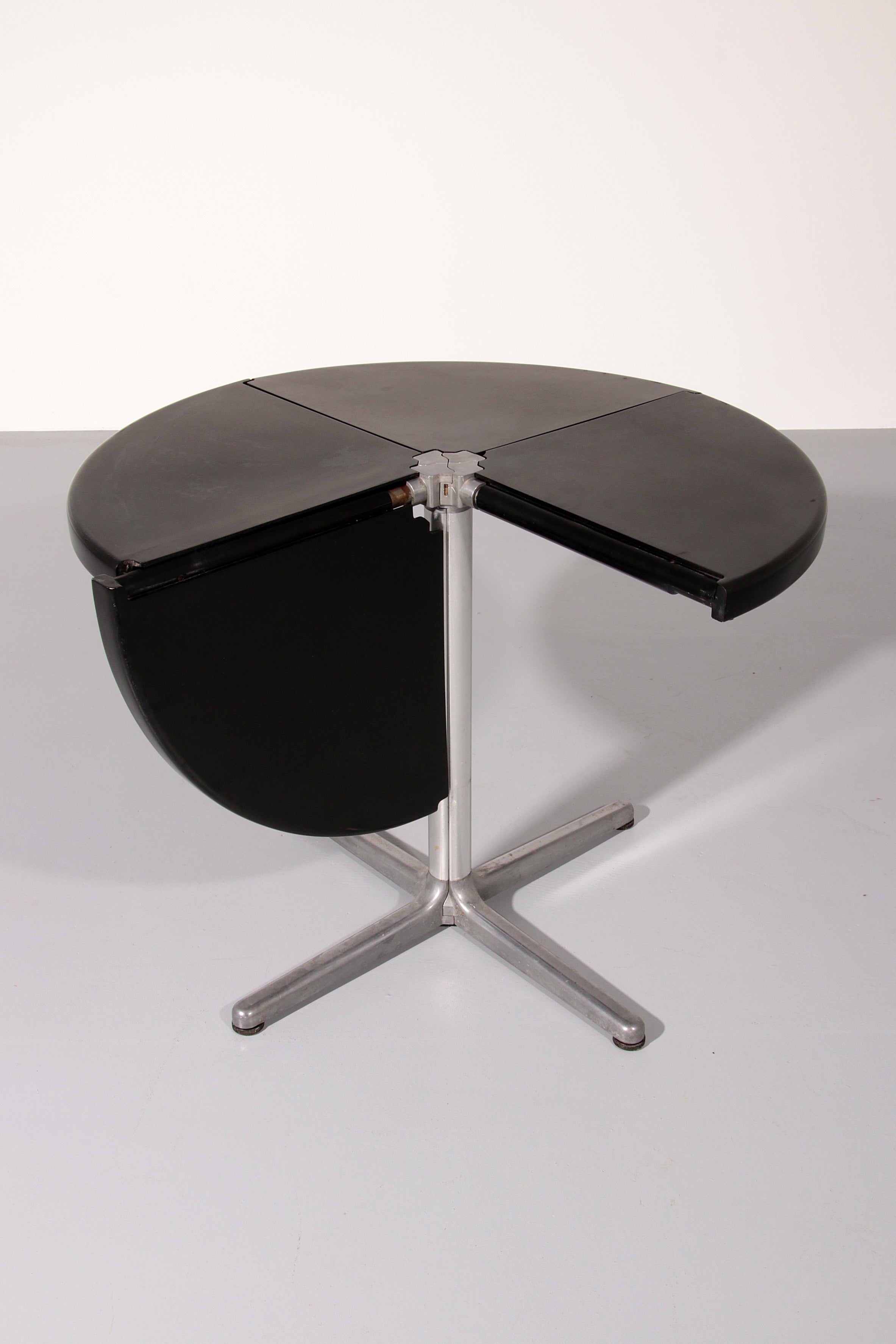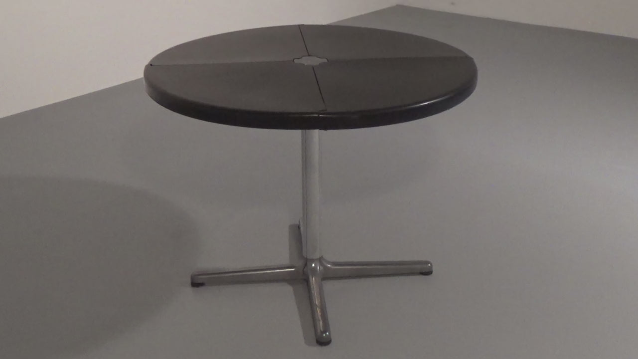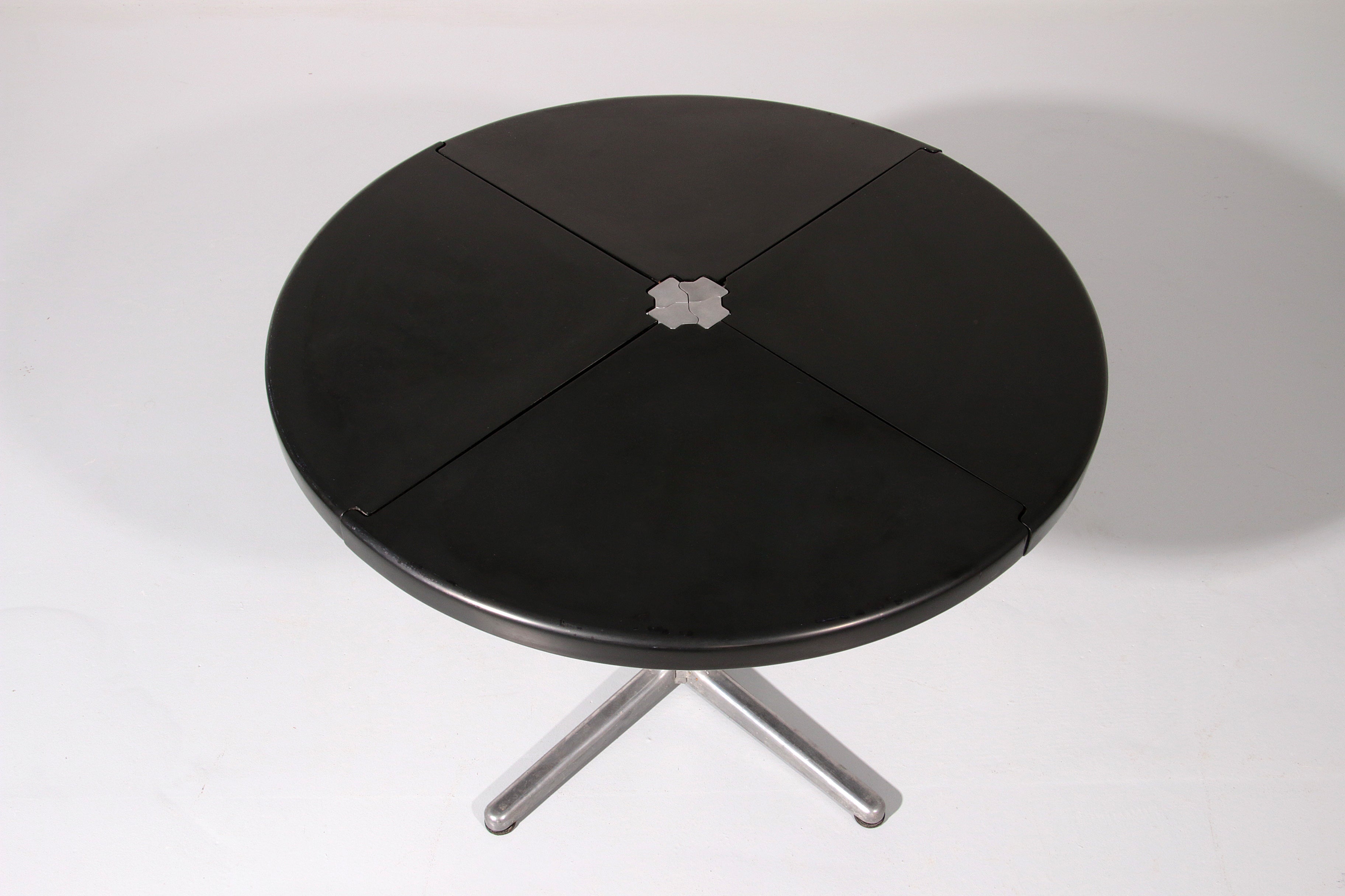 This exceptional dining game table is a striking example of Italian modern design from the 1970s, created by renowned designer Giancarlo Piretti for Castelli. The molded black plastic tabletop is ingeniously divided into four sections that fold and swivel, allowing the table to transform effortlessly from a generous playing or dining surface into a compact sculptural form for storage. Resting on a sleek aluminum pedestal base, the table combines visual lightness with structural stability. The original Castelli label confirms its authenticity and highlights its importance as a collectible design object. Both playful and architectural, this piece perfectly reflects the experimental spirit of Italian design in the late 20th century and stands as a functional work of art suitable for contemporary interiors.