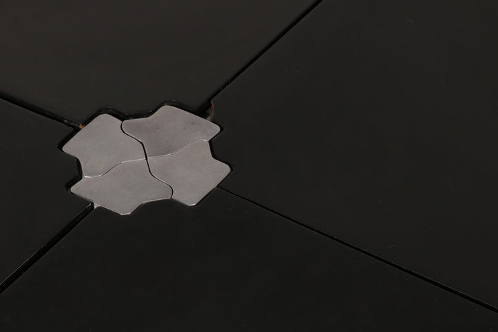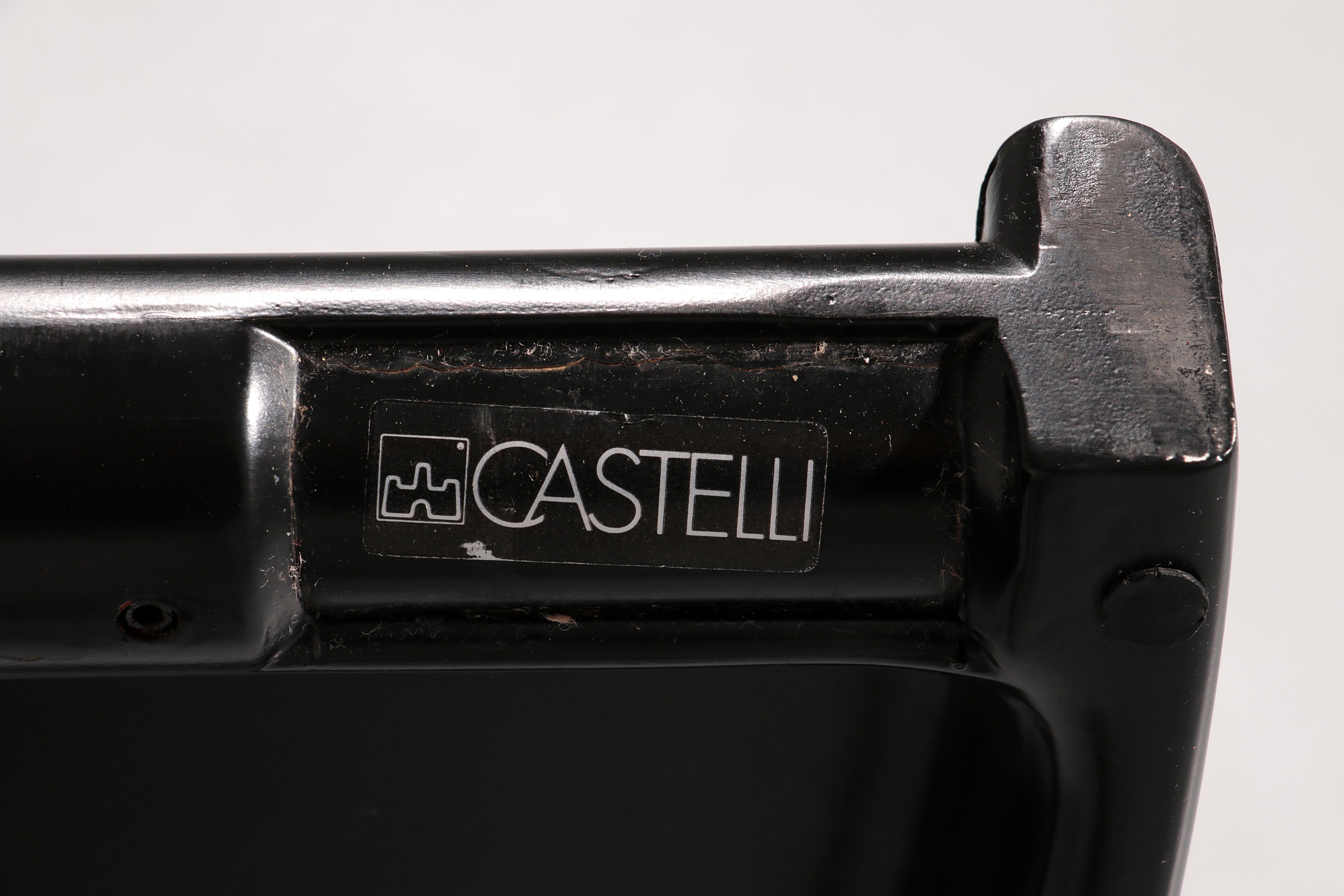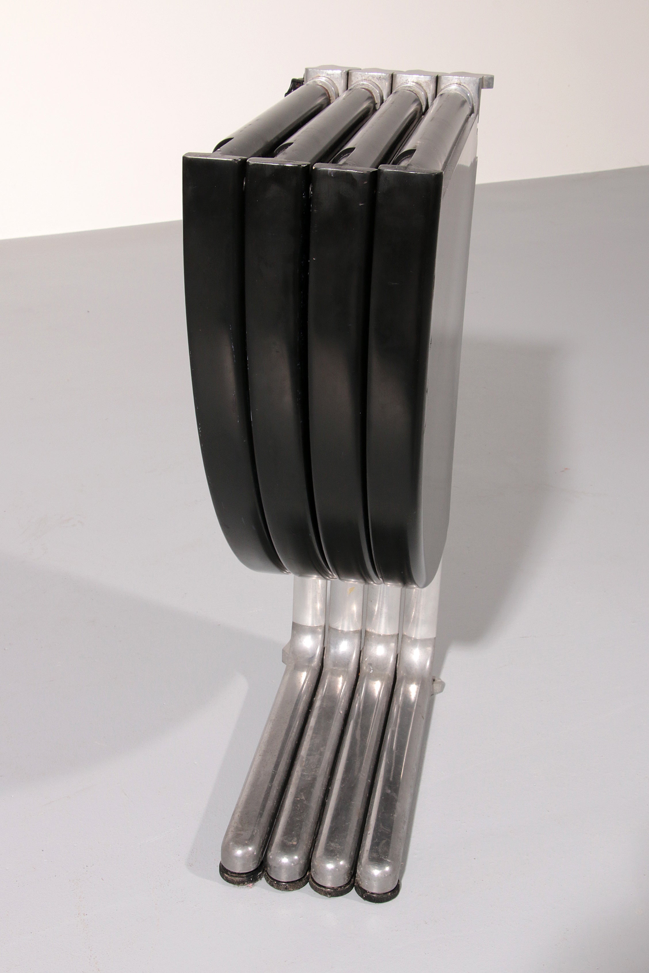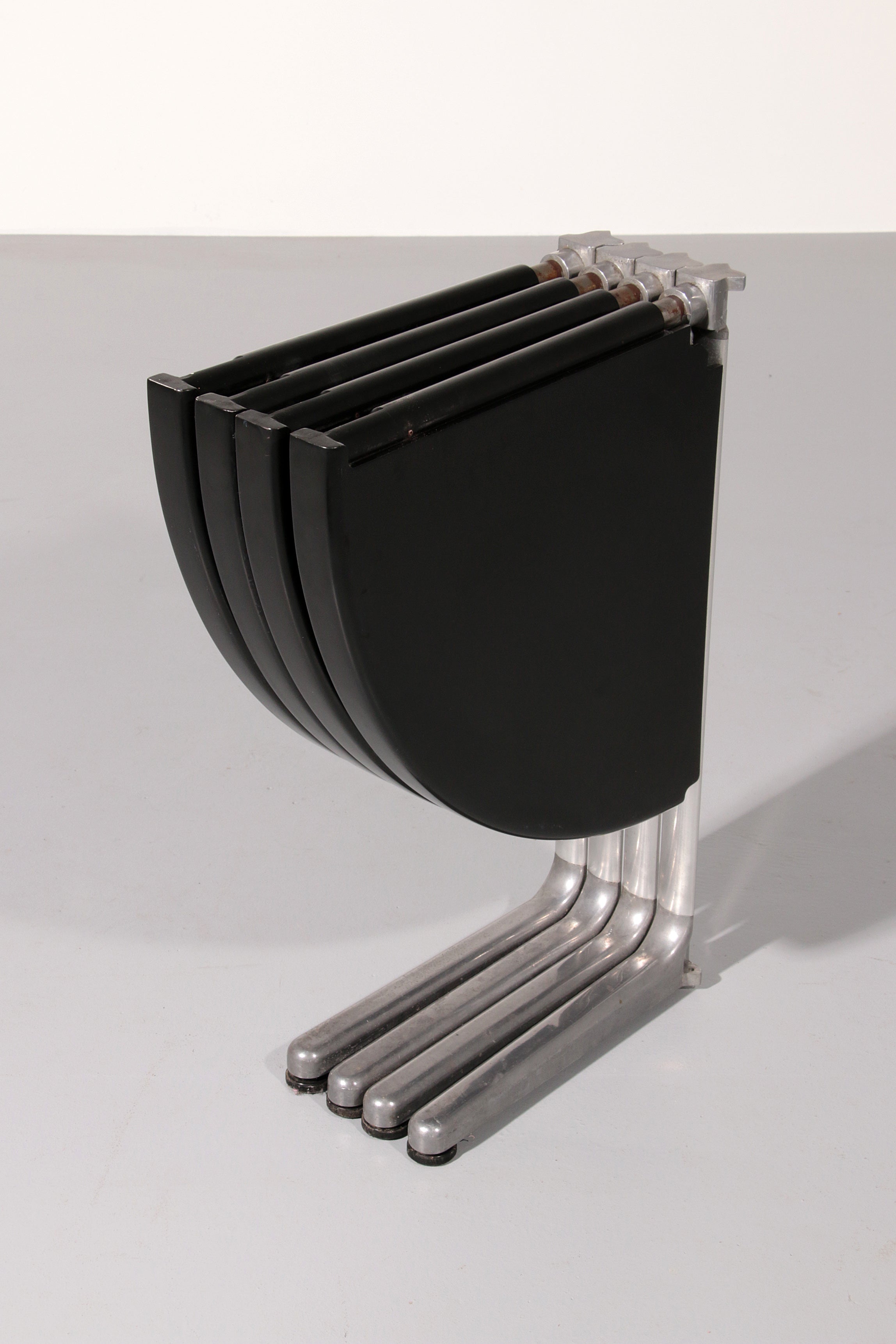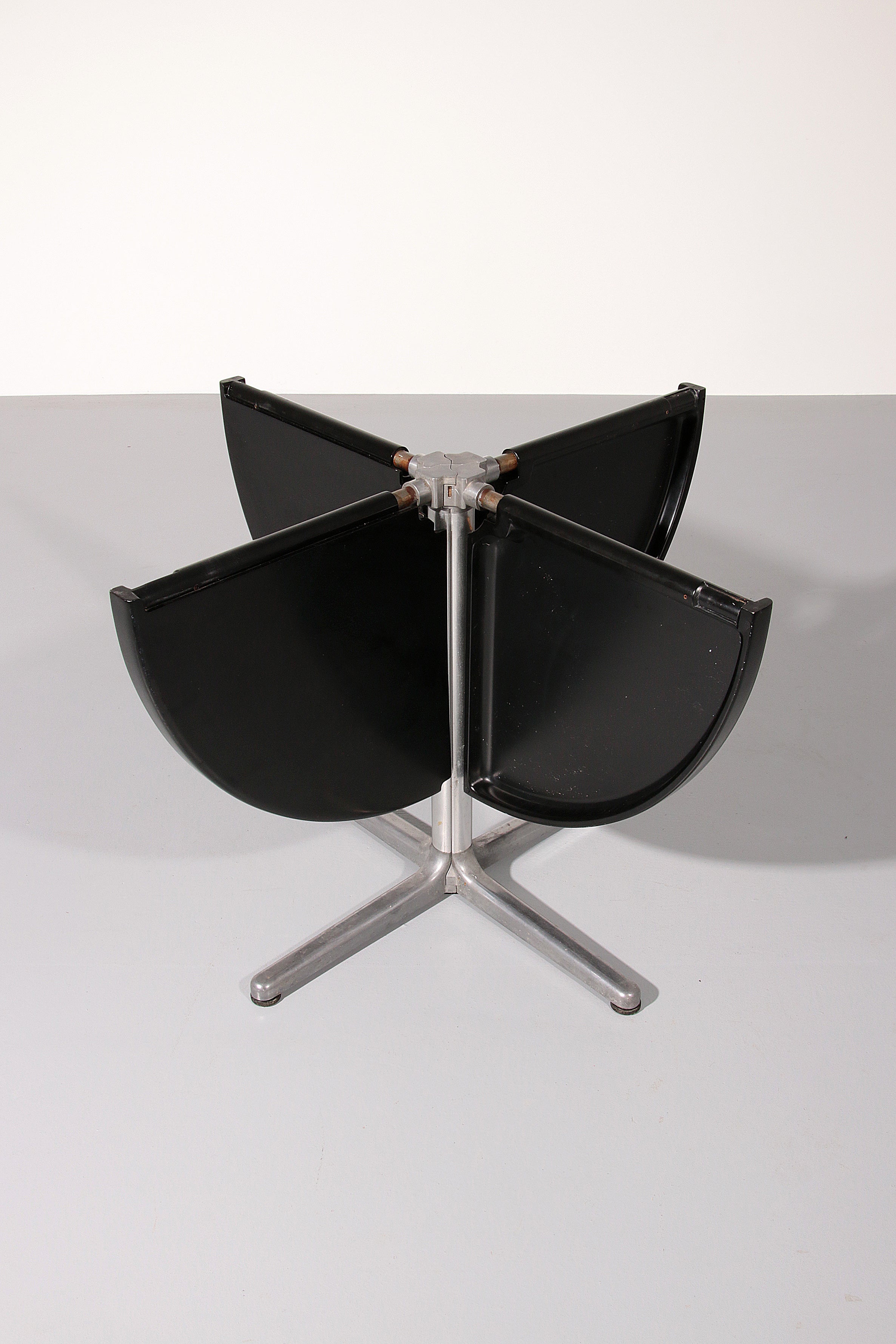 This exceptional dining game table is a striking example of Italian modern design from the 1970s, created by renowned designer Giancarlo Piretti for Castelli. The molded black plastic tabletop is ingeniously divided into four sections that fold and swivel, allowing the table to transform effortlessly from a generous playing or dining surface into a compact sculptural form for storage. Resting on a sleek aluminum pedestal base, the table combines visual lightness with structural stability. The original Castelli label confirms its authenticity and highlights its importance as a collectible design object. Both playful and architectural, this piece perfectly reflects the experimental spirit of Italian design in the late 20th century and stands as a functional work of art suitable for contemporary interiors.