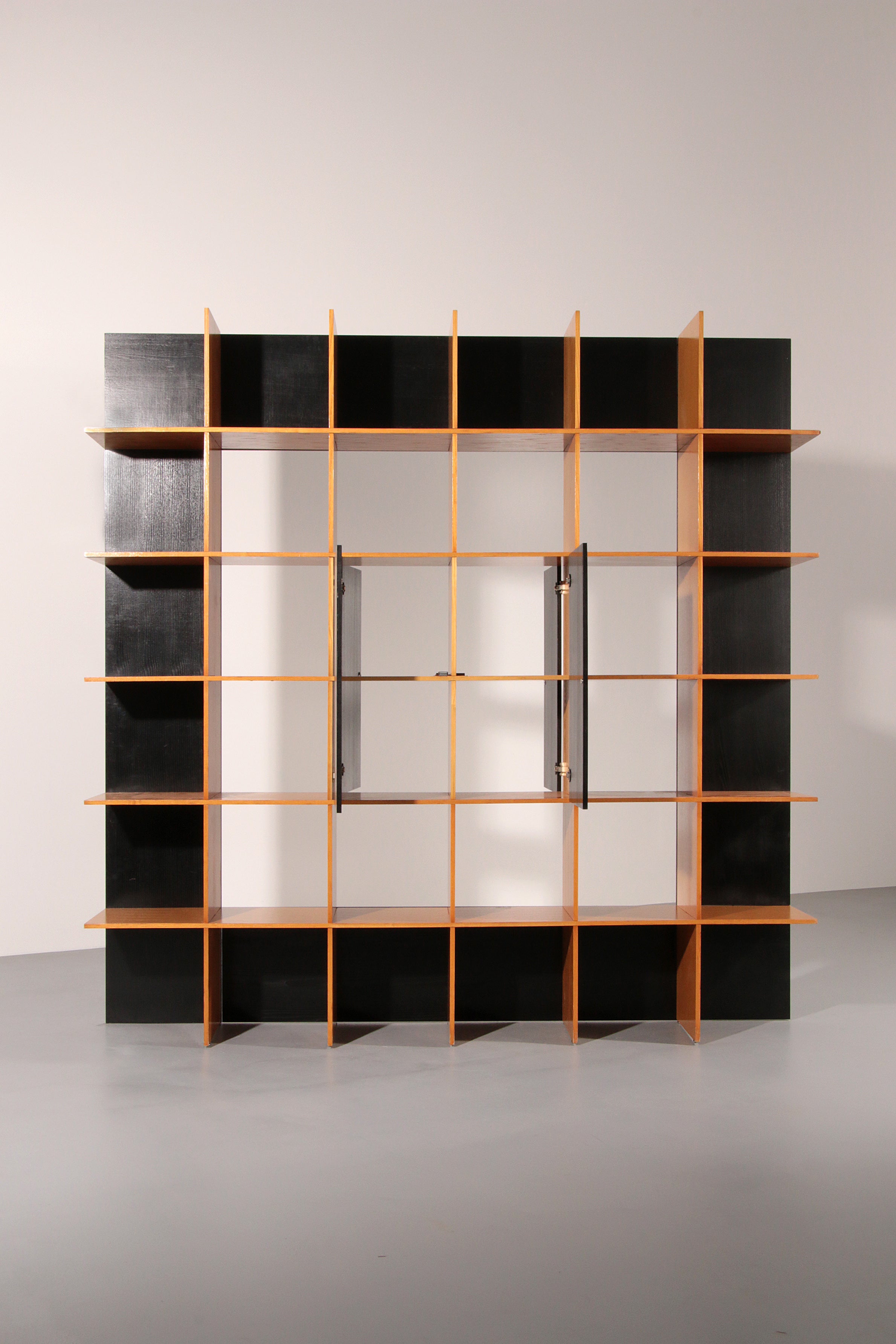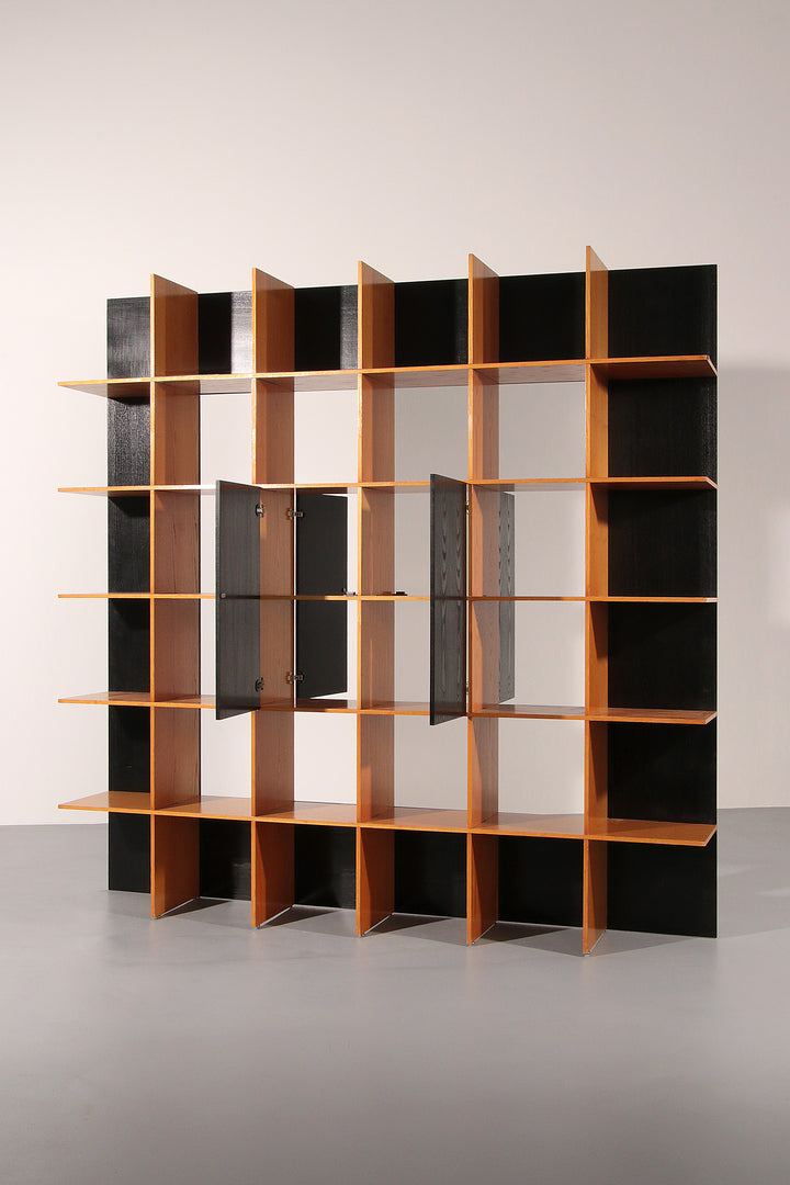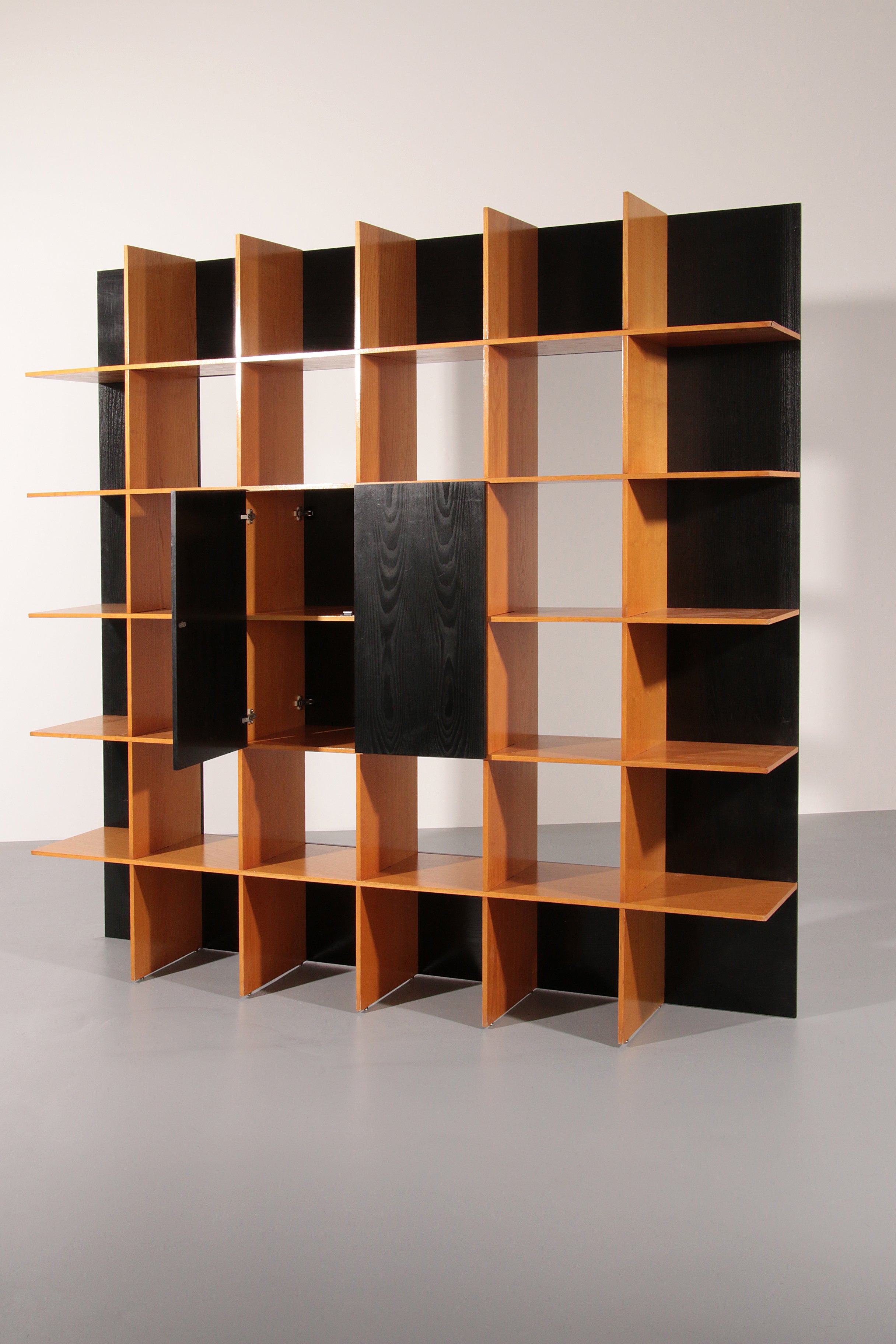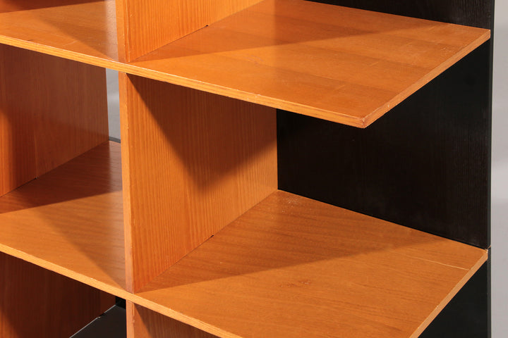 This elegant two-tone bookcase, designed by Roberto Pamio and Renato Toso for Stilwood in 1972, captures the spirit of Italian modernist design. Crafted with natural wood shelves and accented by striking black laminated fronts, it offers a refined yet playful aesthetic. The piece is beautifully constructed with attention to detail, making it equally suitable for storing books or showcasing collectibles. Finished on all sides, it can be placed free-standing in a room, allowing it to be admired from every angle. Its original condition has been preserved, reflecting both quality craftsmanship and timeless style. This bookcase is more than functional storage—it is a design statement.