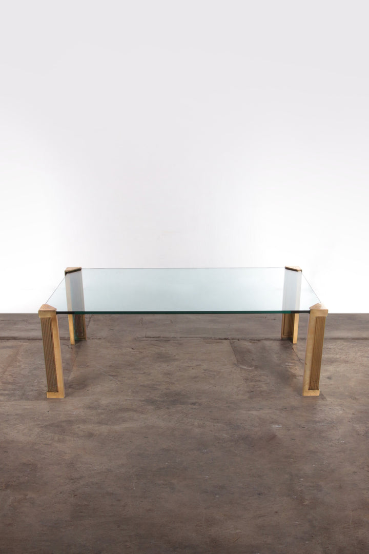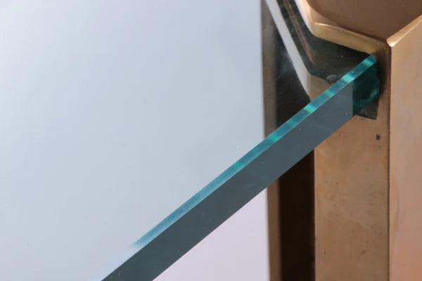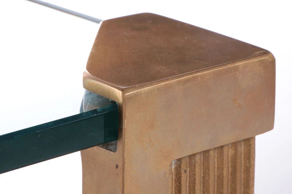 This coffee table seamlessly blends craftsmanship with a unique style, featuring original bronze and brass legs. The 15 mm thick clear glass top adds a durable and stylish touch, ensuring no signs of damage.