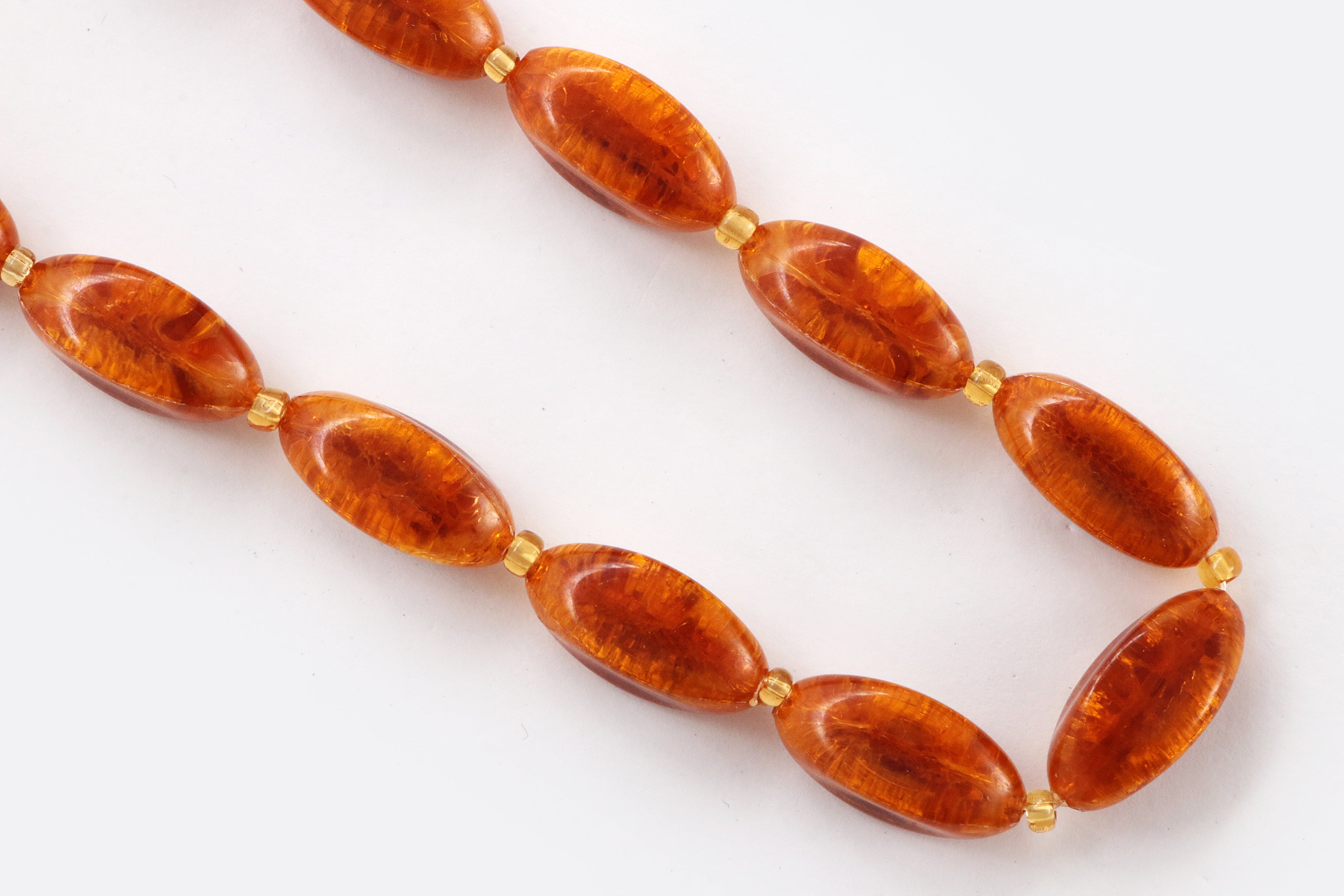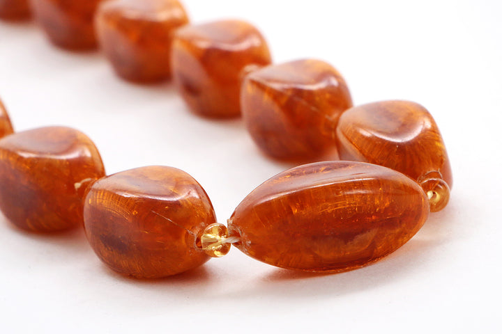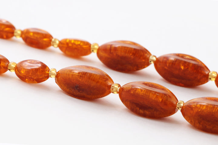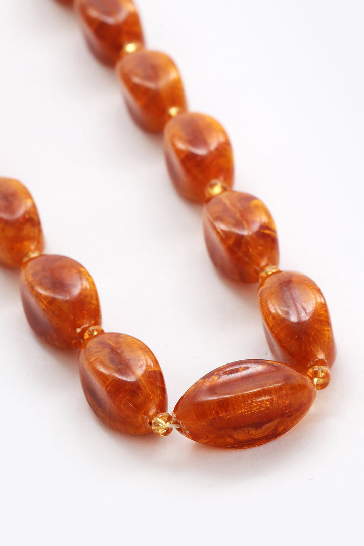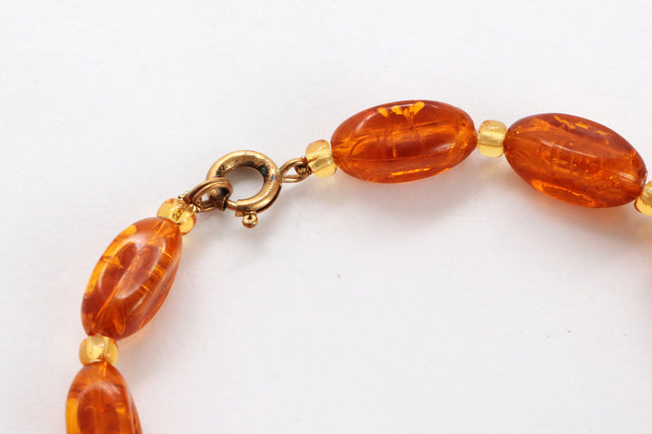 Step into the charm of bygone days with this unique vintage bead necklace. The deep amber color of the beads brings a warm glow that brightens any outfit. Carefully strung with irregular oval beads that evoke the appearance of amber, interspersed with perfectly round beads for a playful effect, this necklace has developed a beautiful patina over the years, adding to its authentic vintage look. A timeless piece that subtly enhances your wardrobe with elegance.
