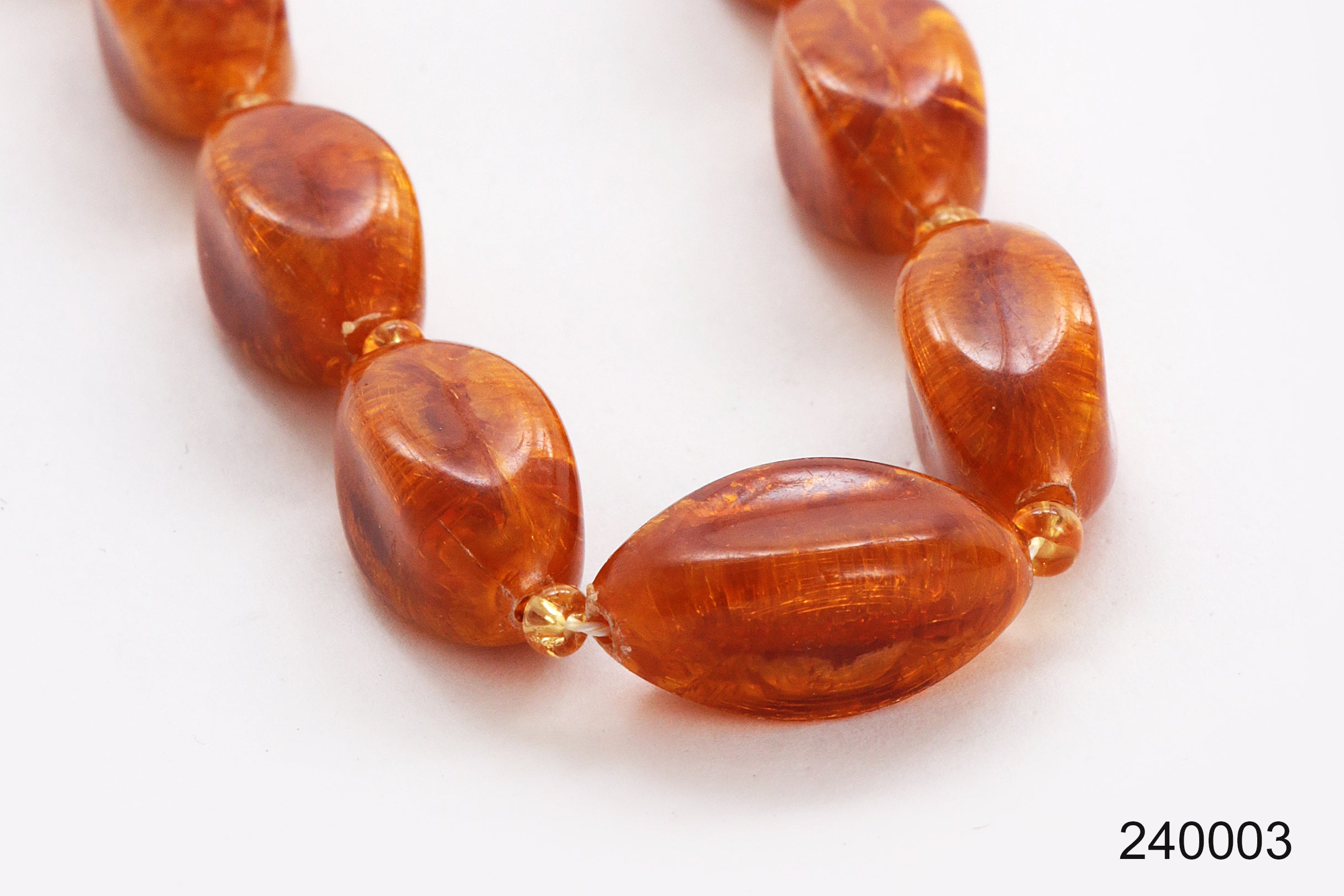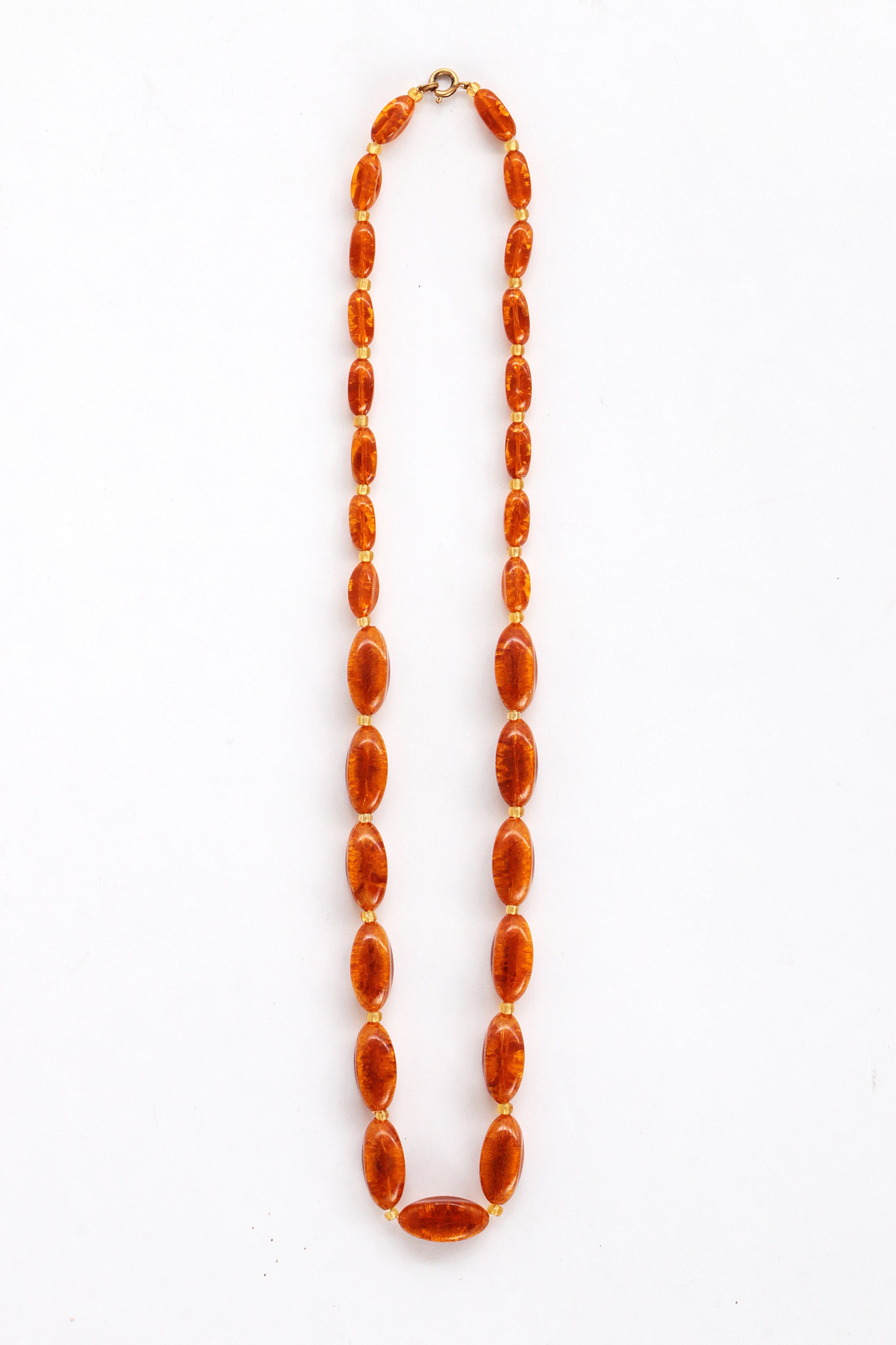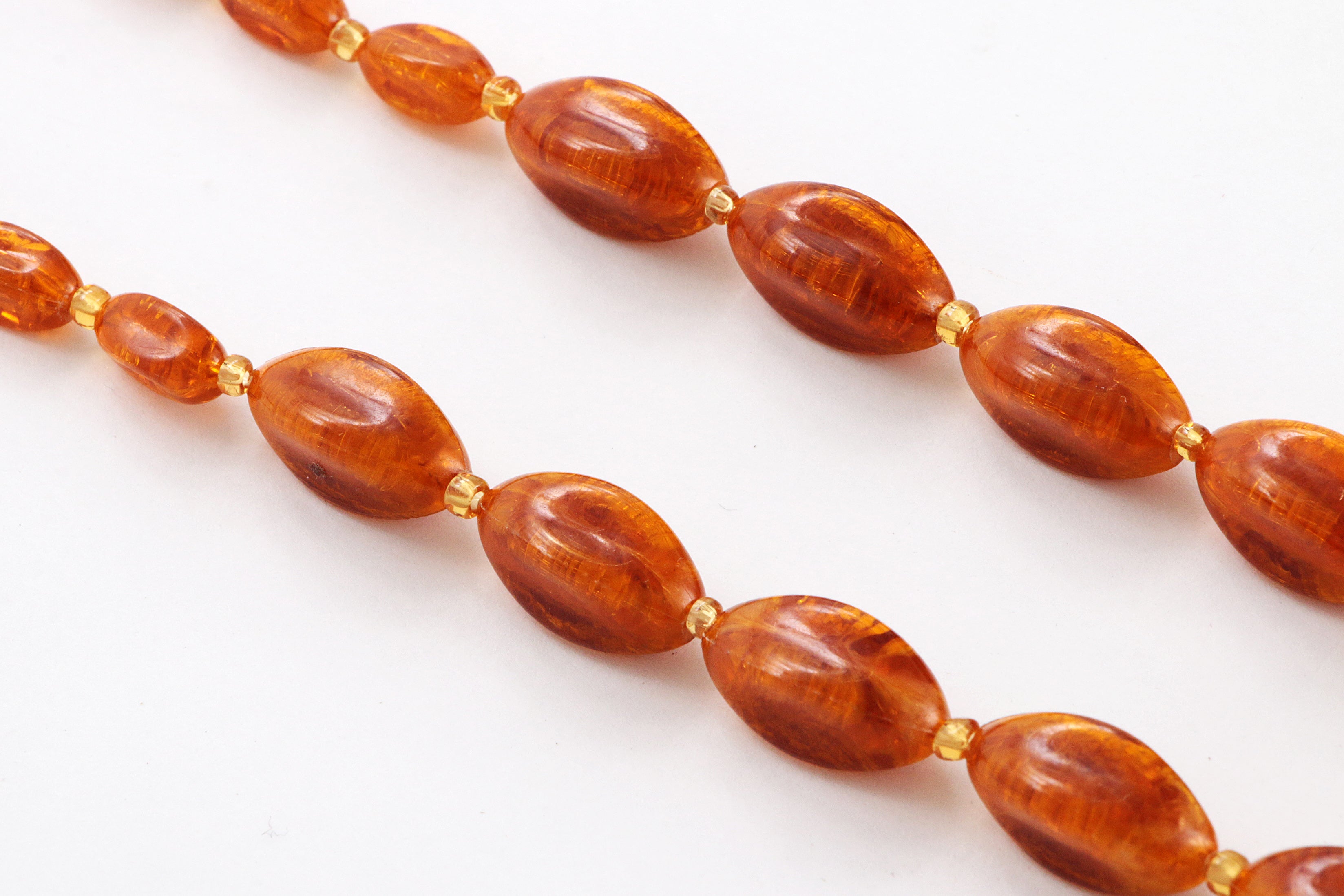 Step into the charm of bygone days with this unique vintage bead necklace. The deep amber color of the beads brings a warm glow that brightens any outfit. Carefully strung with irregular oval beads that evoke the appearance of amber, interspersed with perfectly round beads for a playful effect, this necklace has developed a beautiful patina over the years, adding to its authentic vintage look. A timeless piece that subtly enhances your wardrobe with elegance.