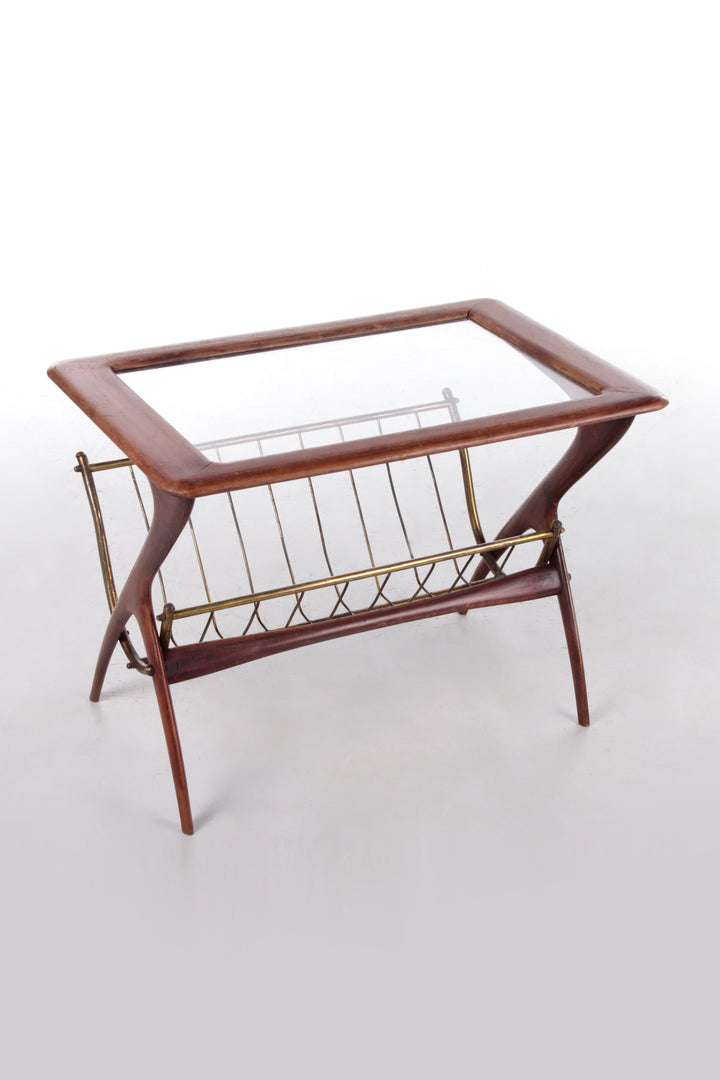 Discover the elegance of mid-century Italian design with this vintage side table by renowned designer Ico Parisi. Crafted in the 1960s, this exquisite piece features lacquered mahogany wood, showcasing a rich, deep brown hue that adds warmth to any room. The table is accentuated with a brass-framed magazine rack, offering both style and functionality. Its clear inlaid glass tabletop provides a sleek surface, while the gracefully curved wooden legs embody the iconic Italian design aesthetic of the era. This decorative and elegant side table is in excellent condition, boasting a beautiful patina that reflects its age and history. It's a perfect addition to any modern home, office, or interior space, blending timeless style with practical use.