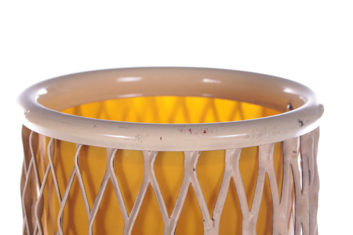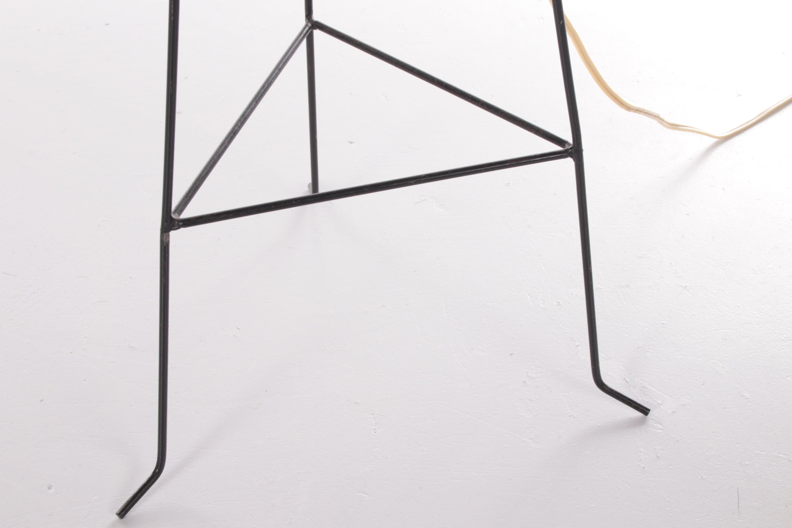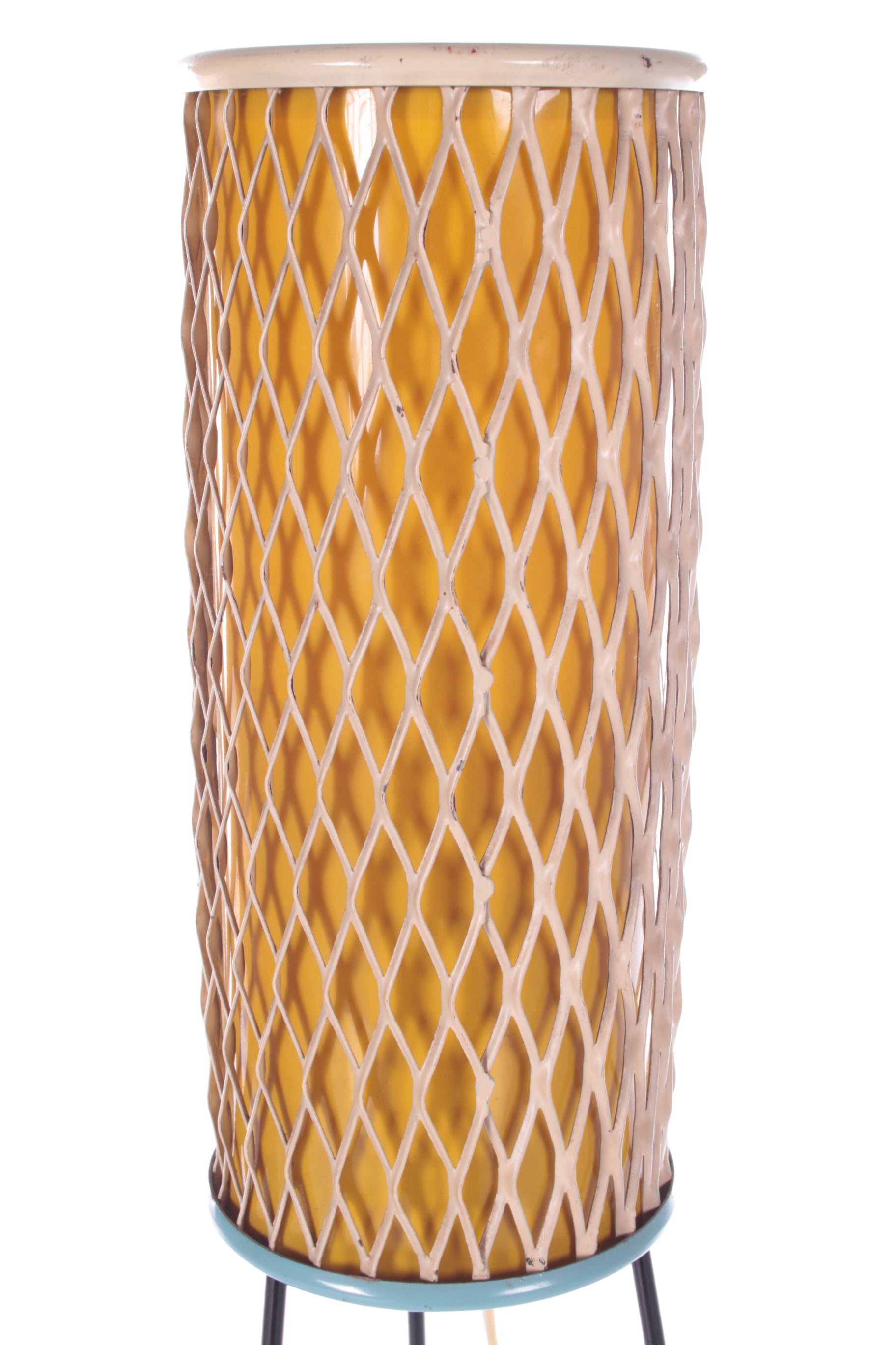 This unique 'Rocket' floor lamp, designed by Josef Hurka in the 1950s for Napako, brings the spirit of the space age into your home. Inspired by the excitement of space exploration, a theme that captivated the 1950s, this lamp’s futuristic design captures the era’s optimism and innovation. The lamp features a playful combination of materials: a yellow plastic shade surrounded by a white metal race mesh, and an iron tripod base in classic black. The tripod design gives the lamp a light, dynamic look, and its sleek, angular shape evokes the image of a rocket soaring through space.