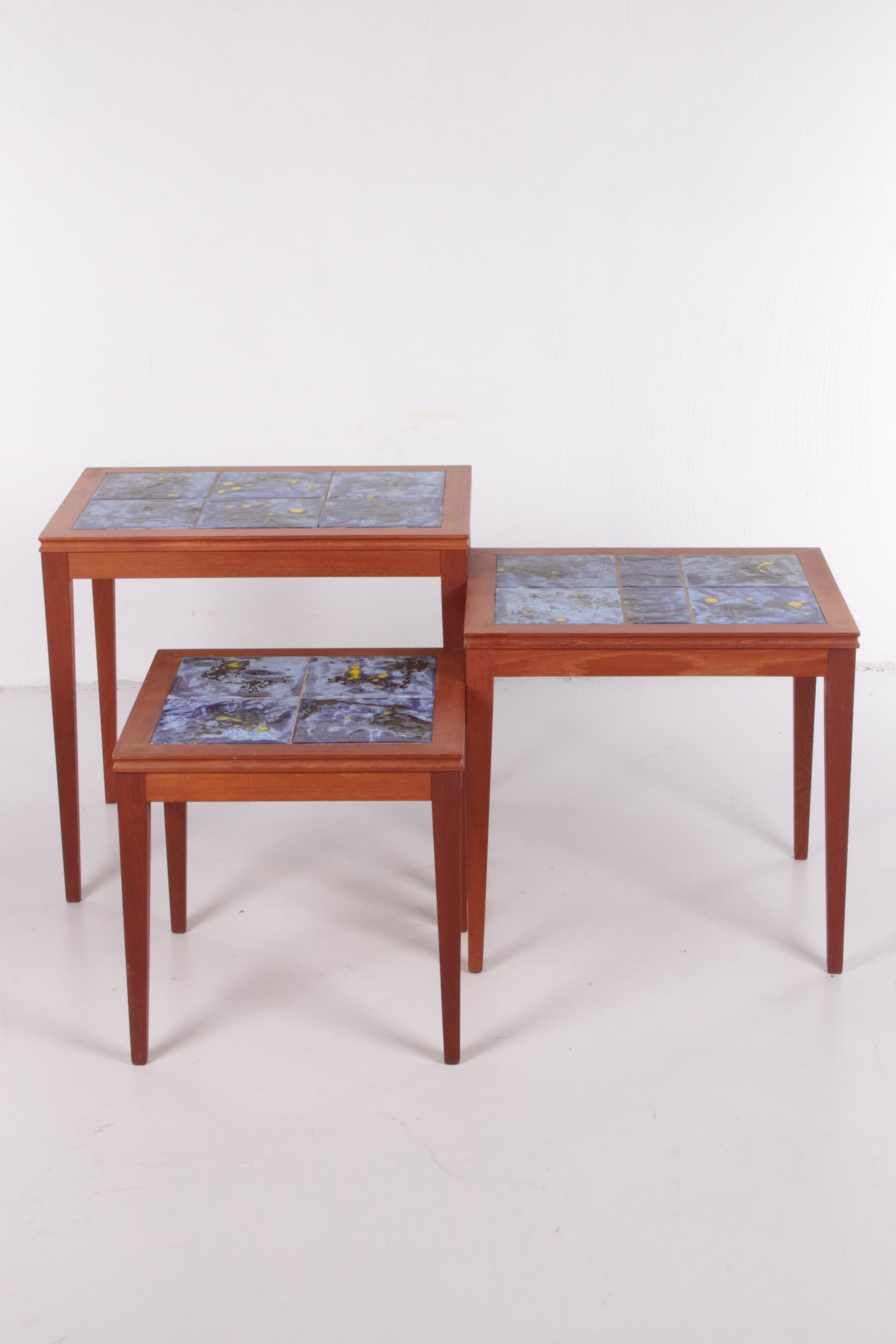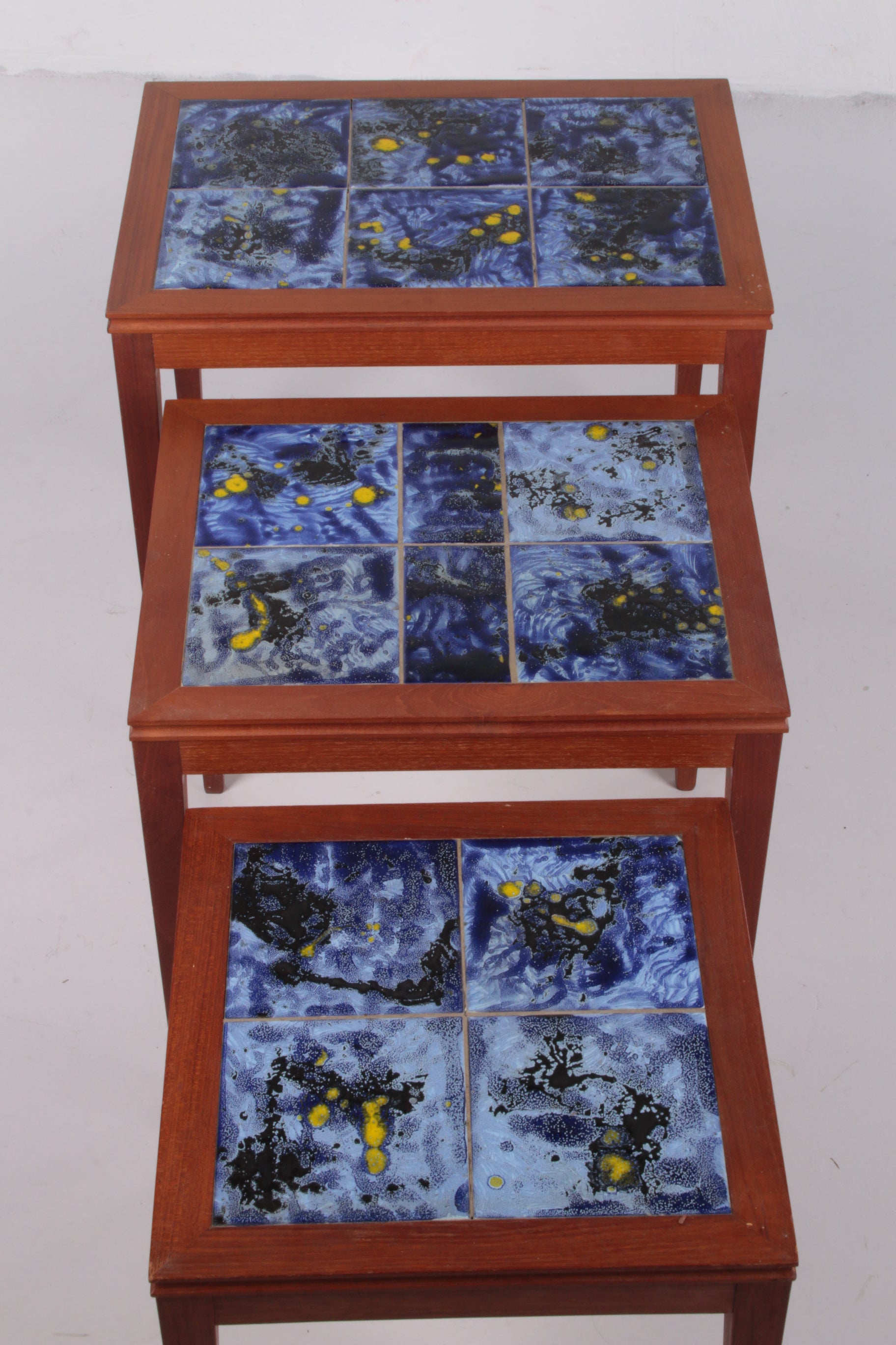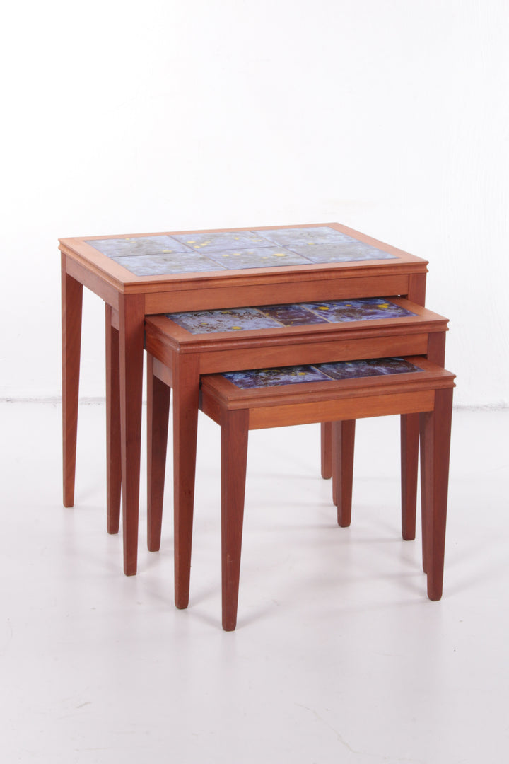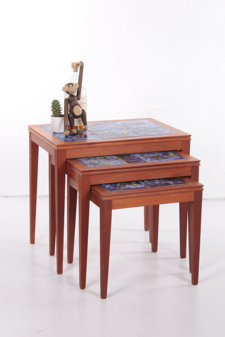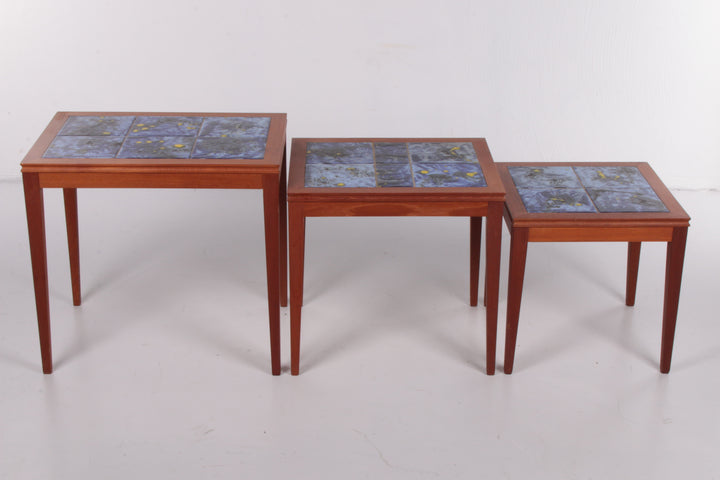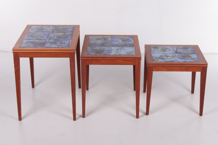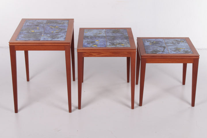 Vintage Danish Nesting Tables with Blue Ceramic Tiles