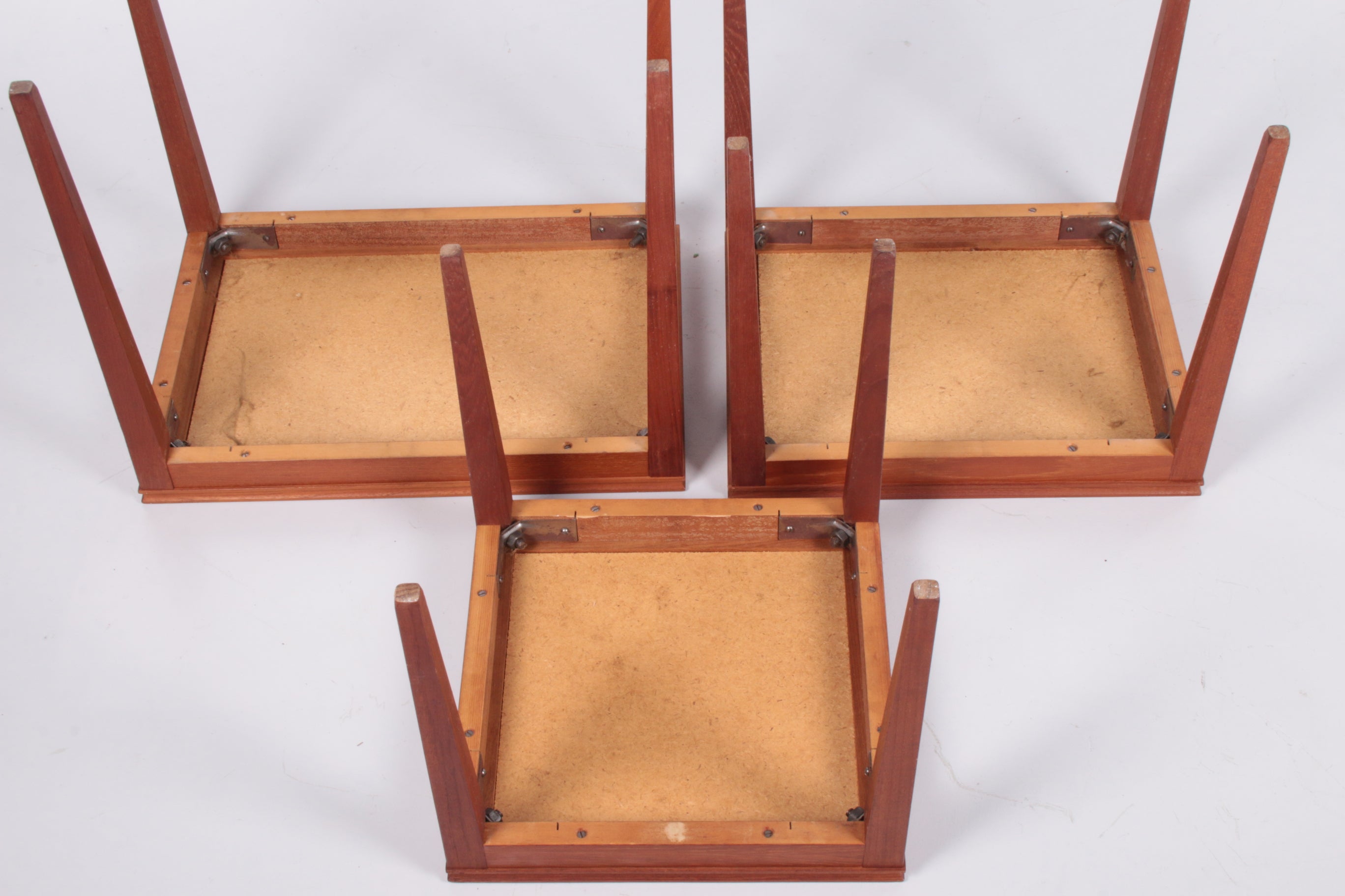 Discover the charm of the 1960s with this exquisite set of three nesting tables from Denmark. Crafted with a rich teak wood frame, these tables boast a deep brown hue that exudes warmth and elegance. The tabletop is adorned with stunning blue ceramic tiles in various shades, offering a unique and eye-catching design that will elevate any living space. Perfect for those who appreciate both style and functionality, these tables can be effortlessly nested together to save space or separated to provide additional surfaces when needed. Whether you're hosting guests or enjoying a quiet evening at home, these tables are a versatile addition to your decor.