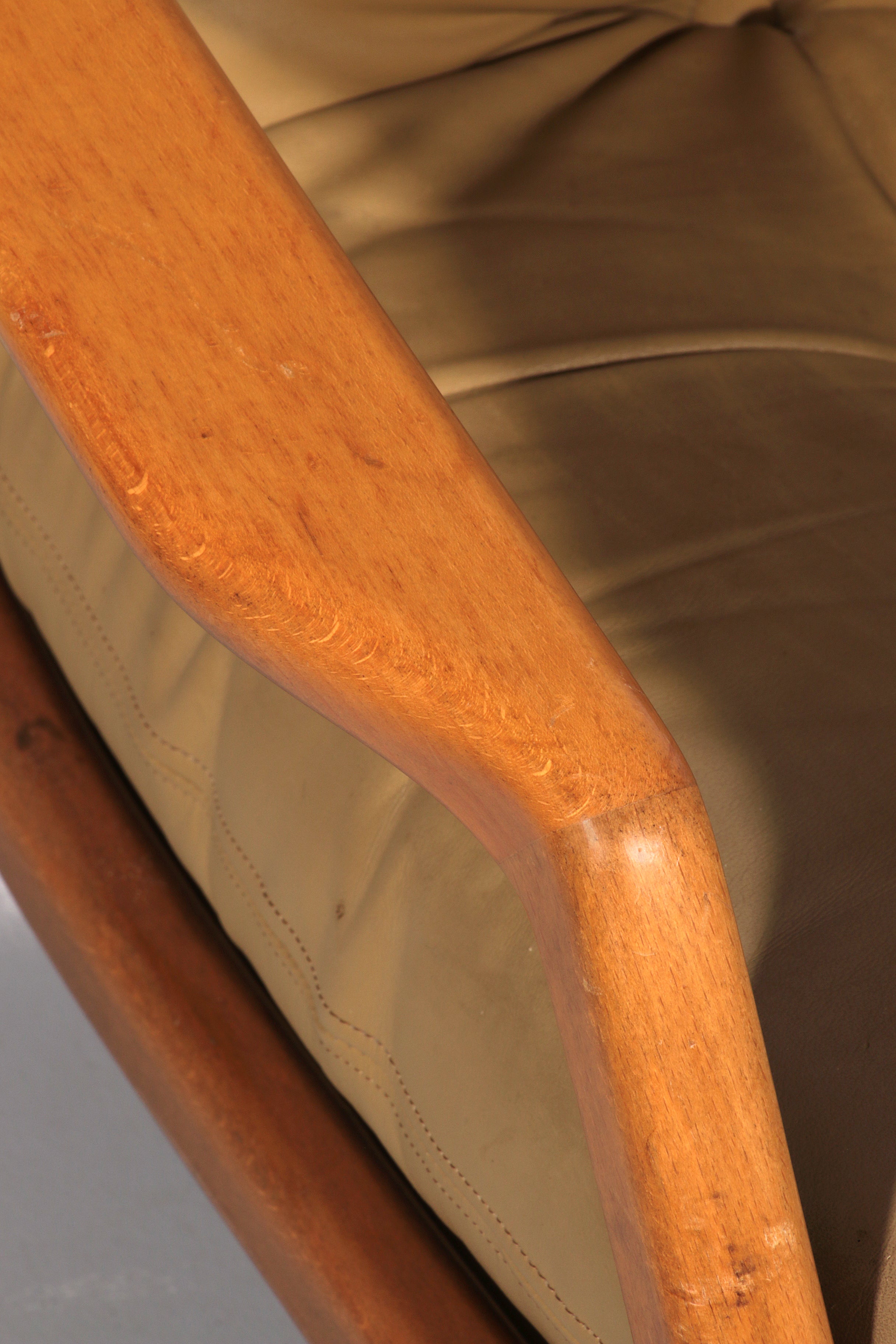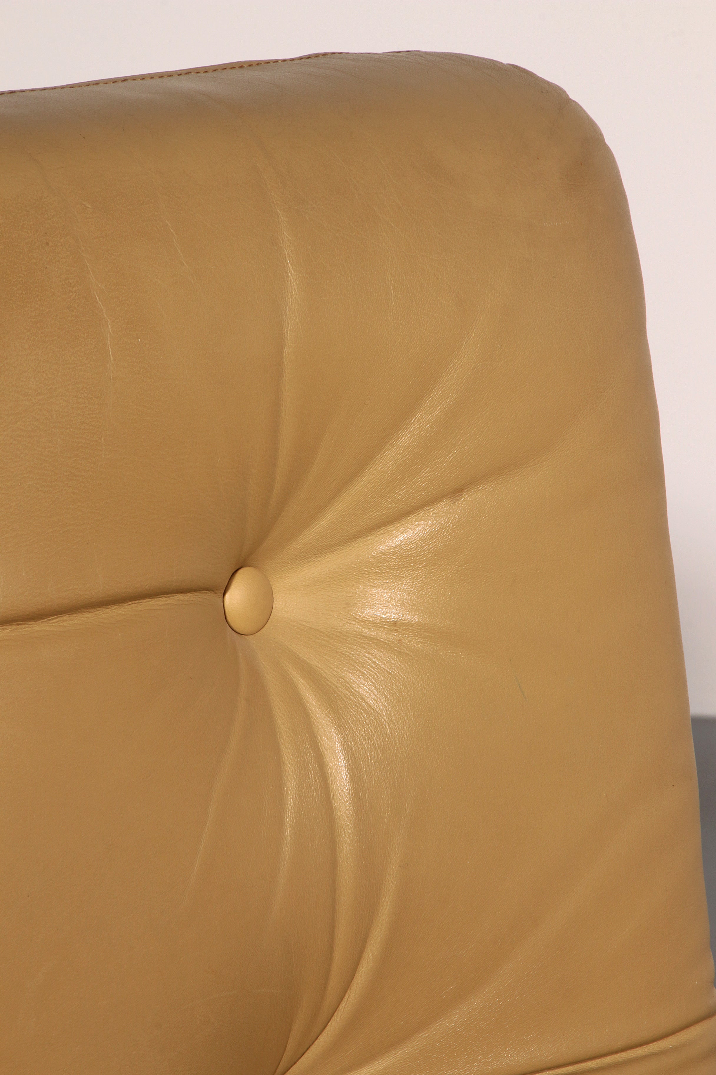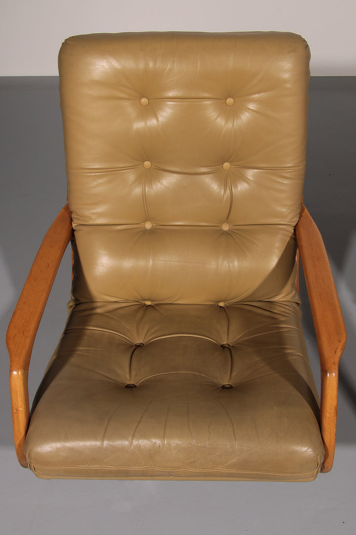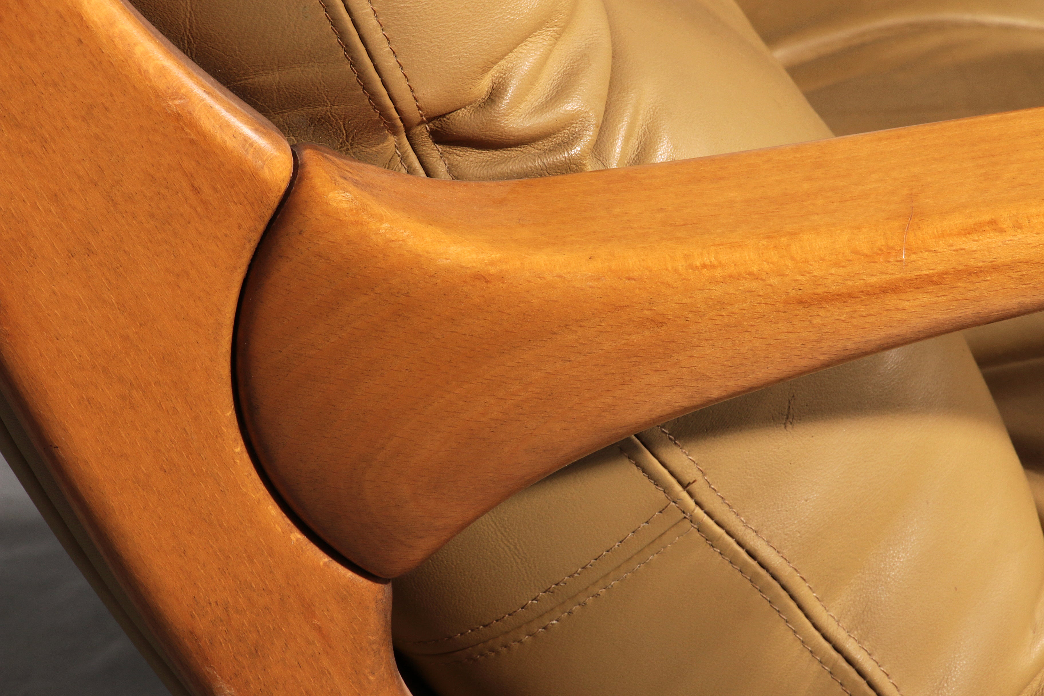 Designed by renowned German architect Eugen Schmidt in the 1960s, this rare pair of lounge chairs showcases the refined craftsmanship and thoughtful design Soloform is known for. Schmidt, who played a role in furnishing the Chancellor’s bungalow, brought his architectural eye to these pieces, blending clean lines with rich materials. The combination of supple leather seats and warm wood armrests offers a striking contrast, while the subtle patina and signs of use add character and authenticity. These chairs not only reflect an era of exceptional design but also remain highly functional, with a comfortable seat and swivel base that suits any modern or vintage interior.