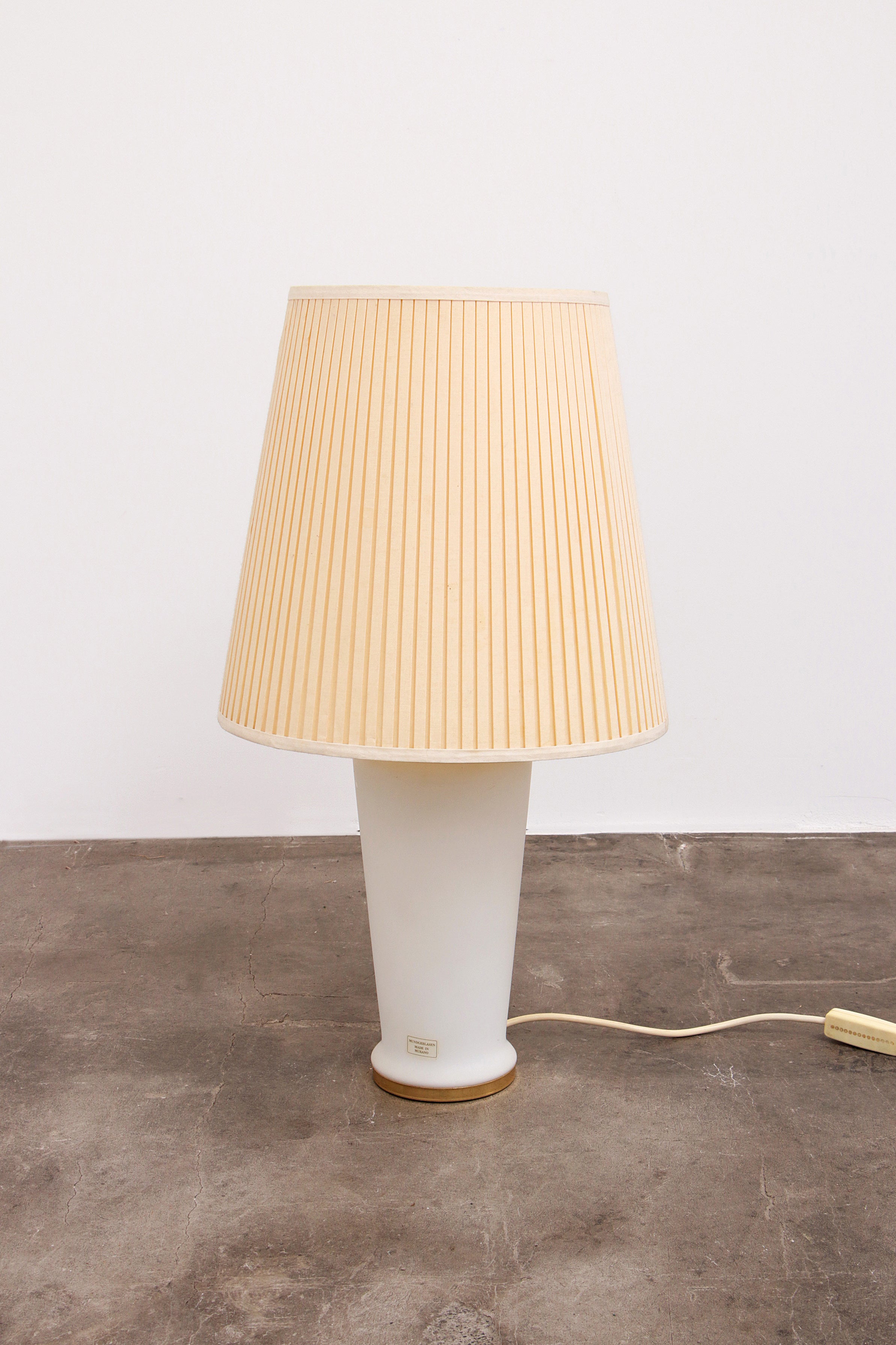 Discover the allure of the 1970s with this elegant white glass table lamp, seamlessly blending into the timeless Hollywood Regency style. This German-crafted lamp, adorned with a subtle gold trim, adds a touch of glamour to any interior. More than just a light source, it is a piece of art, featuring mouth-blown Murano glass. The unique pleated fabric shade diffuses a soft, ambient light, while the dual E27 sockets provide optimal lighting control. Whether you're reading a book or hosting a cozy evening, this table lamp creates the perfect atmosphere.