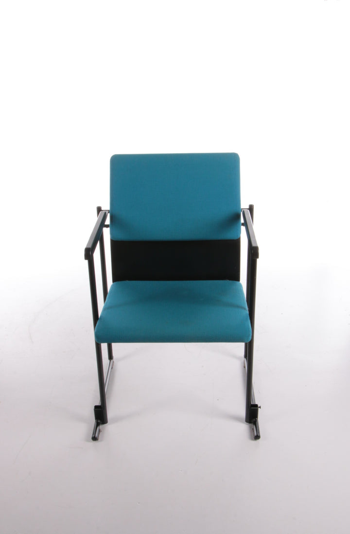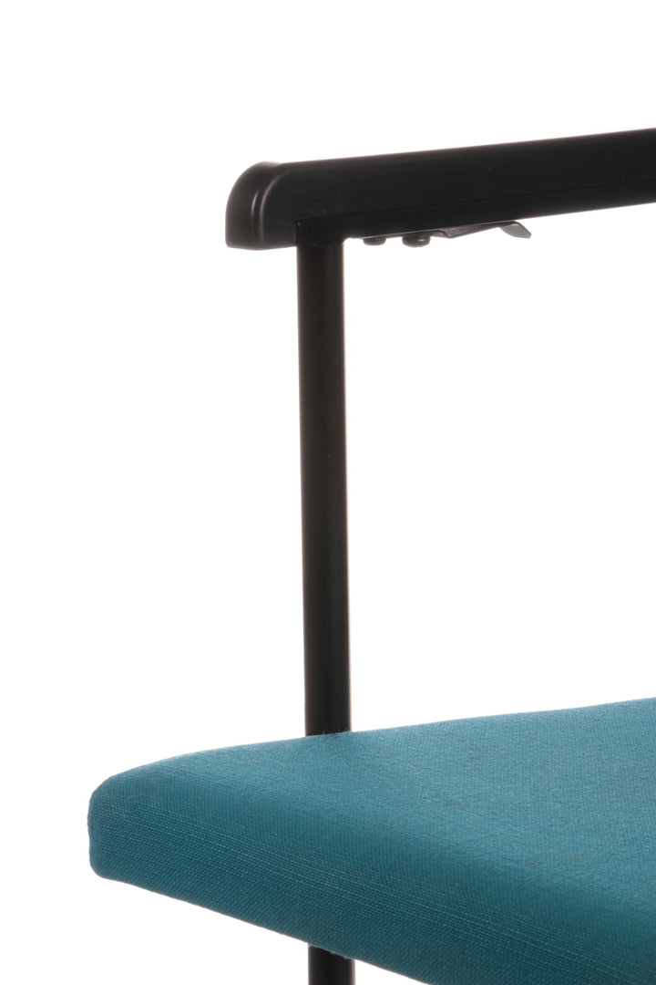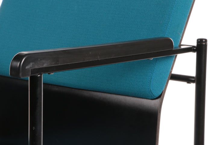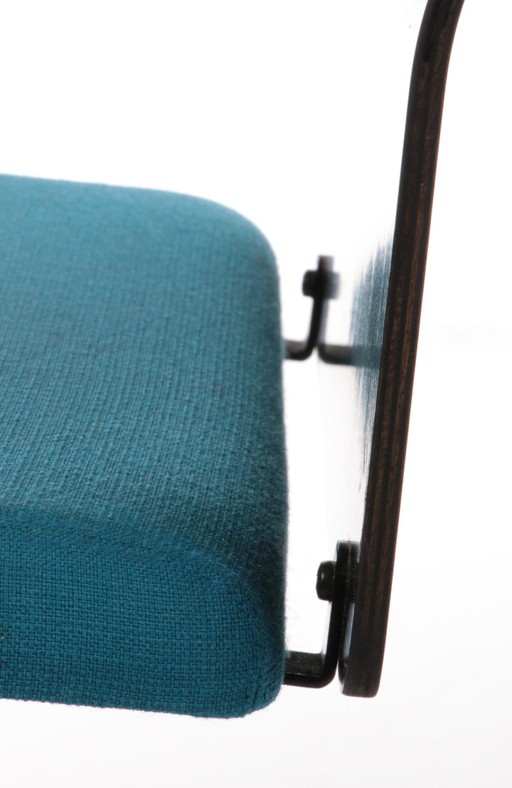 This beautiful fabric dining chair, designed by Yrjö Kukkapuro and produced by Avarte in Finland in 1970, showcases a harmonious blend of style and comfort. The backrest features a wooden plank with a plush fabric cushion, while the seat is also upholstered in high-quality fabric. The armrests are elegantly finished in black, adding a sophisticated touch to the overall design. The cushions are in a striking petrol color, enhancing the chair's visual appeal.