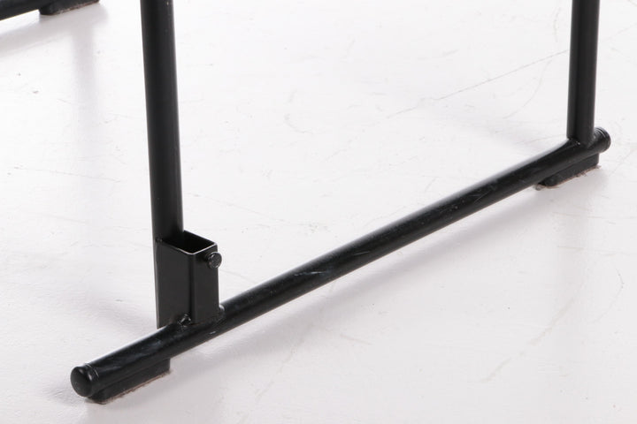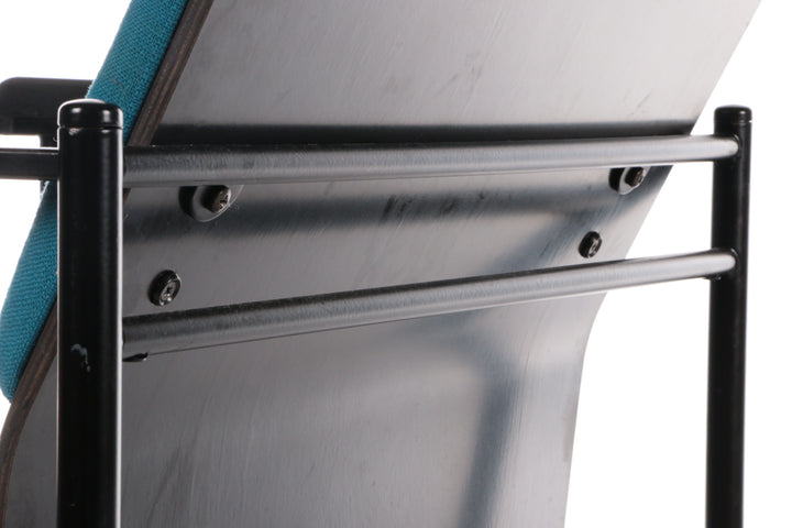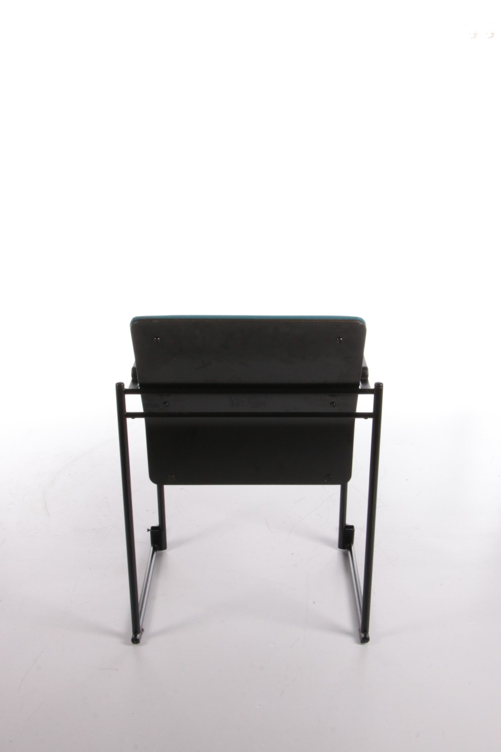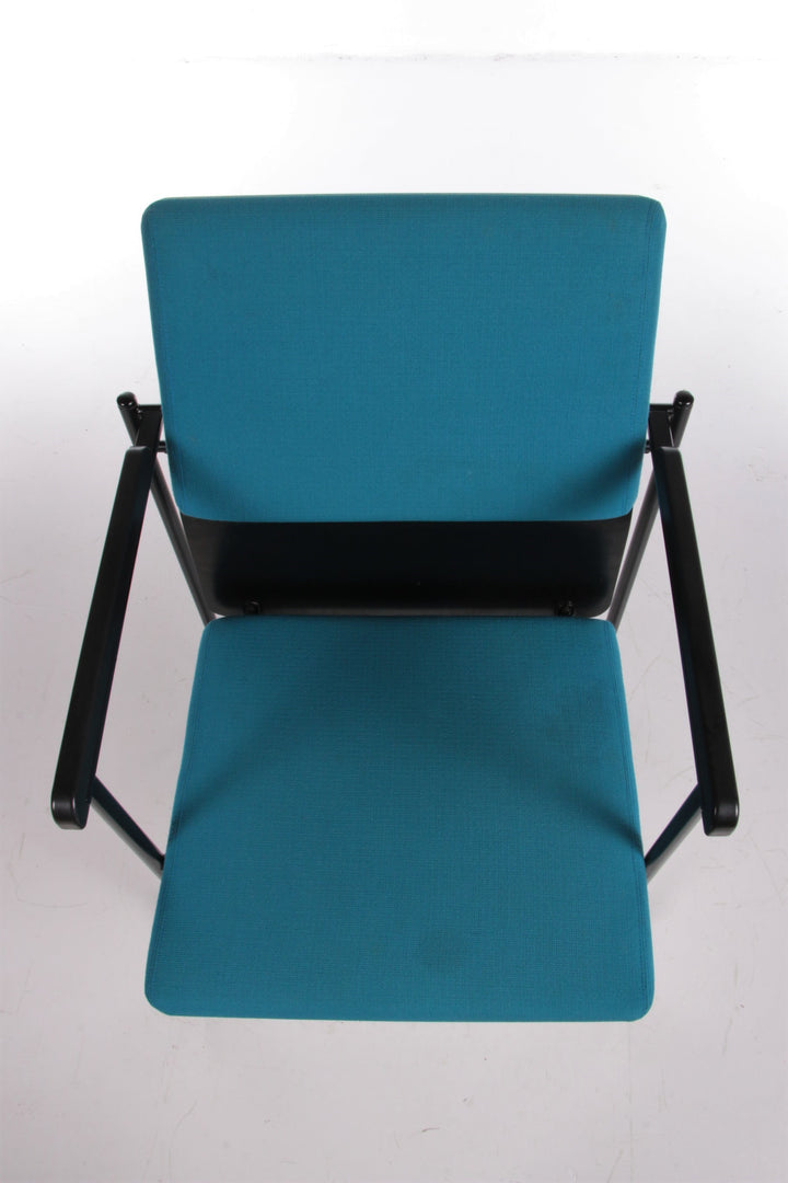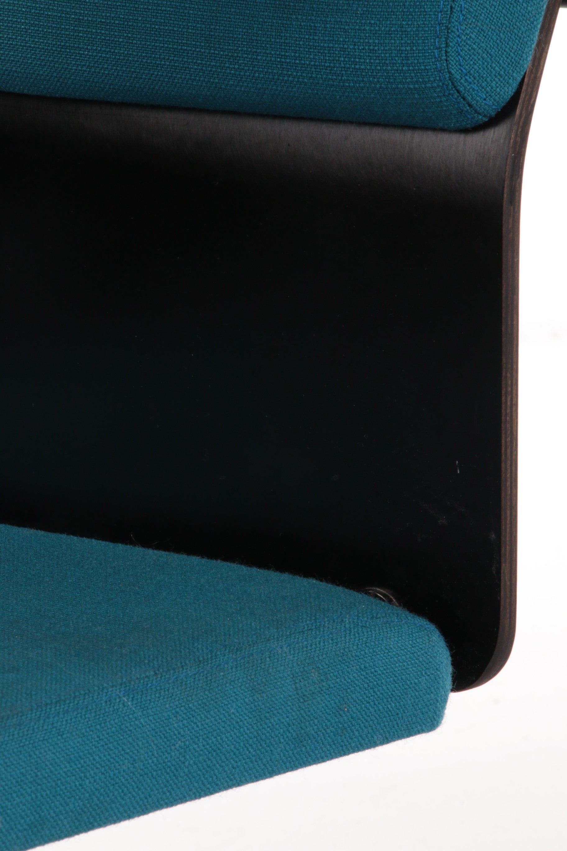 This beautiful fabric dining chair, designed by Yrjö Kukkapuro and produced by Avarte in Finland in 1970, showcases a harmonious blend of style and comfort. The backrest features a wooden plank with a plush fabric cushion, while the seat is also upholstered in high-quality fabric. The armrests are elegantly finished in black, adding a sophisticated touch to the overall design. The cushions are in a striking petrol color, enhancing the chair's visual appeal.