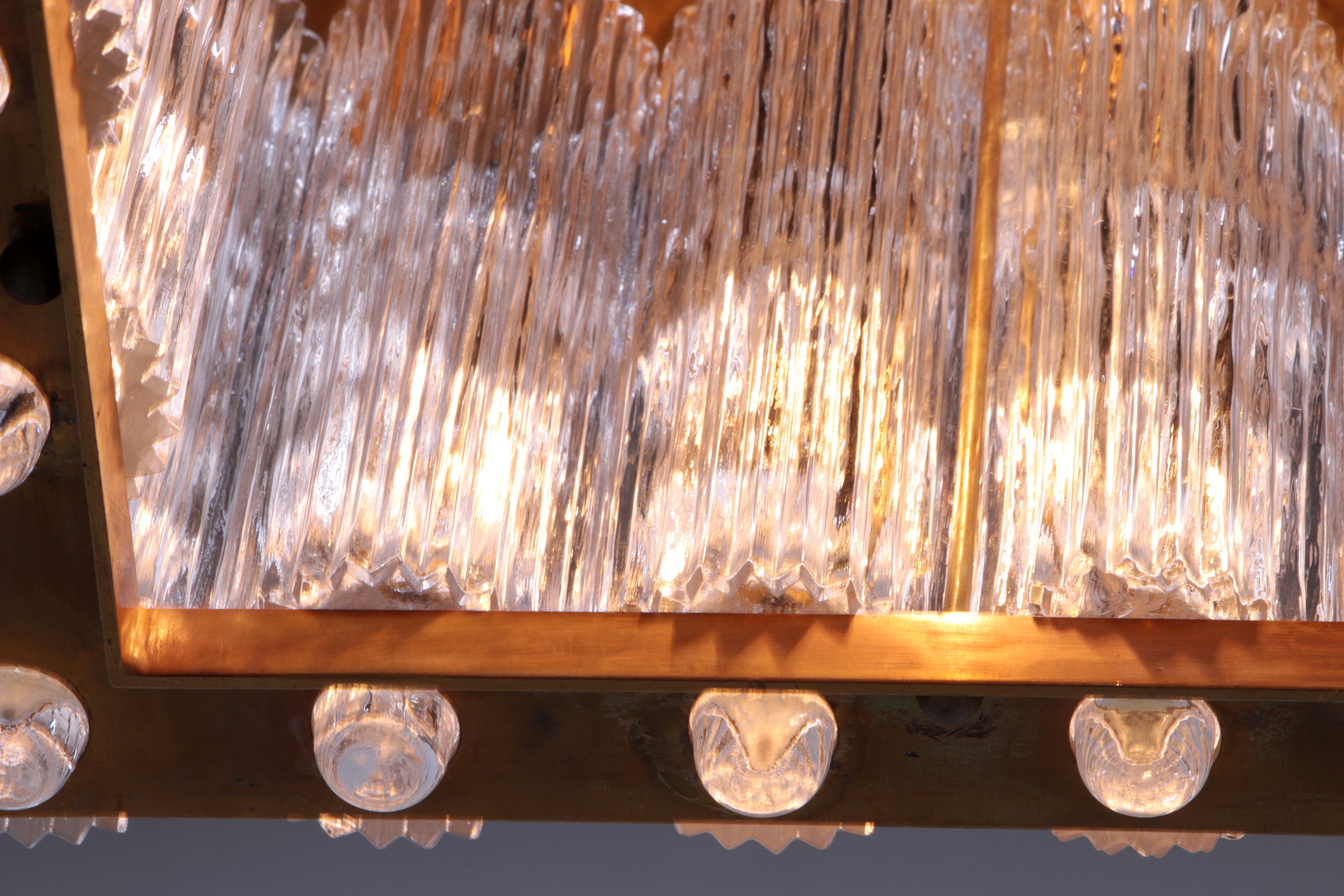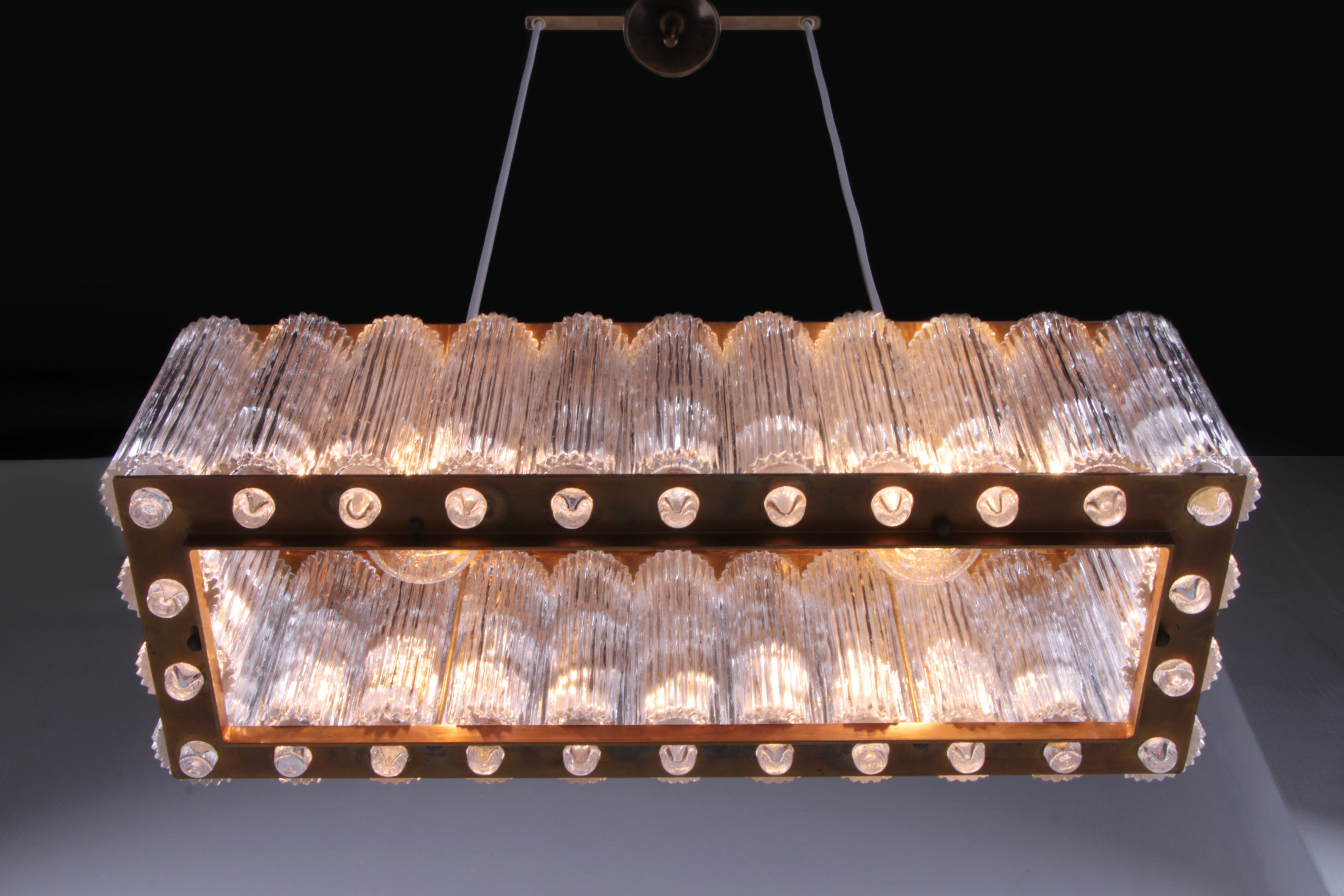 Fantastic ceiling lamp/chandelier "Nordlys", by Erik Wärnå for the Danish Kemp & Lauritzen, 1960s. NORDLYS means Northern Lights in Danish or Aurora Borealis in Latin. This powerful light phenomenon around the polar regions of the earth was the source of inspiration for Eric Wärnås when he designed the unique Nordlys lamp. That and the human desire for modernity and individuality. The lamp consists of 26 glass cylinders in fantastic fluted glass. The glass cylinders sit on a brass frame. At the top and bottom of the brass frame, the glass is recessed and beautiful small circles sparkle beautifully. The lamp shines beautifully shimmering through the glass and gives a warm luxurious tone in contrast to the illuminated brass. E27 bulb. The cord measures 92 cm. A beautifully designed brass copper cover covers the ceiling mount. The lamp is the best of Scandinavian design - the choice of materials and the beautiful design language